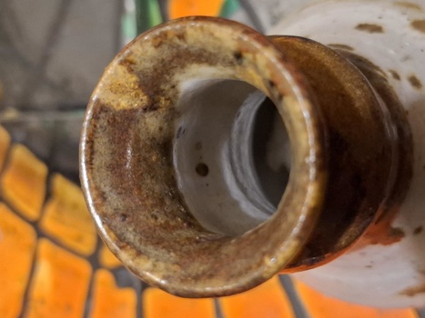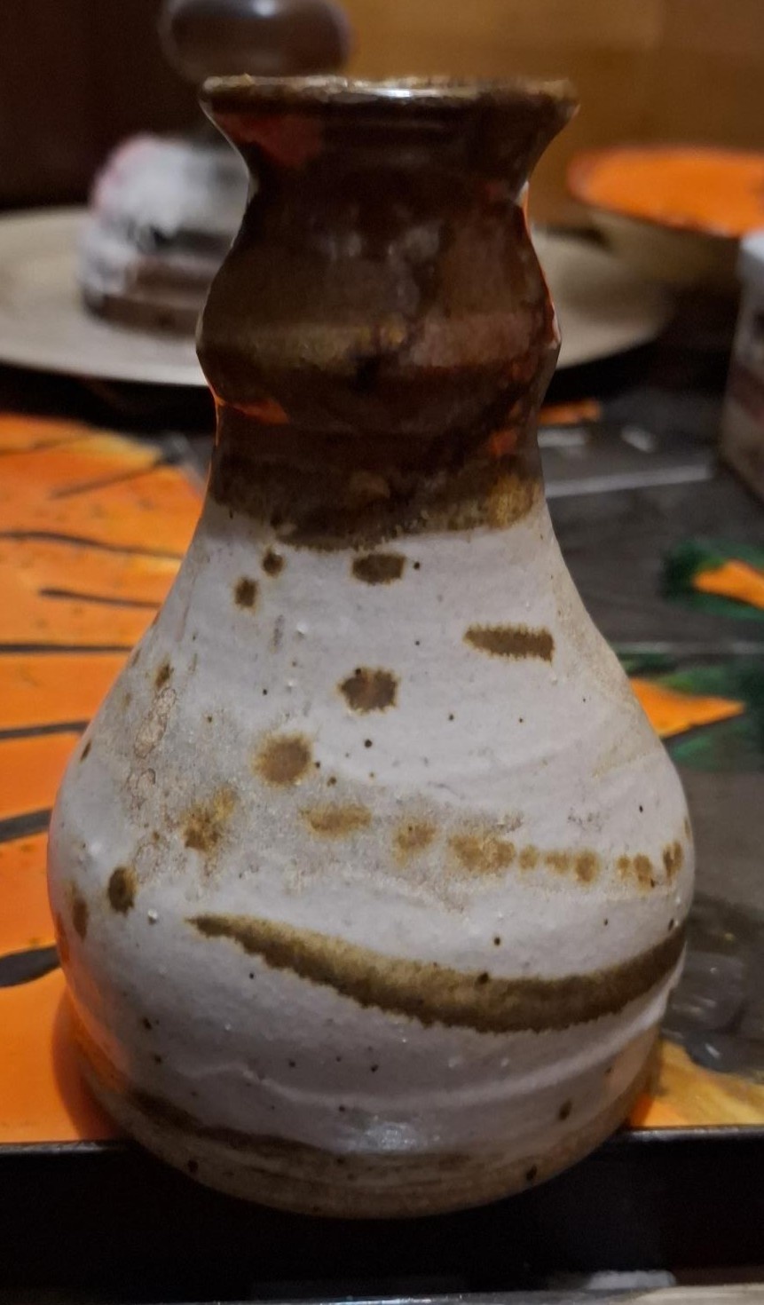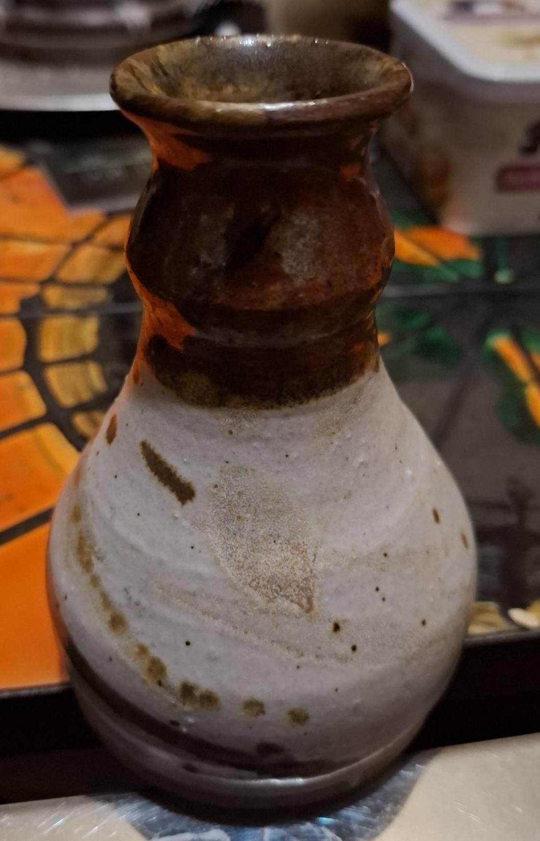 The vase itself is quite thick-walled and therefore quite heavy for its size. It's probably stoneware. As you can see, it has an irregular surface, and the glaze isn't very subtle.