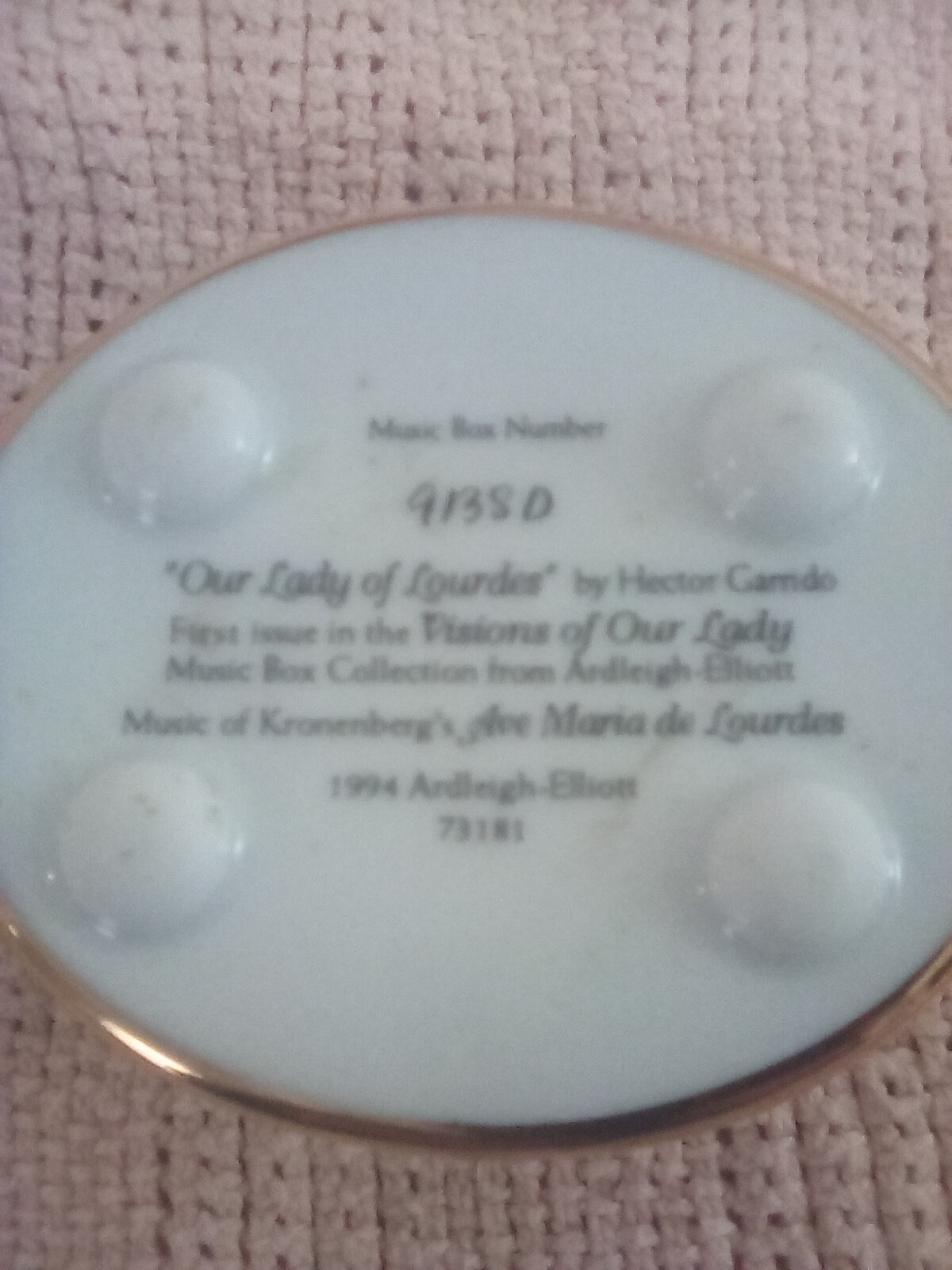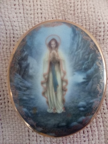 Four in. across porclin music box, lid painted Our Lady of Lourdes by Garrido. Velvet lining, wind up tune Ave Maria by Kronenberg. Ardleigh Elliott 1994