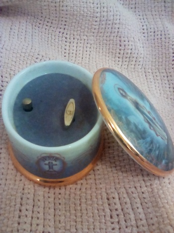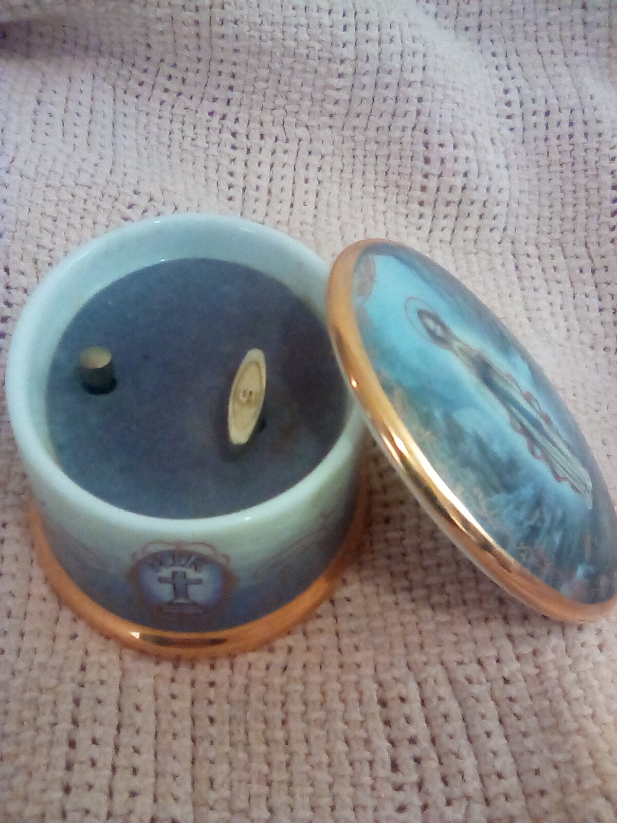 Beautiful Our Lady portrait on this music box, how meaningful at the holidays