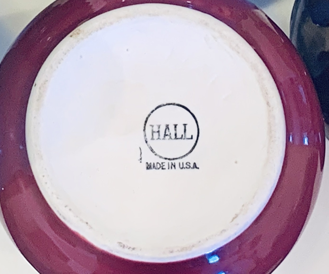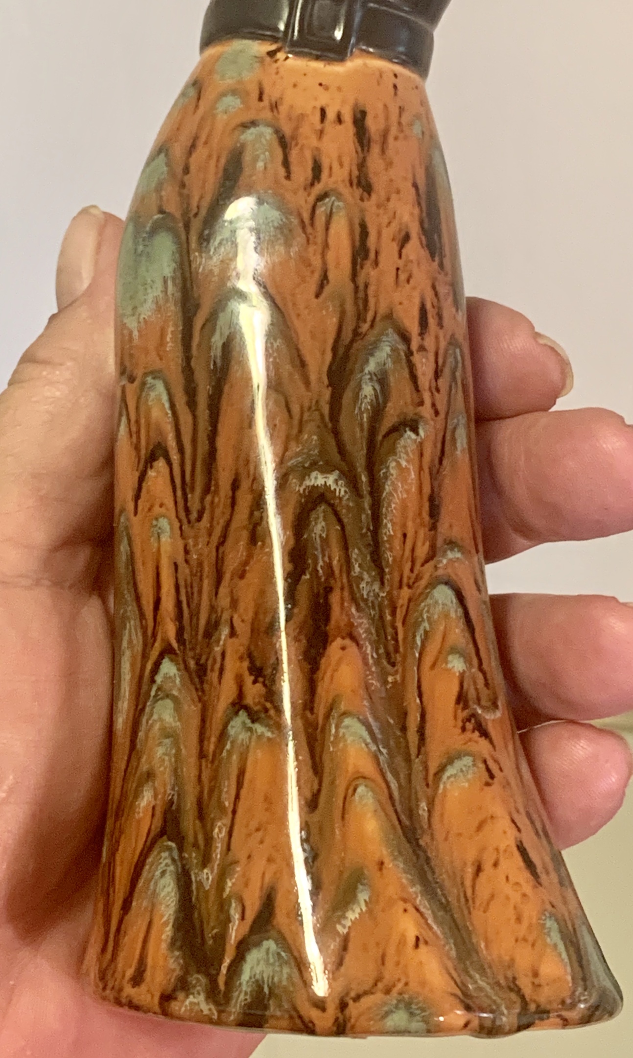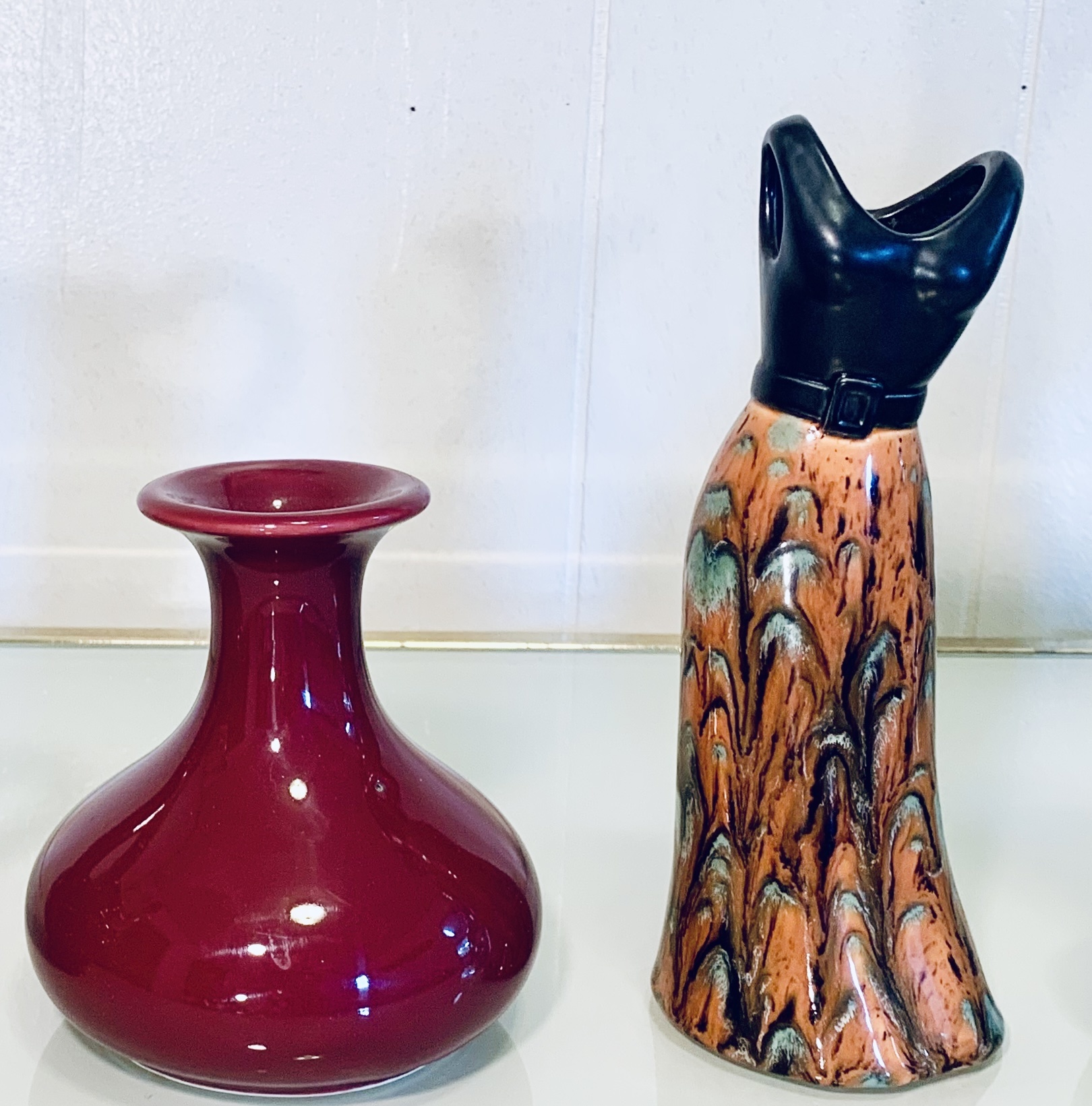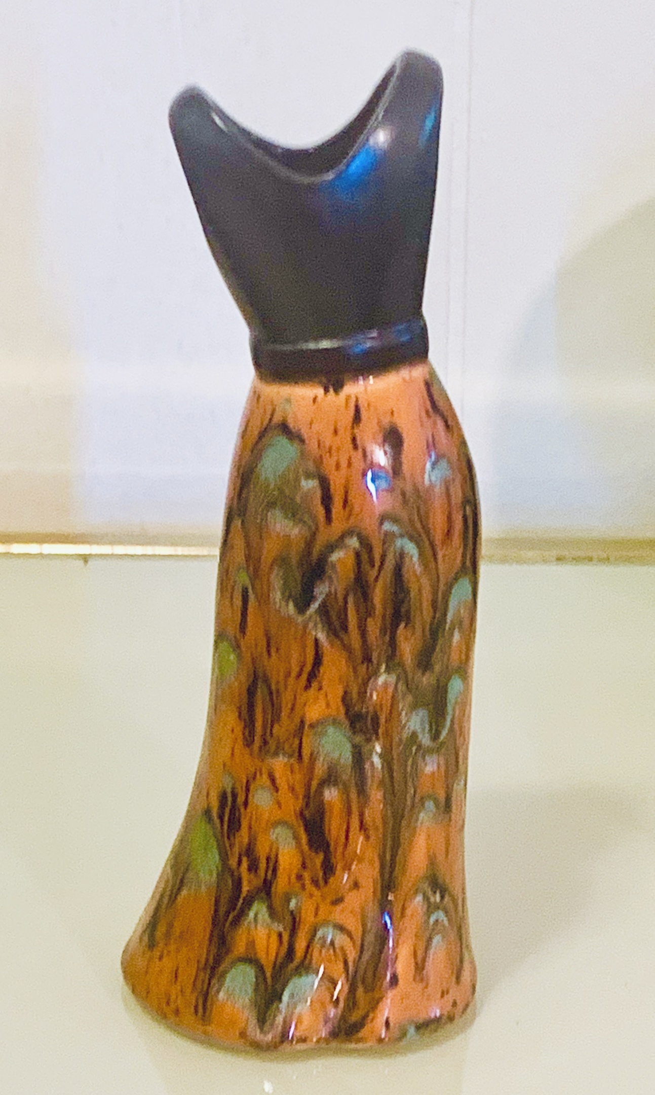 There’s quite a few of these 5” tall Hall #630 vases that’s hard in this deep red color.Out of all this pottery I have the ceramic dress vase is one of my favorites.Whoever applied the glaze in this pattern knew what they were doing.It’s a replica of the dress that a actress wore in the 1970’s.I know who it was that I’ll post later after I see if any of my CW friends knows who it was.The correct answer gets a lifetime of loves on anything you post.Thanks for looking.