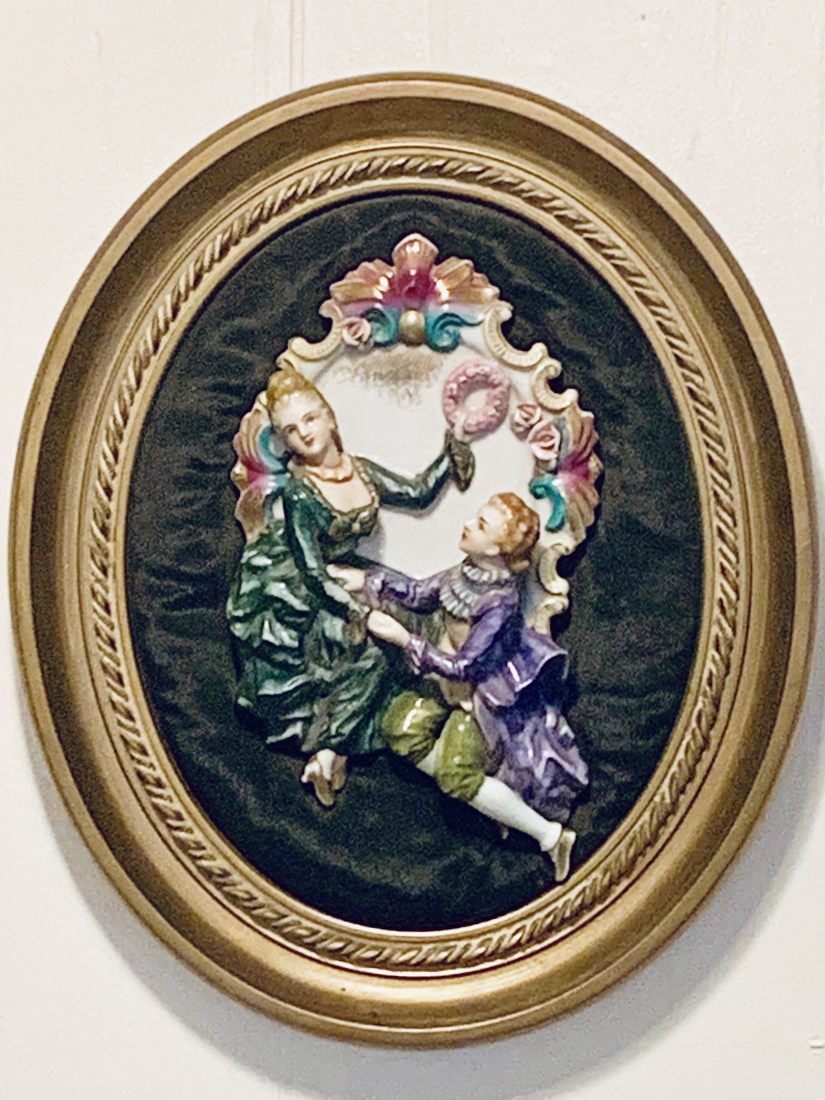 Your wife's courting couple capodimonte pieces are absolutely beautiful. The golden frame is well deserved, watch those fly balls :))