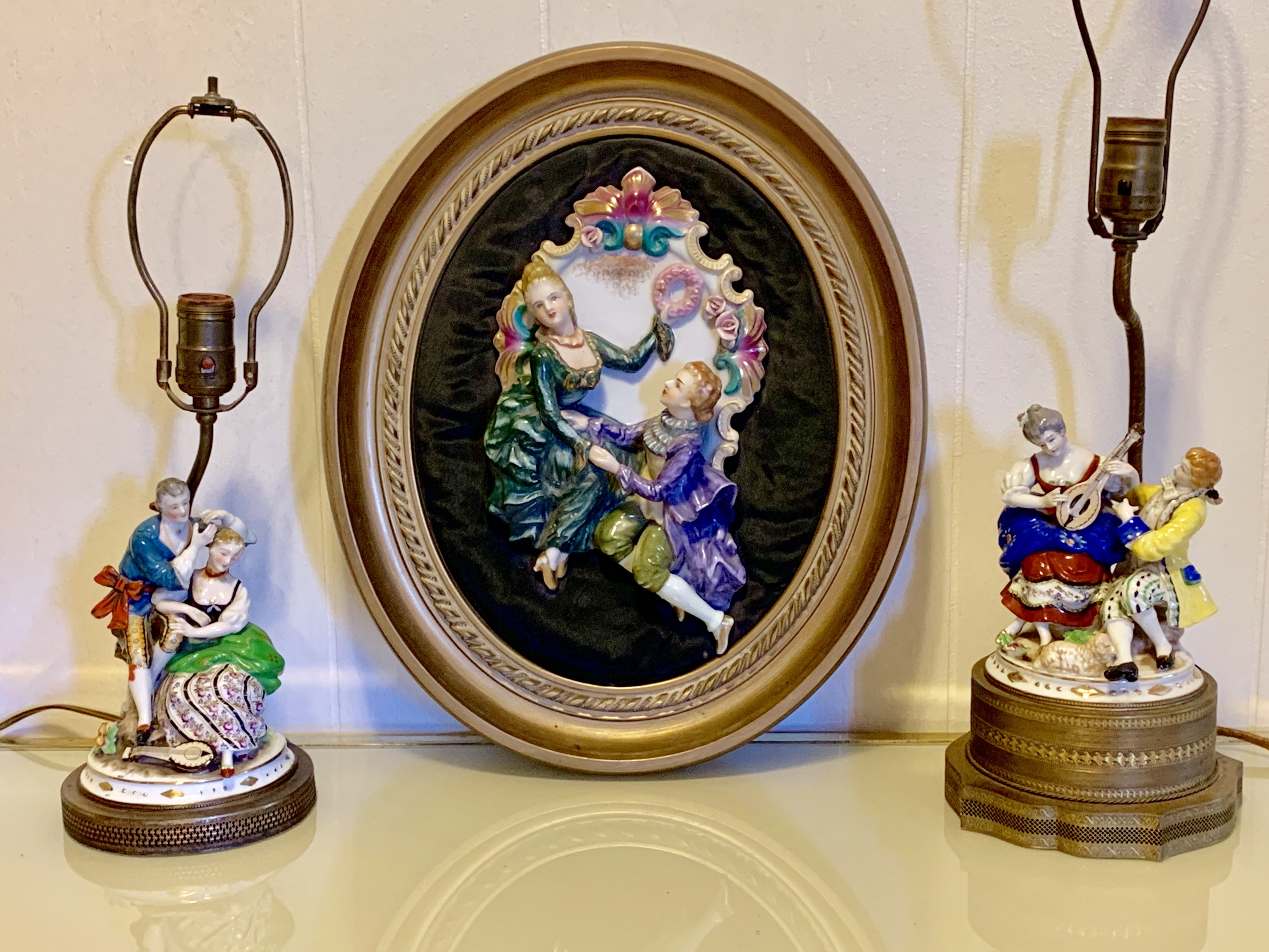 My wife had these antique Capodimonte lamps with one that’s old it still has paper covered wiring on a table with the wall plaque.My “friends” and I who all played baseball get together for a occasional fast pitch game with a catcher who doesn’t wear a mask.Nobody can throw a strike anyway so the winner is usually whoever is the last man standing after getting hit by so many pitches or it’s a tie if we run out of catchers. There’s plenty of room as our house is 300 feet away.What could go wrong ? My brother got a hold of pitch he hit it over 300 feet that went right through the picture window and broke the plaque.As you can see in the last photo my wife put my dome in the frame and then grabbed the bat and chased everyone off.Thanks for looking.