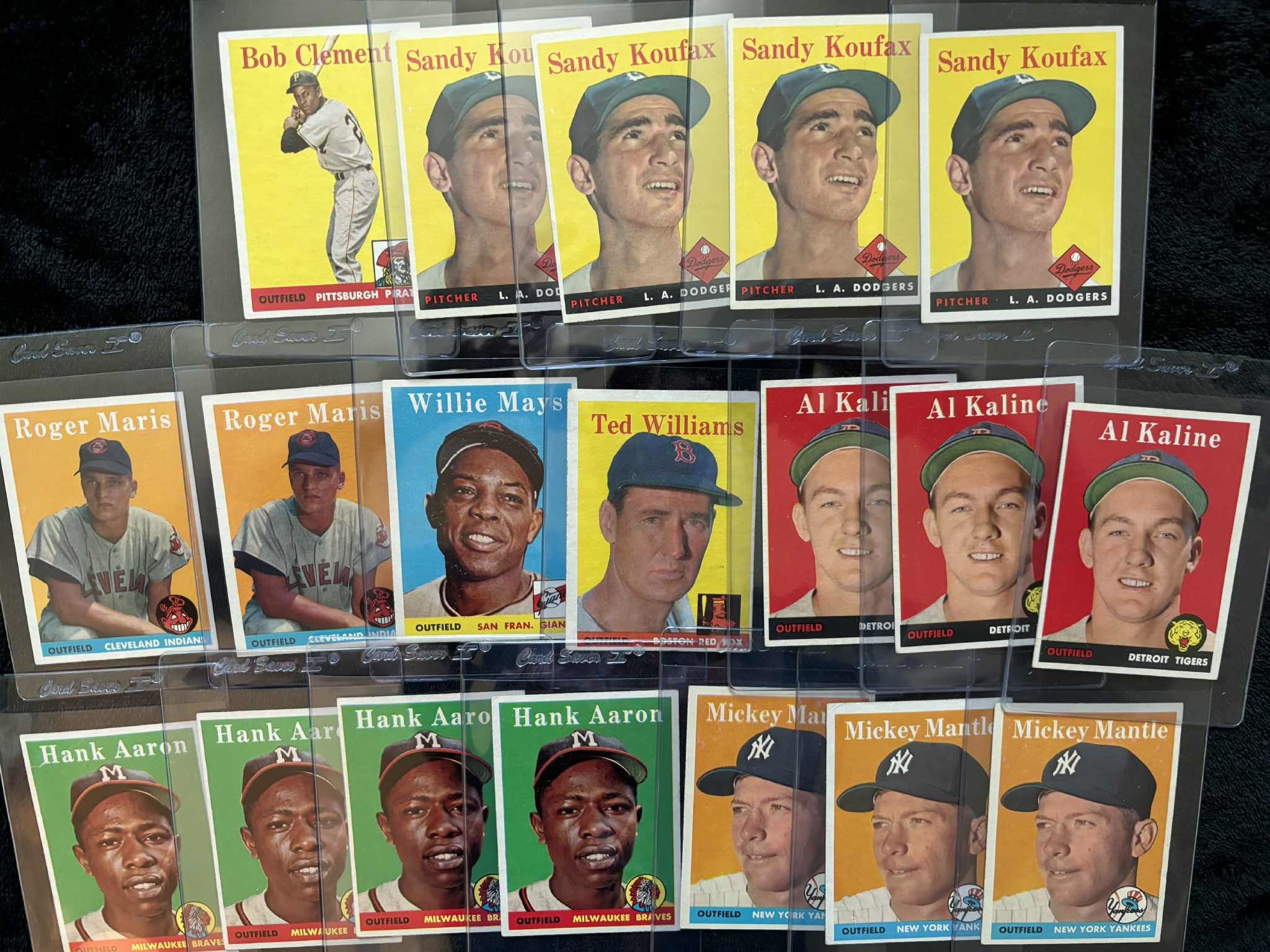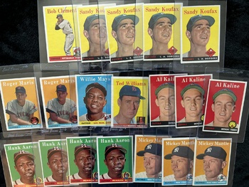 1958 Topps near set with lots of duplication: Mickey Mantle (3), Hank Aaron (4), Sandy Koufax (4), roger Maris RC (2), Willie Mays, Ted Williams, Al Kaline (3)