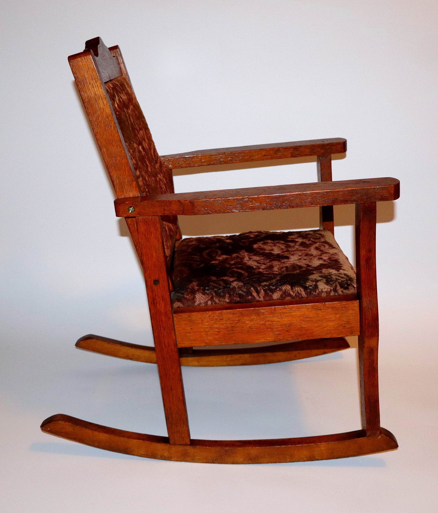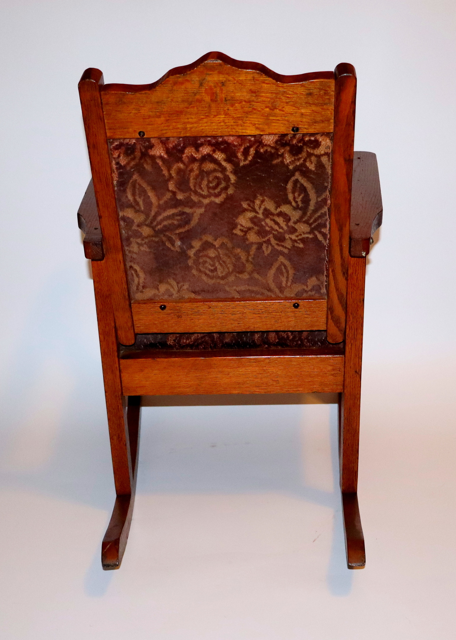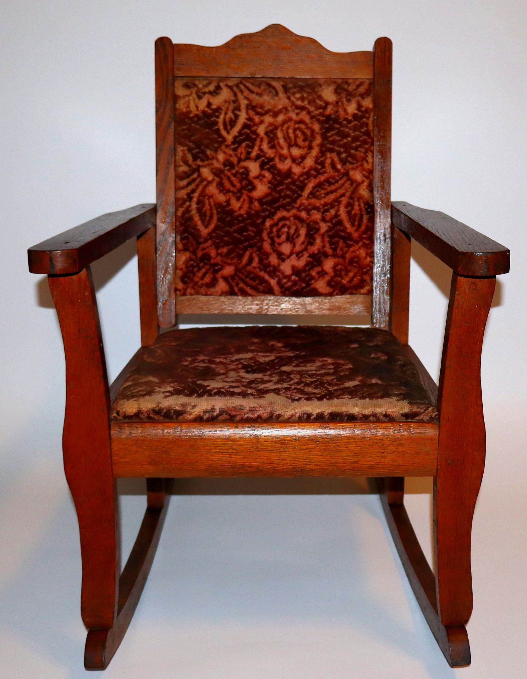 It's made of oak and the upholstery, though well worn, appears to be original (though I could be wrong about that). It's made incredibly well and has some heft to it. It’s in really amazing condition and the wood only needed a minor cleaning and polishing. It measures 24" tall, 16" wide and 21" deep. Since this is not my area of expertise, I'm hoping someone out there can help me put an approximate date on this little rocking chair.