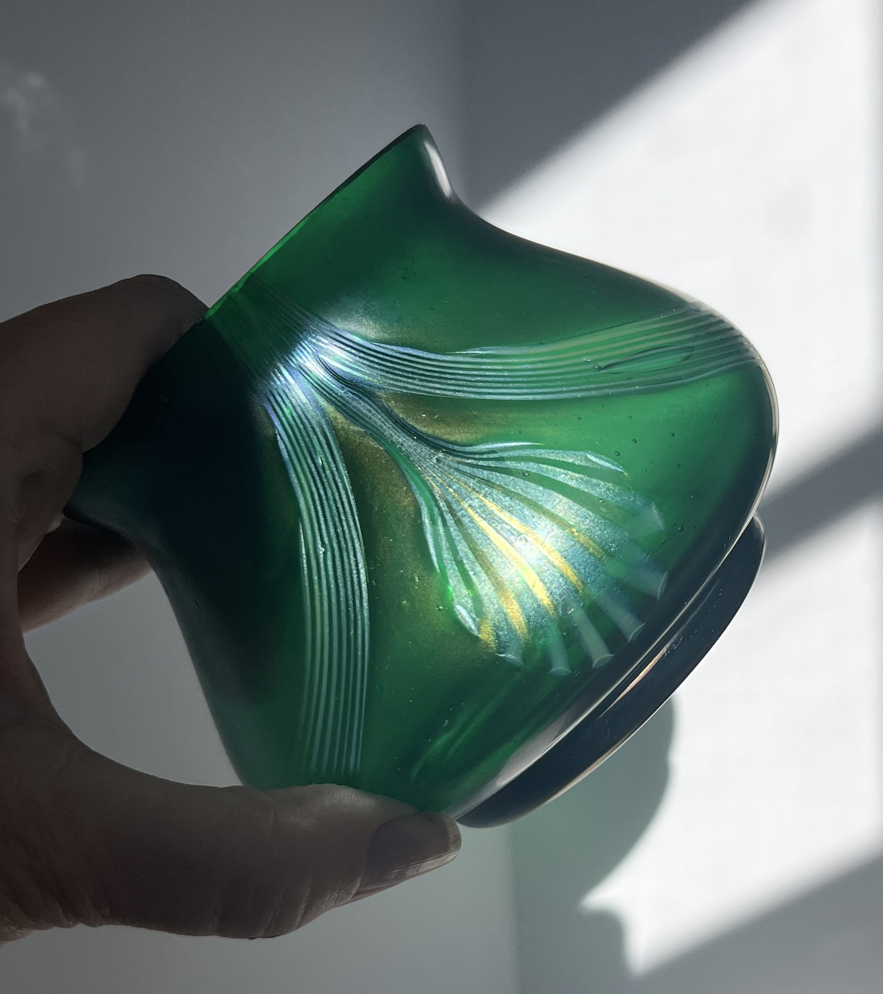 I was happy to have this piece delivered from the UK last week (Liverpool!) I originally believed that it was a late Loetz decor, but based on other’s input, I believe it was made by either Kralik or Poschinger. (Thanks all!) It is 3-3/4" tall.