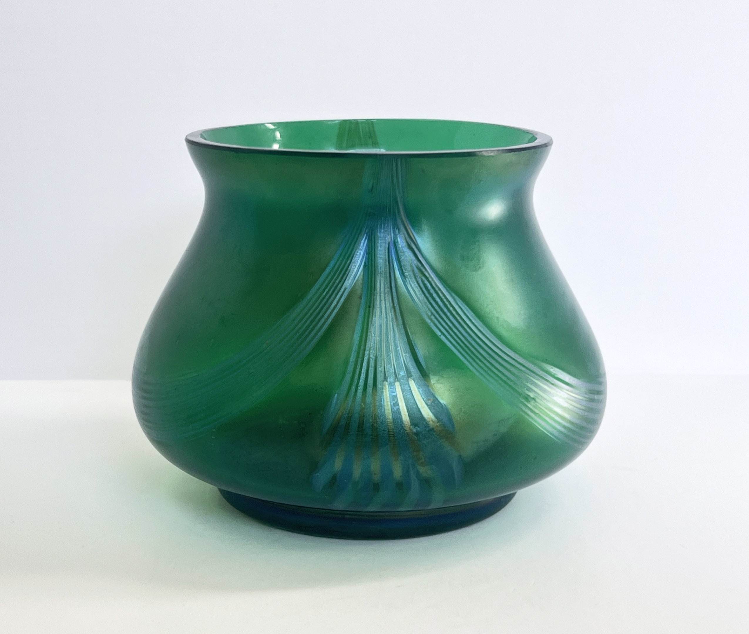 Beautiful piece. However, I think that this is not a product of the Loetz glassworks, but probably of the W. Kralik glassworks, from the period of about 1900-1910. Here is a link to a vase from my collection with this decor. Note the shape of the vase in the last photo. In the next comment I will give a link to a vase of this shape with a different decor, which according to the kralik website is a product of the W. Kralik glassworks. https://www.bohemianglass.org/katalog/vaza-combed-decor-1-4925/detail/