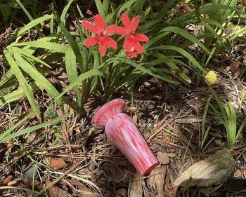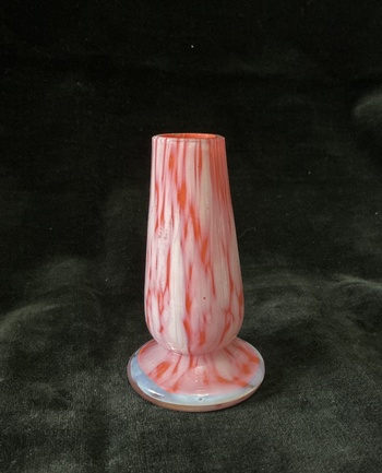 It is made from cased glass, clear over a greyish - white spatter, with a deep orange interior. For a small unit it has quite a presence & plenty of charm.