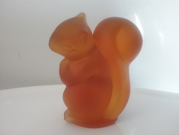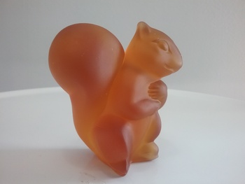 Here is a 3 1-4"H amber satin glass squirrel from Fostoria Glass of Ohio ca 60s-70s, their item sitting squirrel #2631/702. Also posted here in olive green