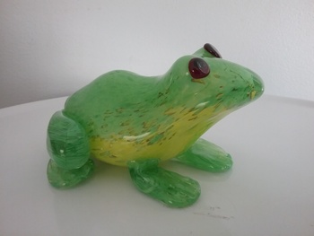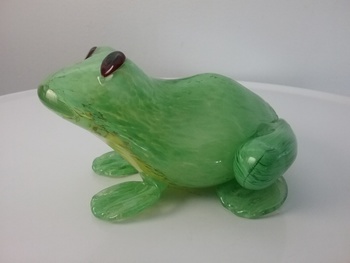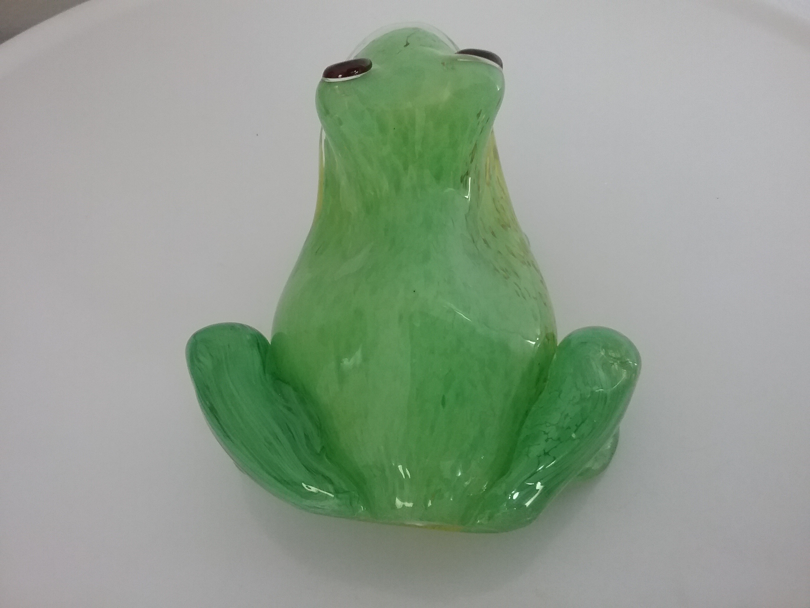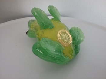 Here is a 4 1-2"W light green & yellow frog in a brushstroke pattern, with a pair of red-black eyes. By Dynasty Gallery Glass of San Francisco CA w/ original label on the bottom