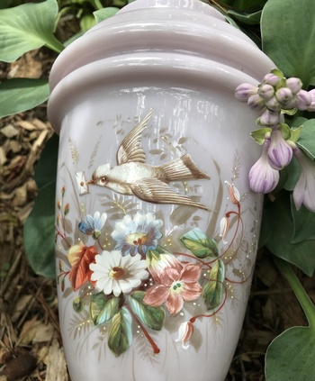 The vase is made from a single layer of opaque mauve opaline glass, with highly detailed enamel decoration of flowers with a letter carrying bird flying above. It measures 29 cm tall, 8 cm across the top rim, & 12 cm across the base, which is marked with a tiny red number 3.