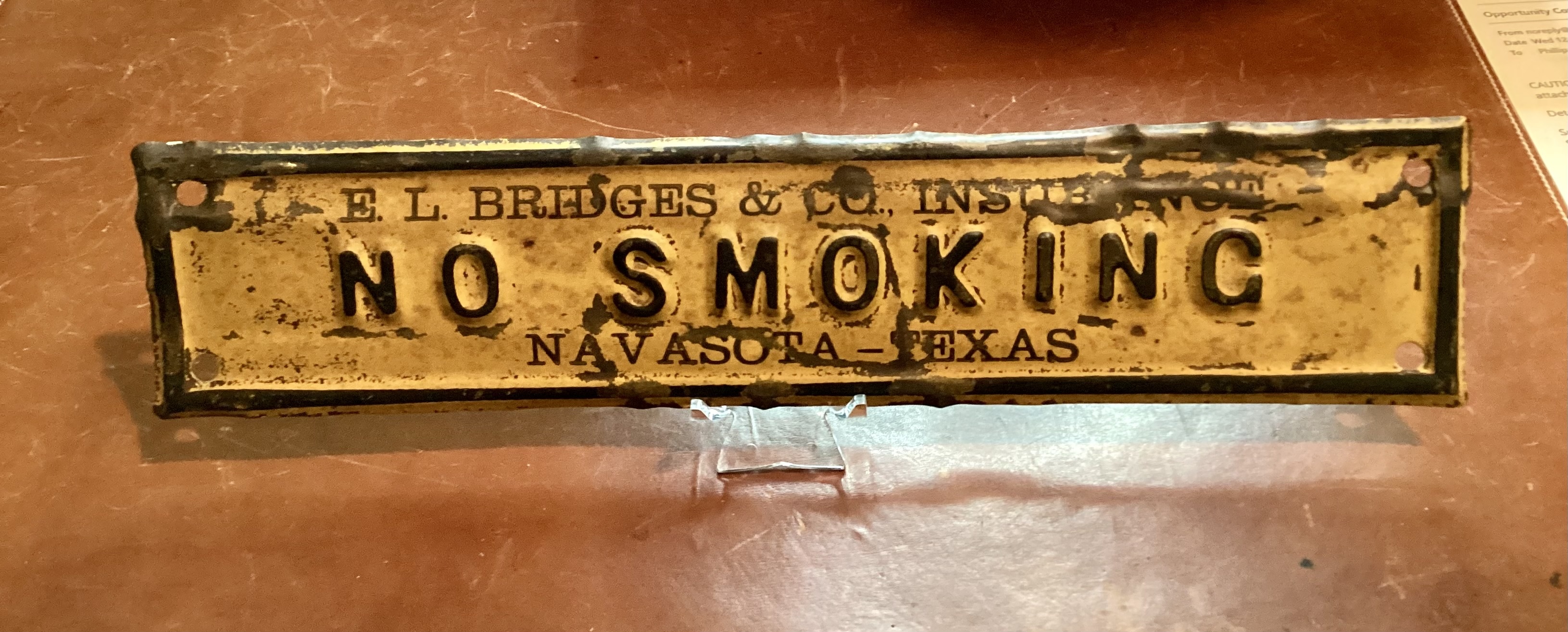 Wonderful old Painted Tin sign. E.L. Bridges & Co. Insurance “NO SMOKING” NAVASOTA - TEXAS