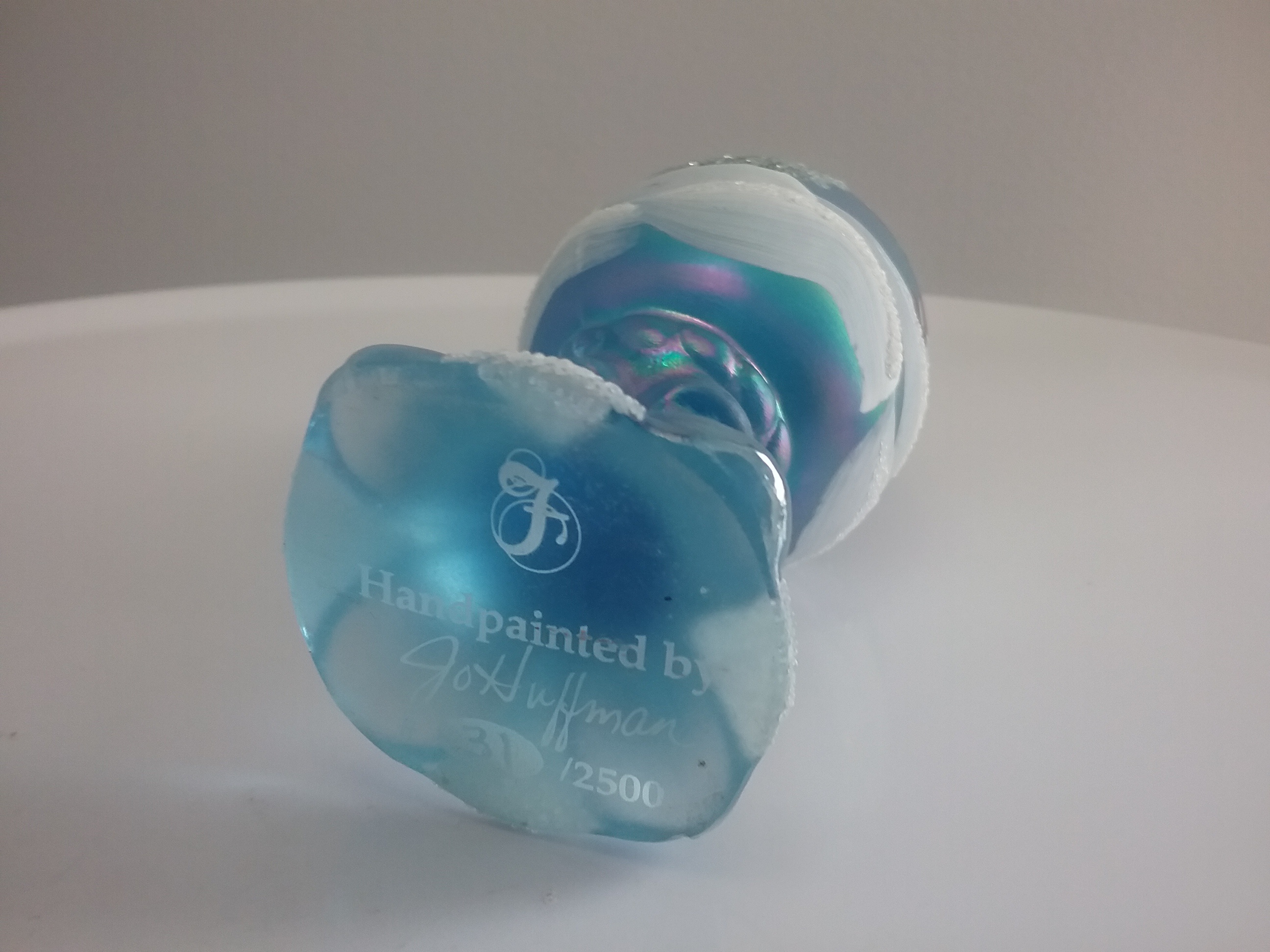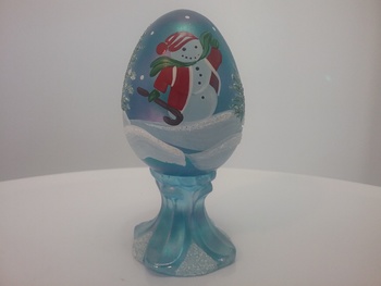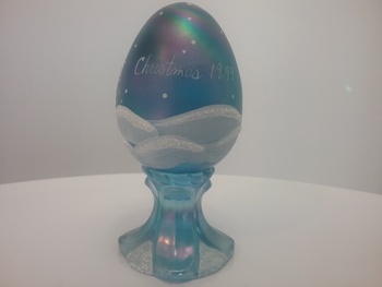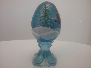 Here is a 4"H blue glass egg on a pedestal with handpainted scene of a snowman, pine trees, applied white glitter "snow" and the words Christmas 1999 on back. From Fenton Glass with painting by their glass artist Jo Huffman, signed on the bottom, and numbered 31 from a limited edition of 2500