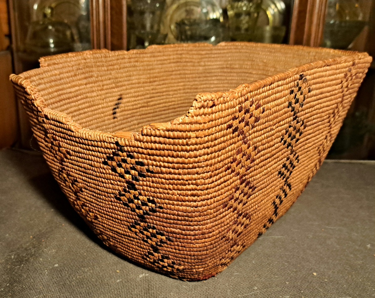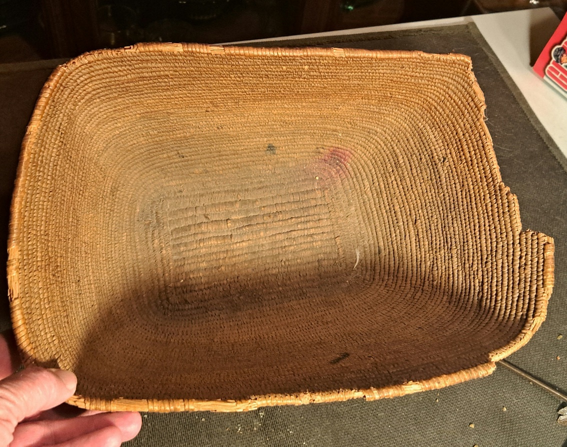 Sadly most of what I was told about this basket aside it is from 1930. Also it would be worth about $700 if not for the damage around the edges. I think it adds character myself. Dimensions are 13"l x 9"w x 7< deep. And hopefully that is enough text.