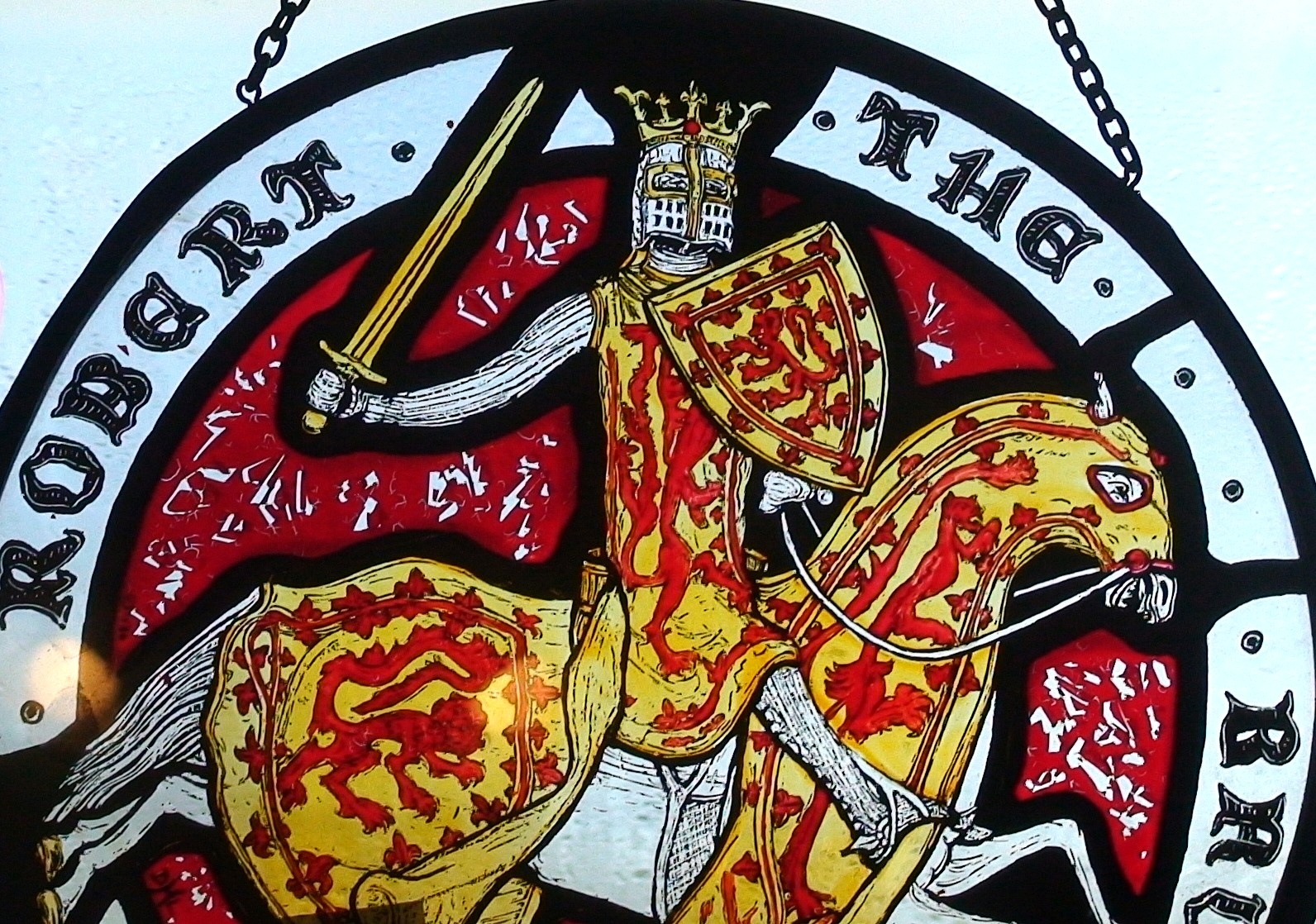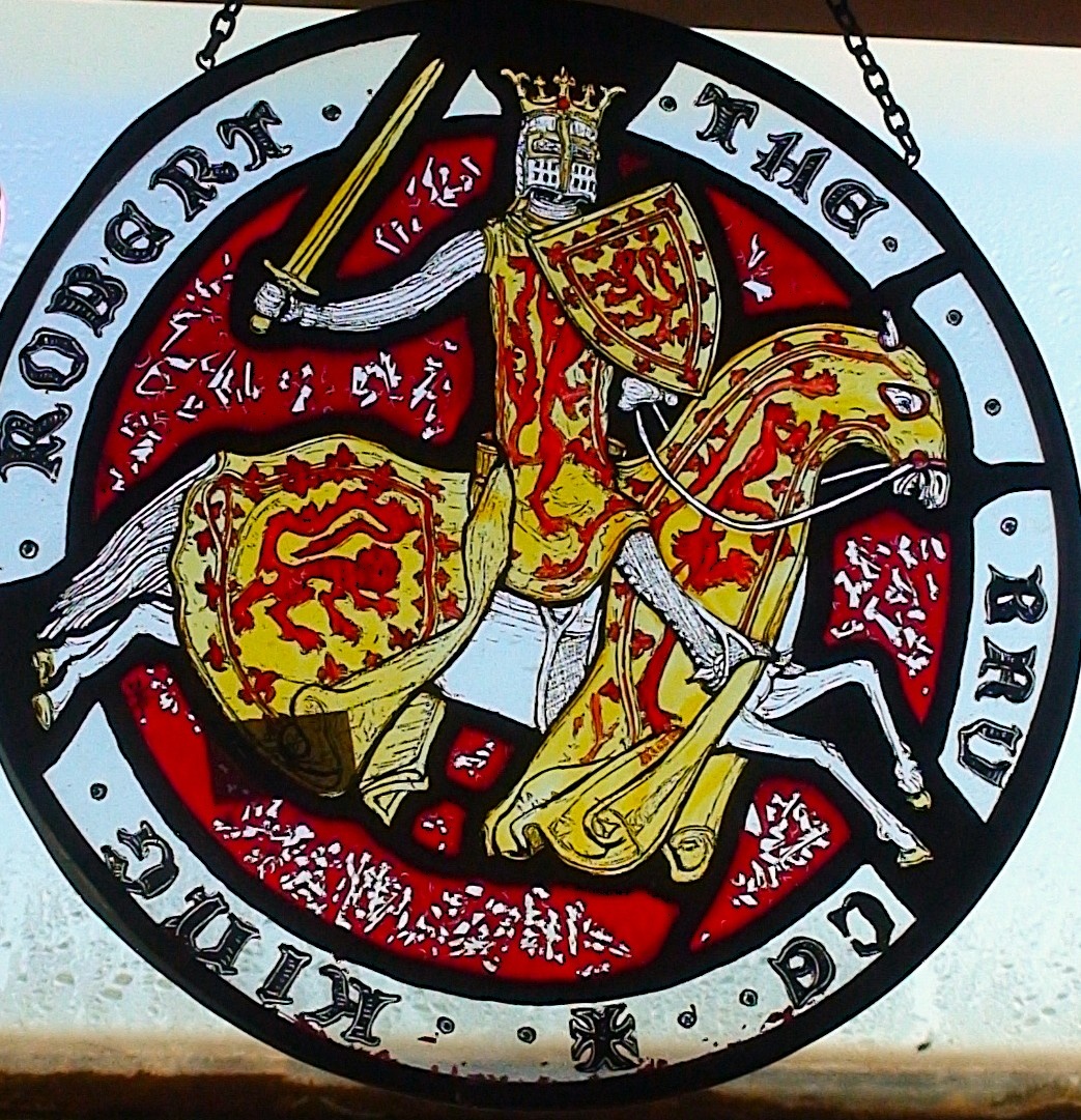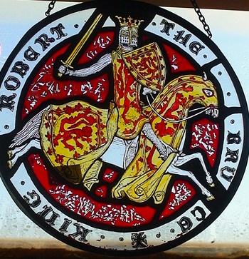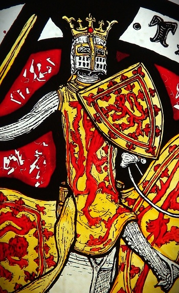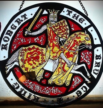 Colorful Hand-painted Stained Glass Celtic Window Panel of Robert the Bruce.