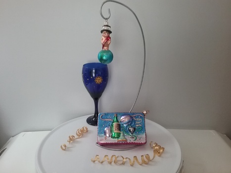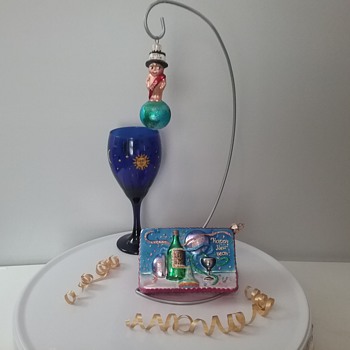 This little display shows my Christopher Radko millennium year 2000 ornaments, Baby New Year sitting on a globe, and a 5"W postcard design of assorted New Year celebratory items. Alongside a cobalt blue glass with moon, sun & stars painted on, from the Celestial Collection by Libbey Glass ca 1970s