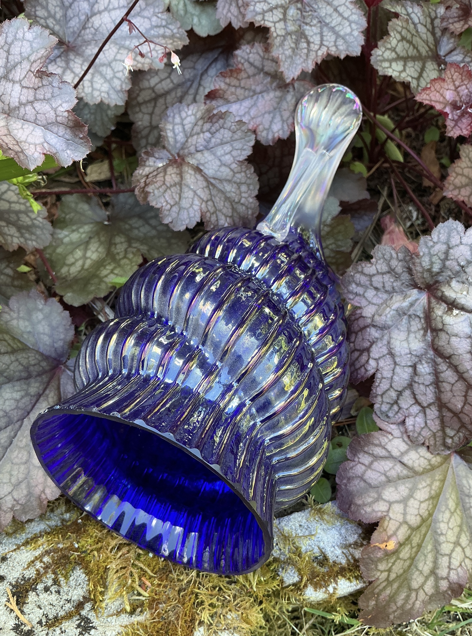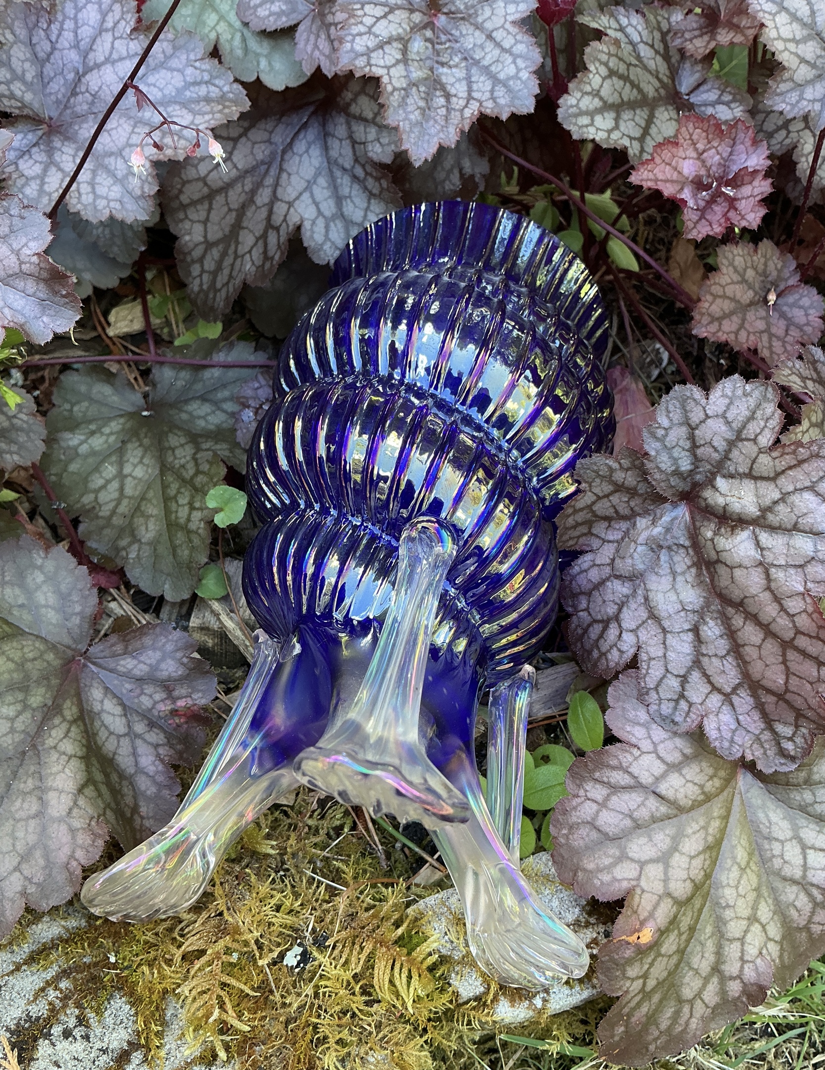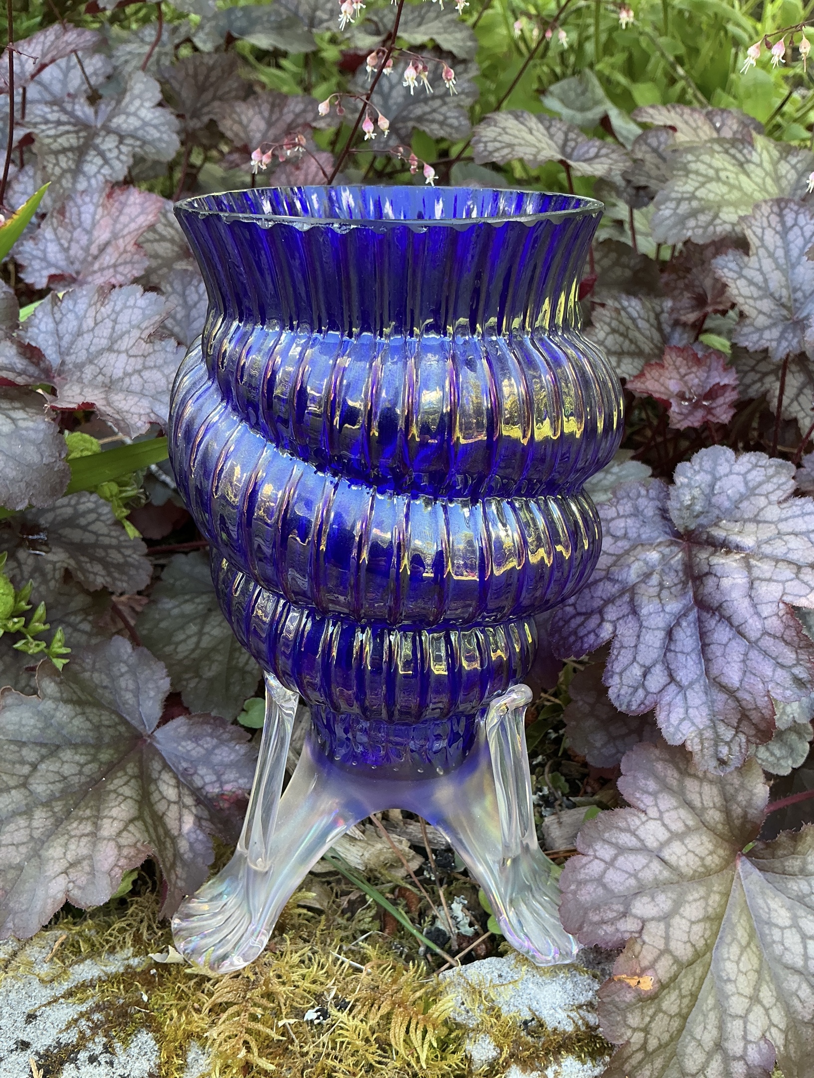This was a super find on eBay AU recently. I have a few of these types of shell vases by Kralik but not in this colour, a deep shade of cobalt blue which appears purple due to the intense iridescence. The vase also features a clear applied strutted base.