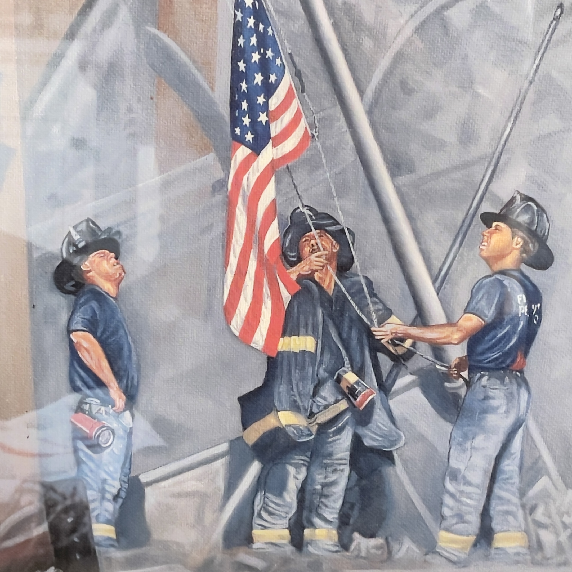 just another one of my finds i know this is the iconic picture of the world trade center raising the flag after 9/11 it looks like larry j calhoum number 85 not sure what the number 85 represents is it the fire house number or the station house