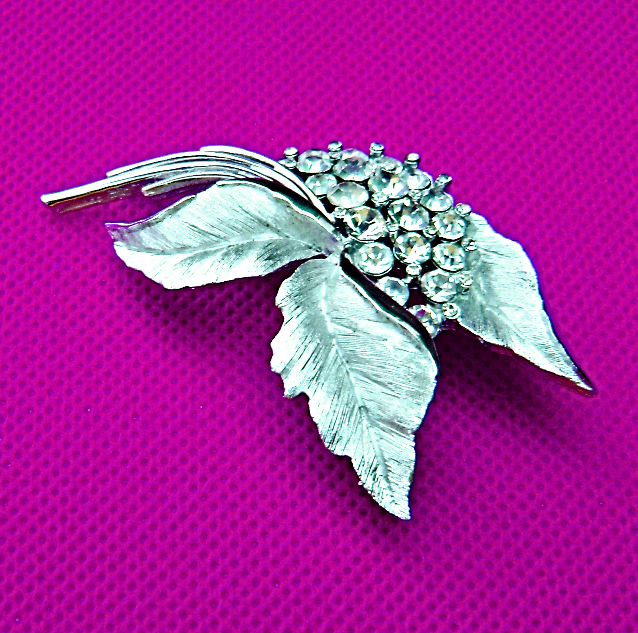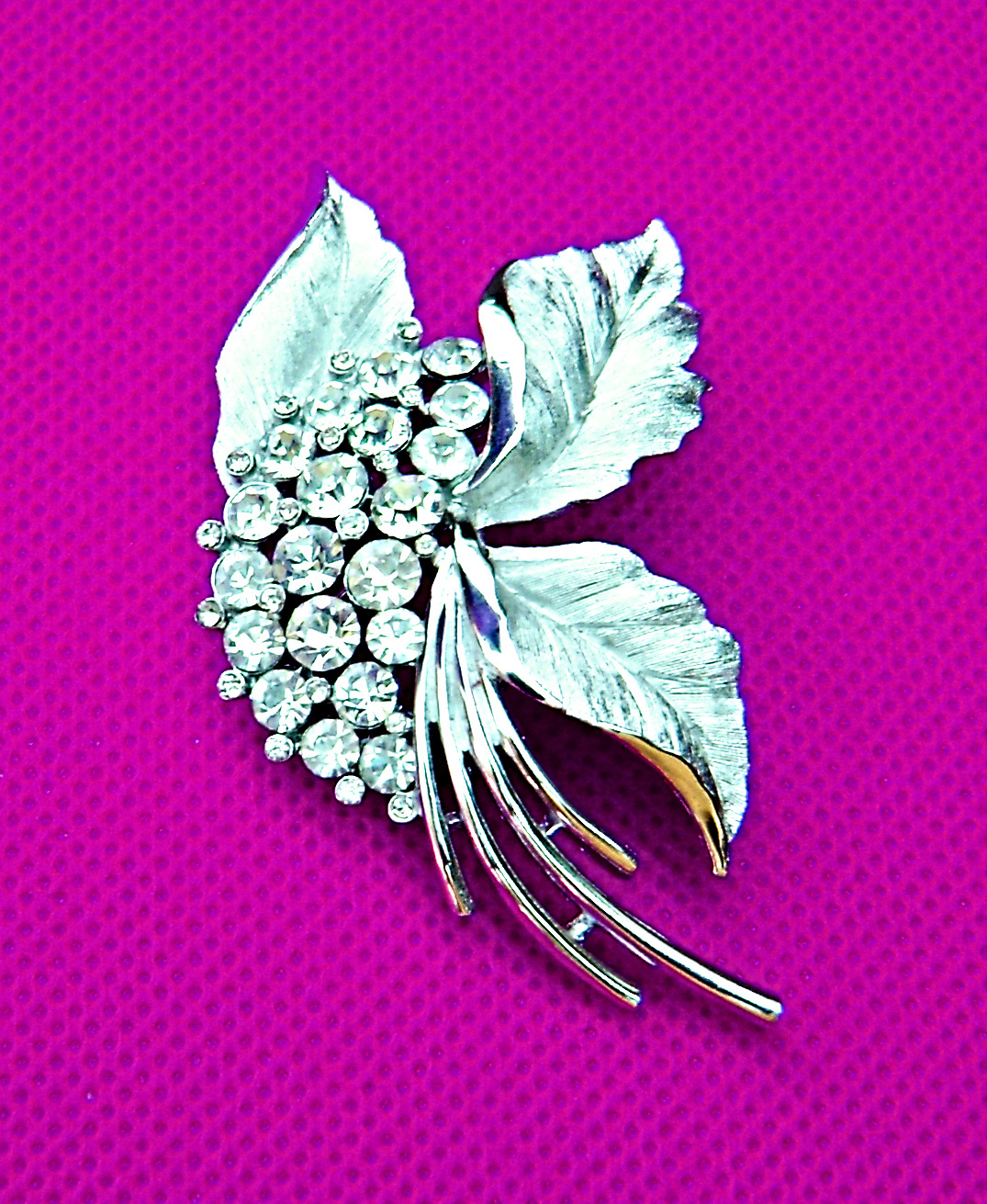 Crown Trifari Nosegay Brooch. With stems, three leaves and assorted sizes of simulated diamonds. 2-1/2".