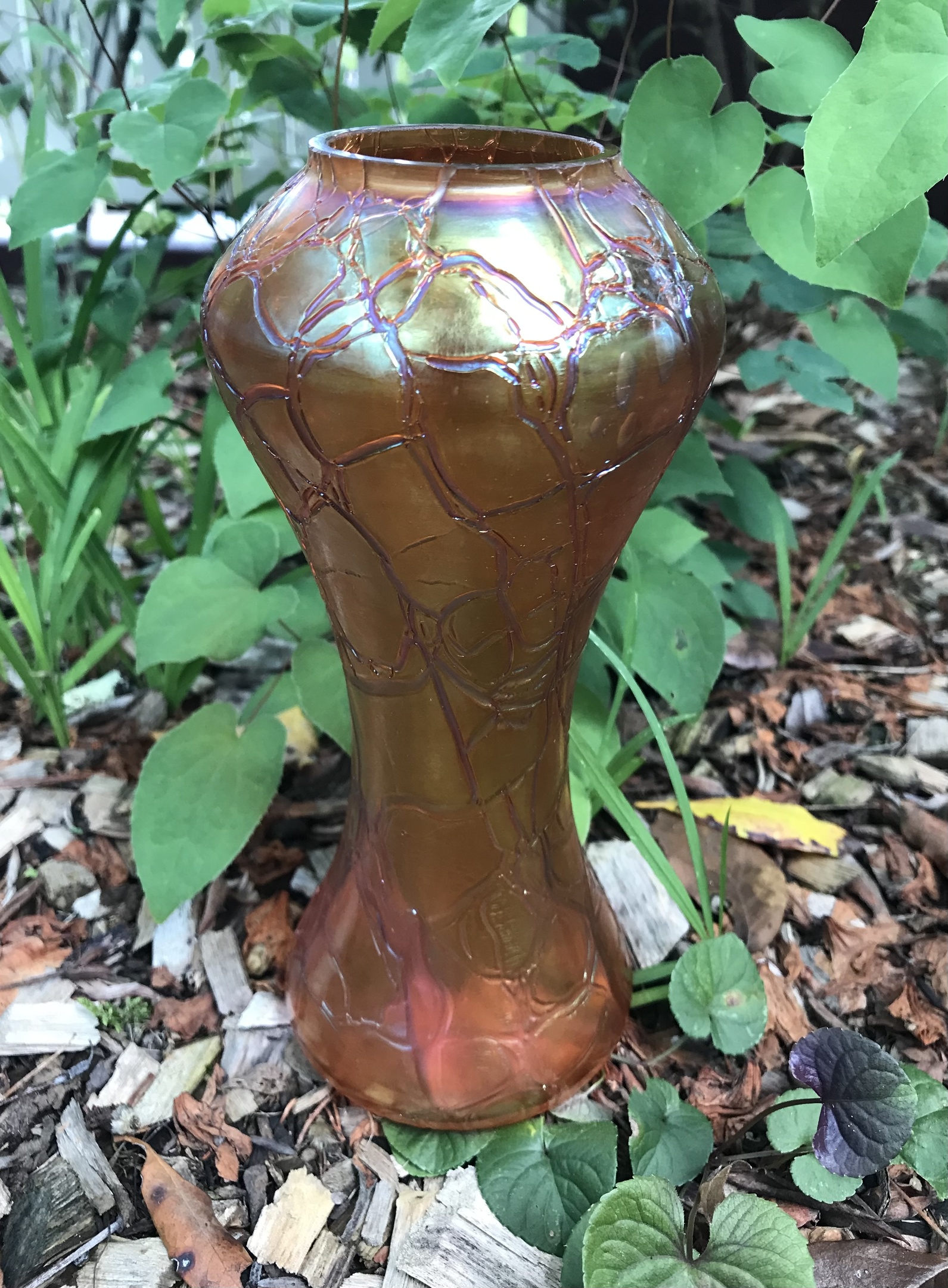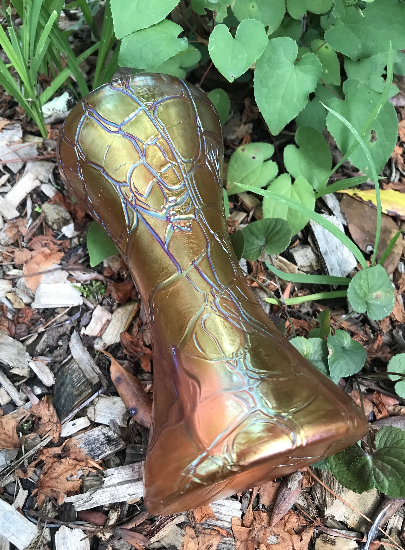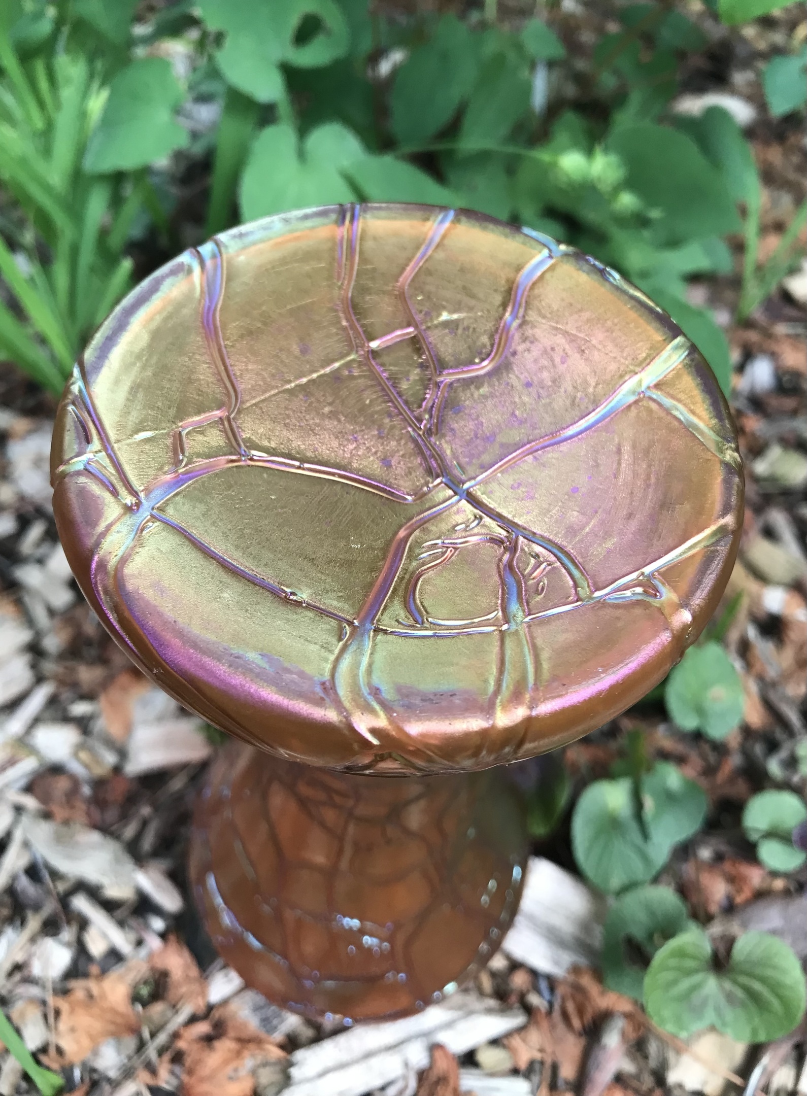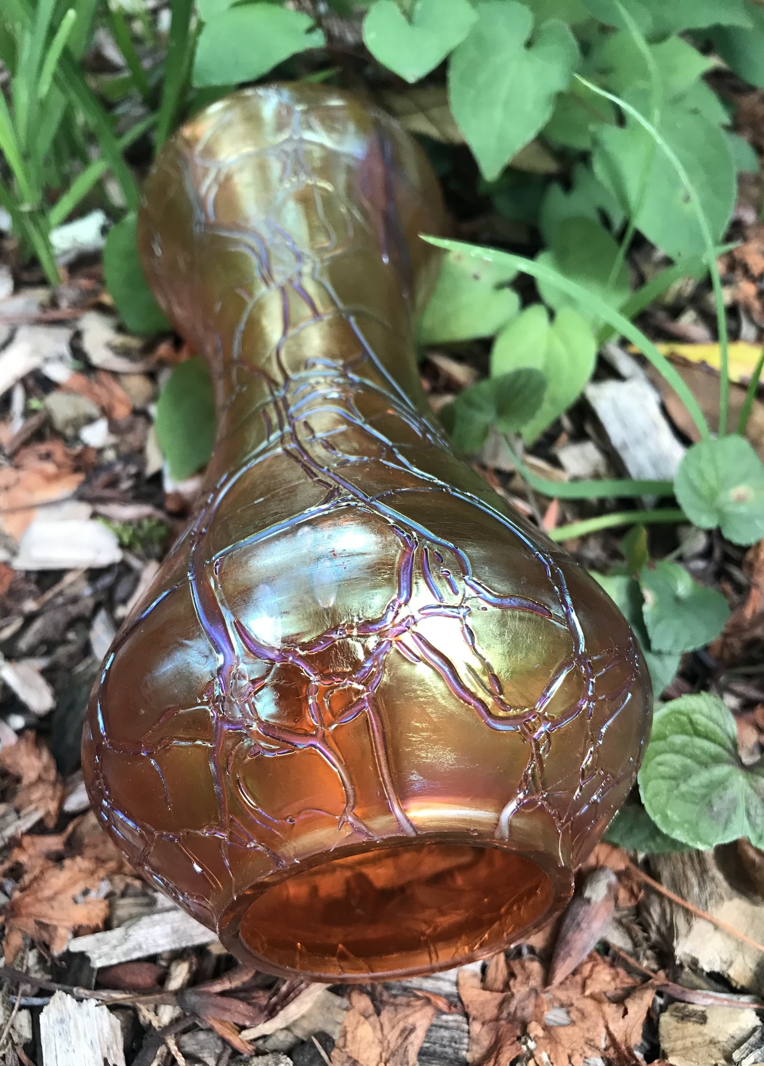 It was described as MCM carnival glass. I’ll just leave that out there…anyhow, despite a slight resemblance to carnival glass due to being iridescent orange, it isn’t.