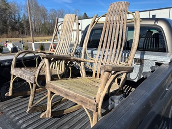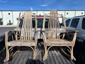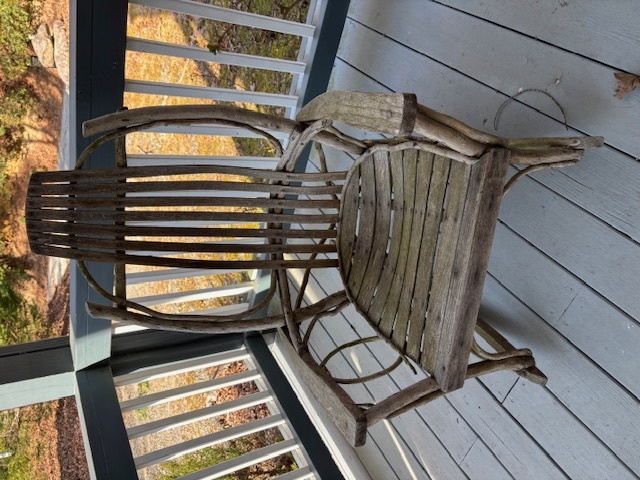 Vintage hand made bent twig Amish-style Adirondack rocking chairs. Typically crafted from hickory and oak branches and twigs and affixed with nails. These do not appear to have been painted and have weathered into a nice patina. In spite of their age, they remain sturdy and are comfortable to sit and rock in. The chairs were bought "off the dock" shortly after being dropped off at a local resale store in Brevard, North Carolina. From the four that were available, I chose the two in "best" shape - sort of. Light restoration and clean-up will be a winter project.