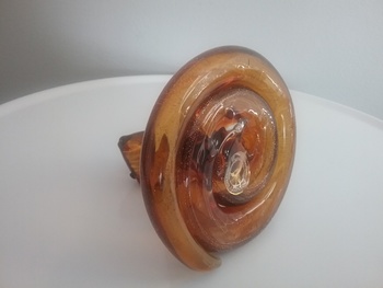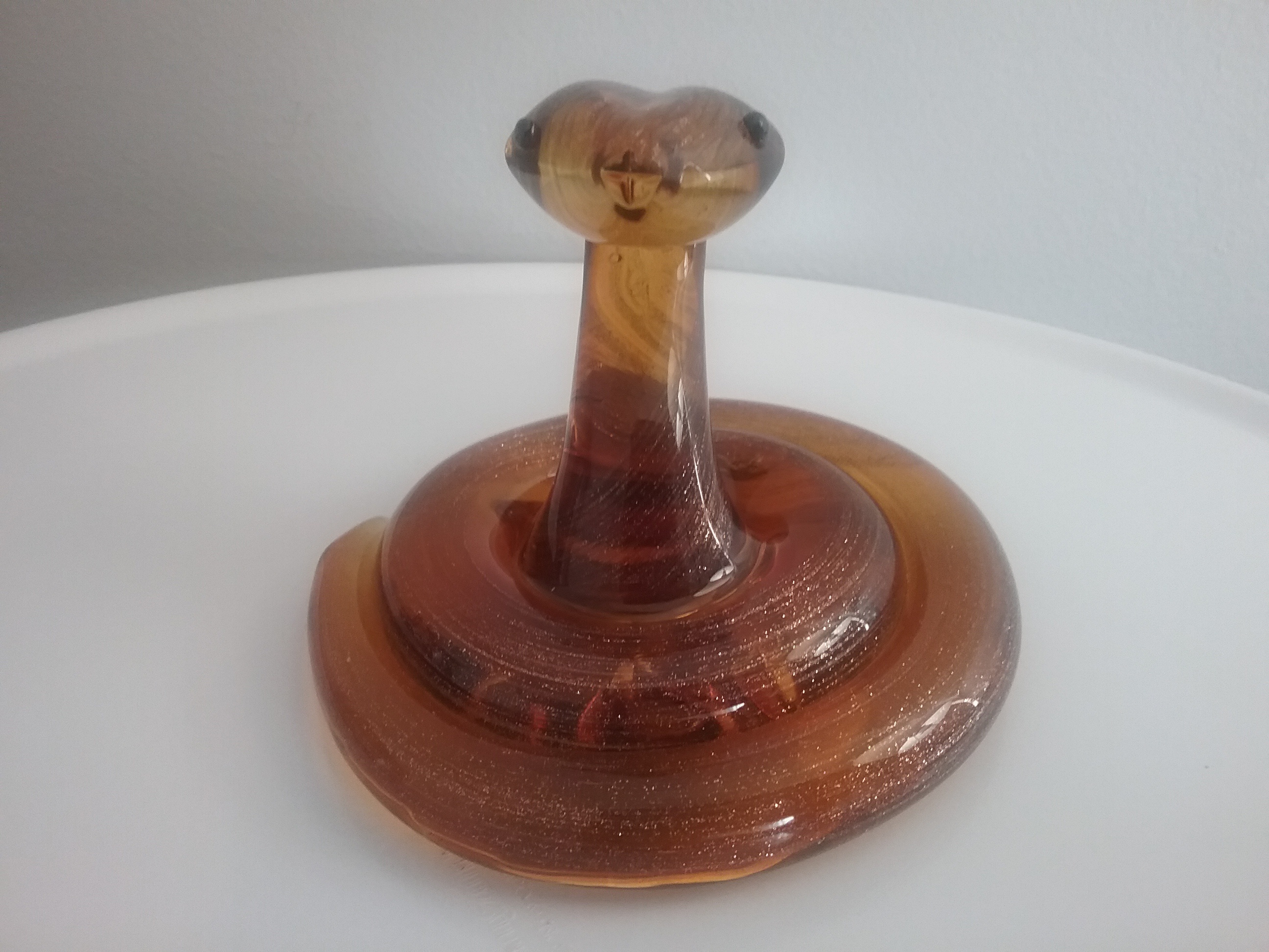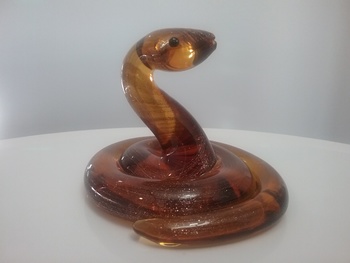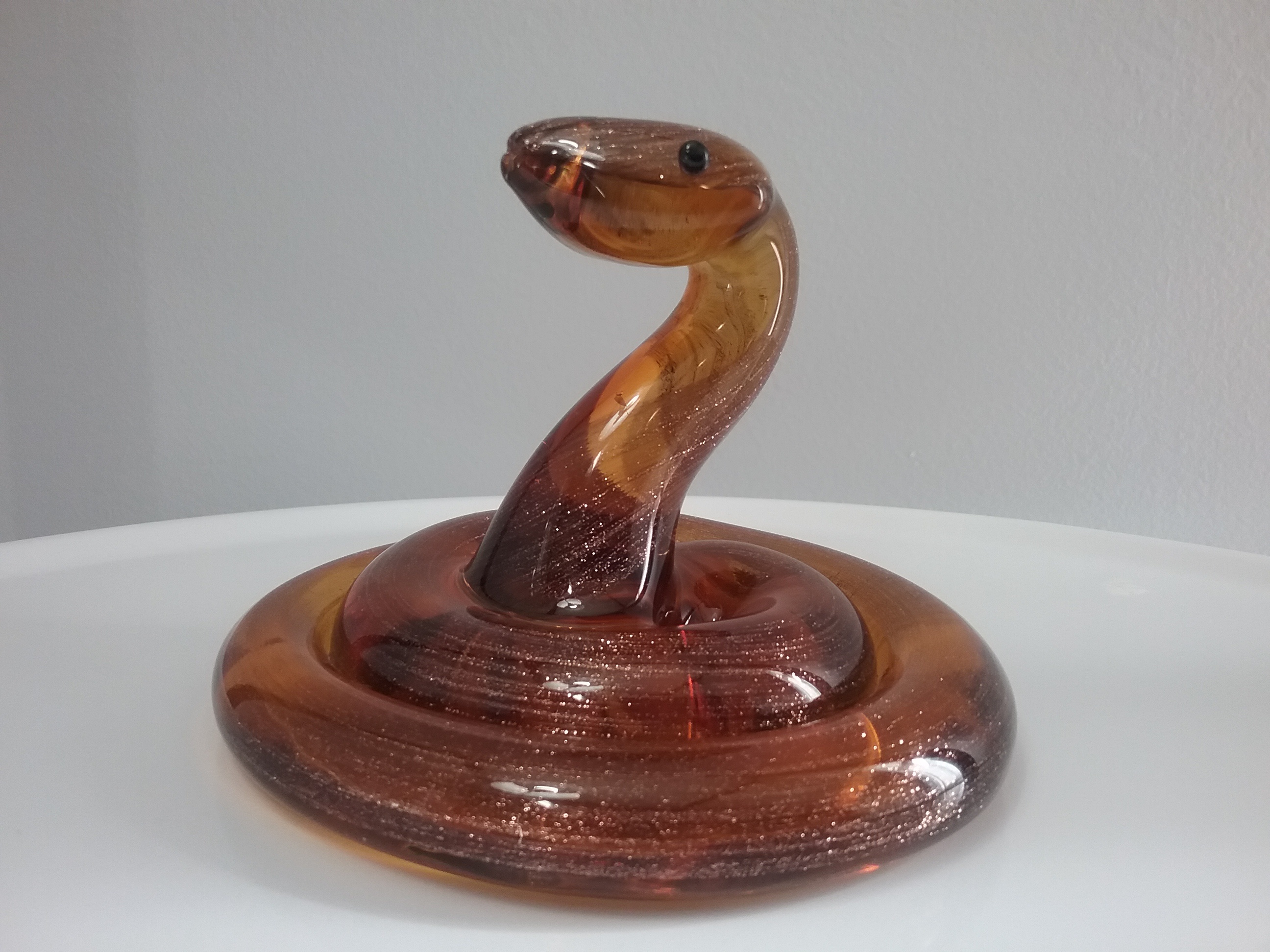 Here is a 4 x 4" glass snake in a coiled pose, with sparkling golden swirl inside amber glass, and two round black eyes. By Dynasty Gallery Glass of San Francisco CA with orig gold on clear label