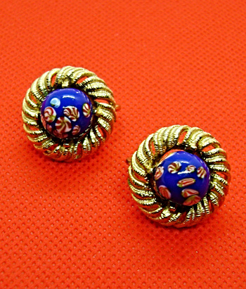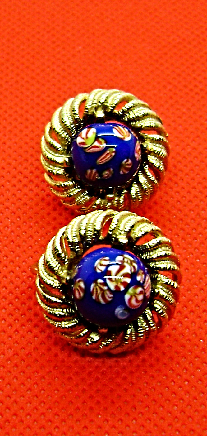 Crown Trifari Earrings. Gold tone. With blue lapis, venetian glass balls. They measure 3/4" and are from the 1960's.