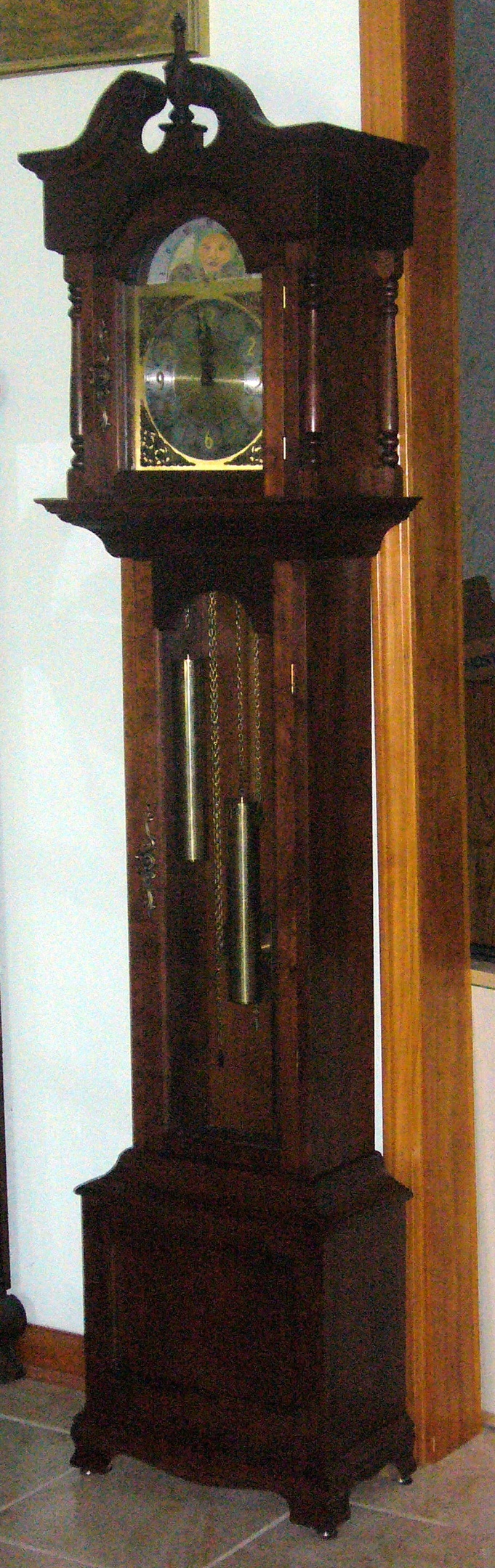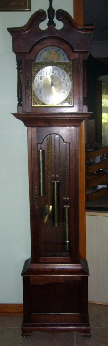 I've tinkered with it (also refinished/repaired/replaced) to the point where it keeps time to the nanosecond. It has a soft and musical Westminster chime on the quarters and calls out the hours.