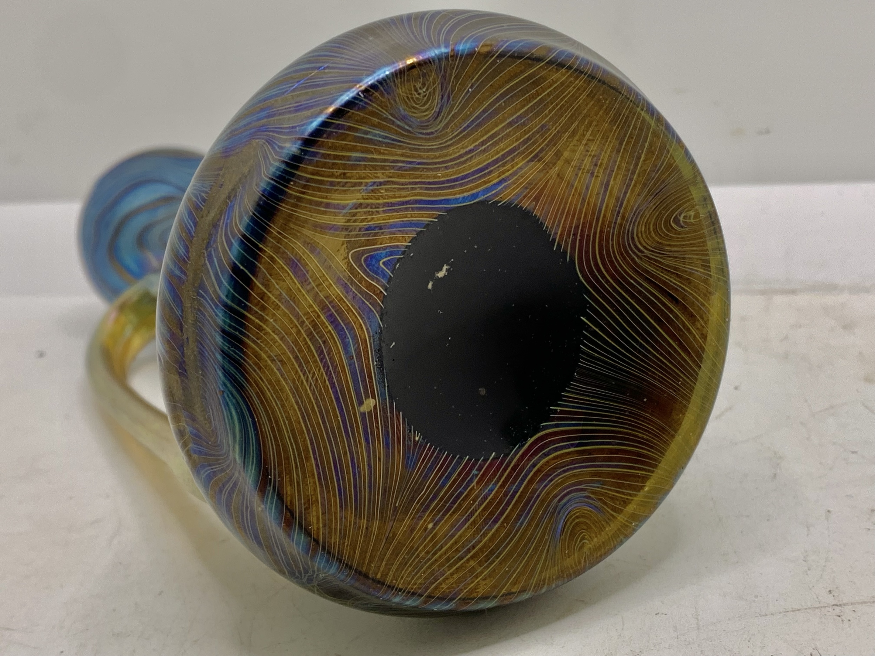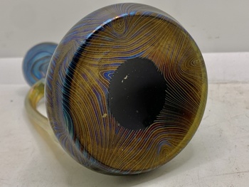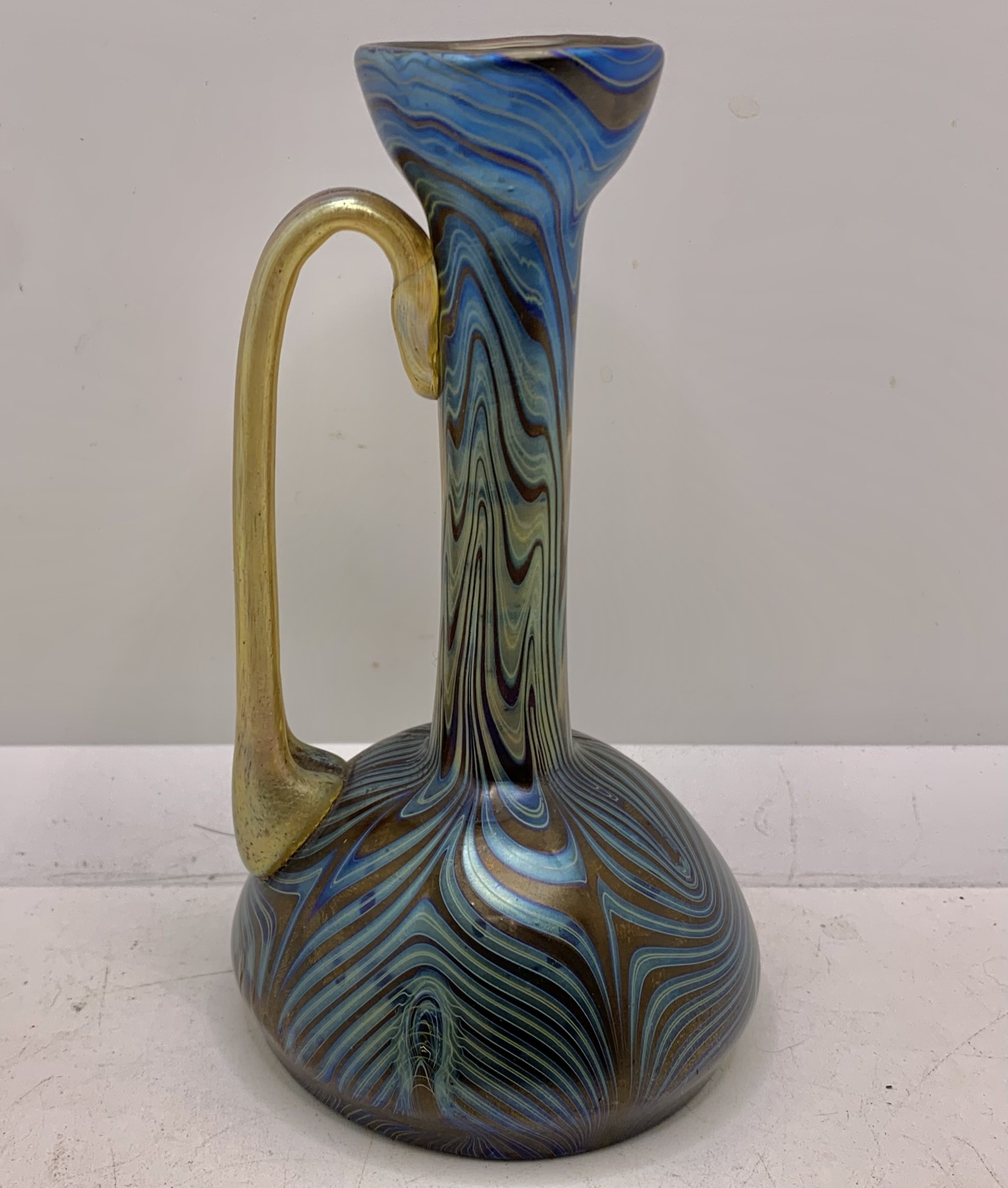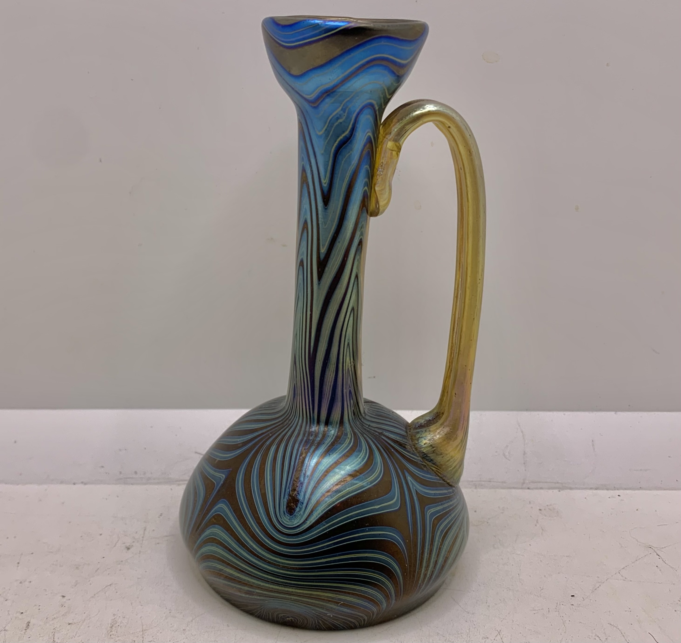 A very nice ewer vase made by the Loetz company in Bohemia (nowaday Czech Rebuplic). During the late 19th century to early 20th century. Excellent Phänomen designs reminiscent of a Tiffany vase almost. There’s Pontil mark on the bottom, no markings. Measures 5.5” tall. Got confirmation it’s a Phänomen Genre Rubin 7993. Excellent find!