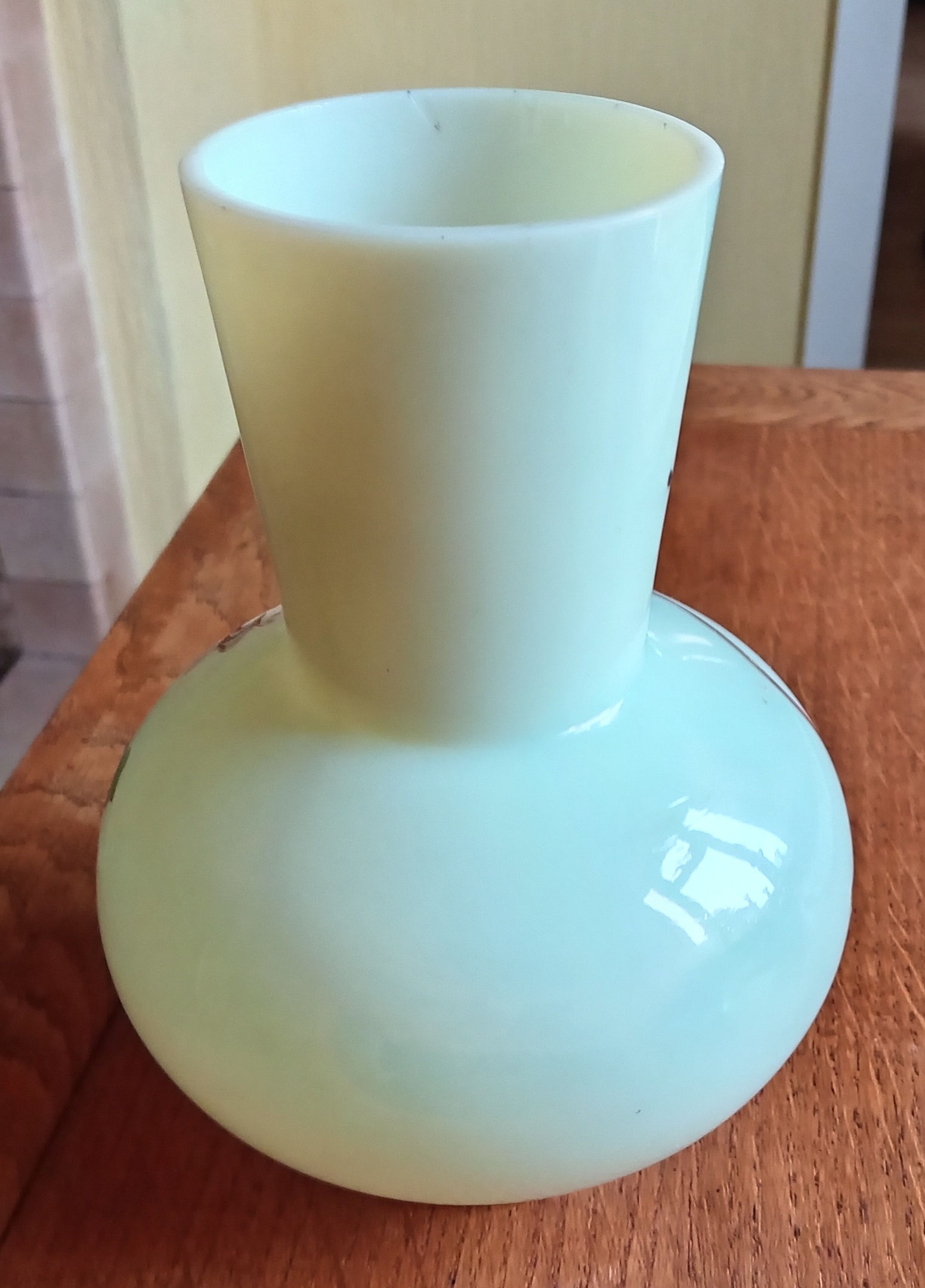 An unusual, very pretty, pale yellow, uranium opaline vase. 8" tall, 6" diameter, made in Bohemia around 1900 but very difficult to attribute a maker, probably from the Novy Bor area.