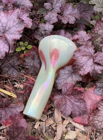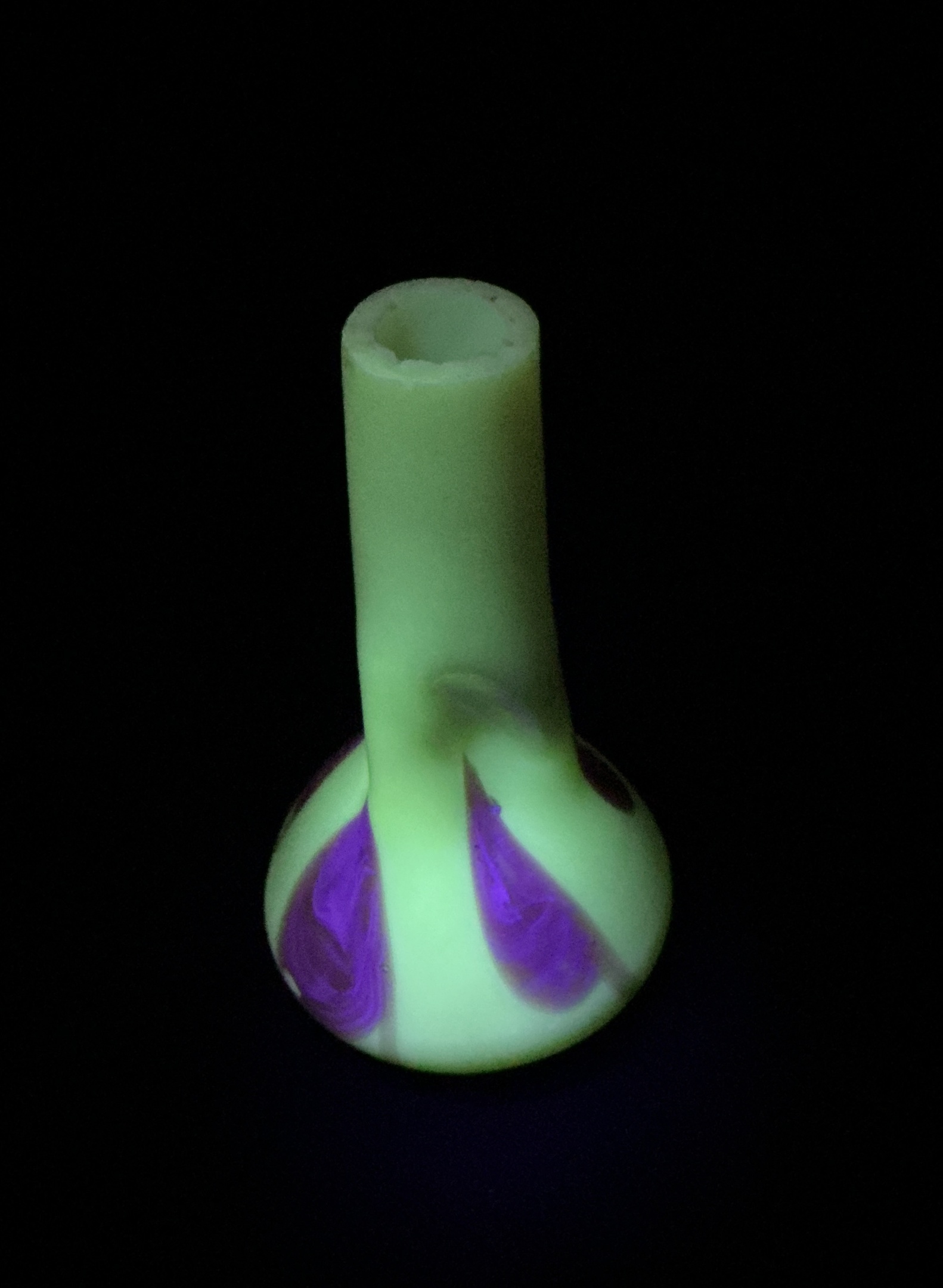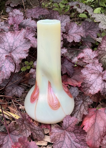 The vase is made from an opaline glass in a light cream with a uranium content. It features a pulled loop decor in pink that rises up from the base, & satin iridescent finish. The vase measures 16.5 cm tall, 3 cm across the top rim, & 6.5 cm across the base. The simple form is nicely set off by some pinched dimples.