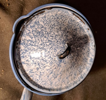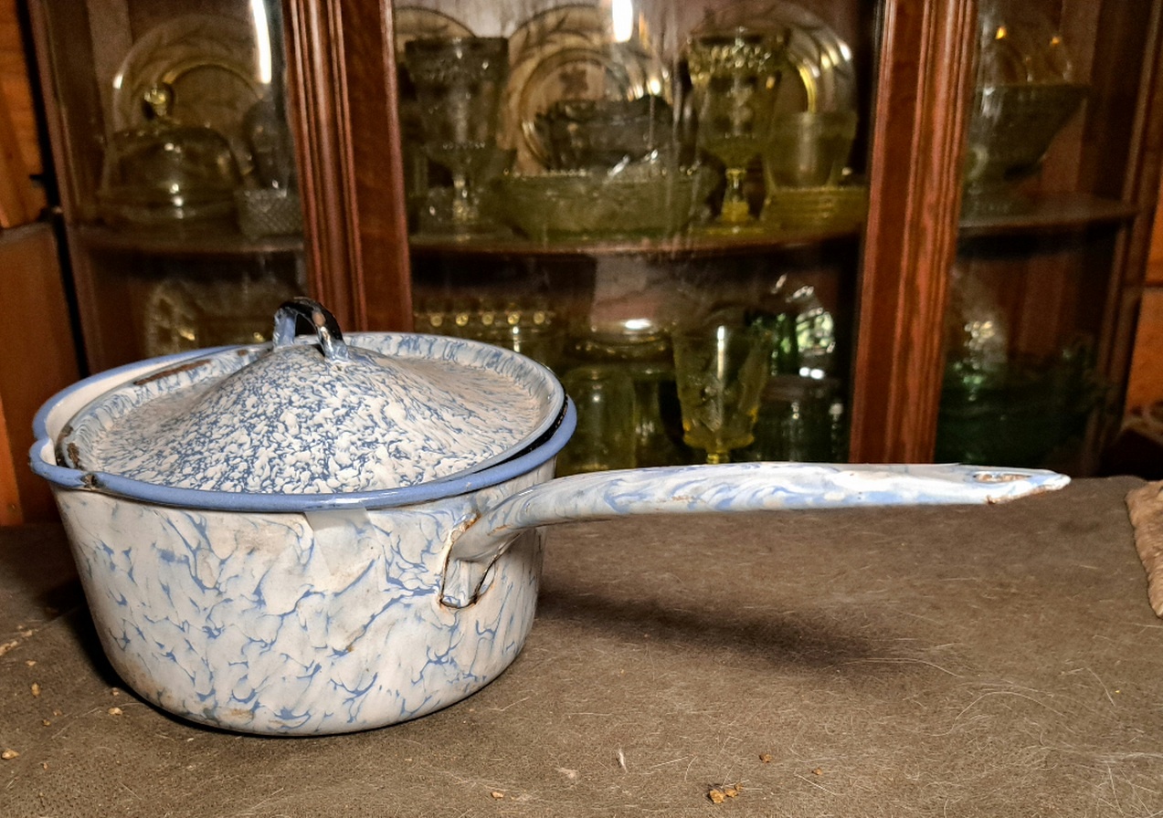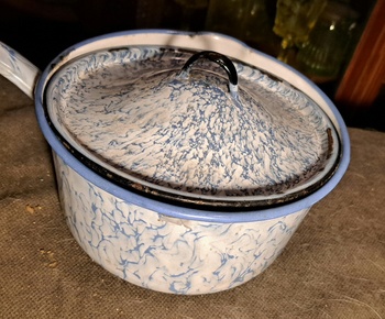 Picked a few graniteware pieces in Long Beach at low low prices. This isn't the most valuable color pattern but still a good deal. Difficult to date these but good chance it is 100 plus years old.