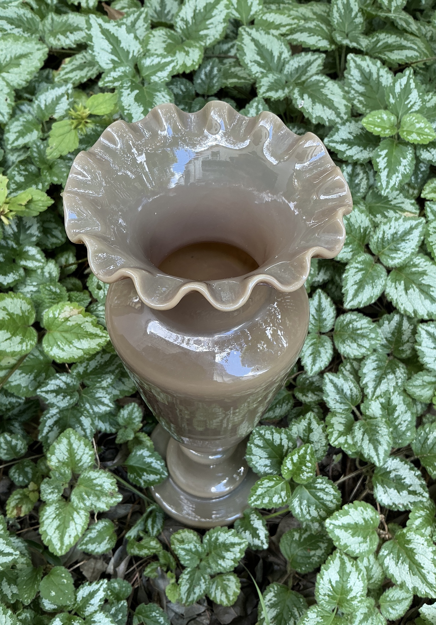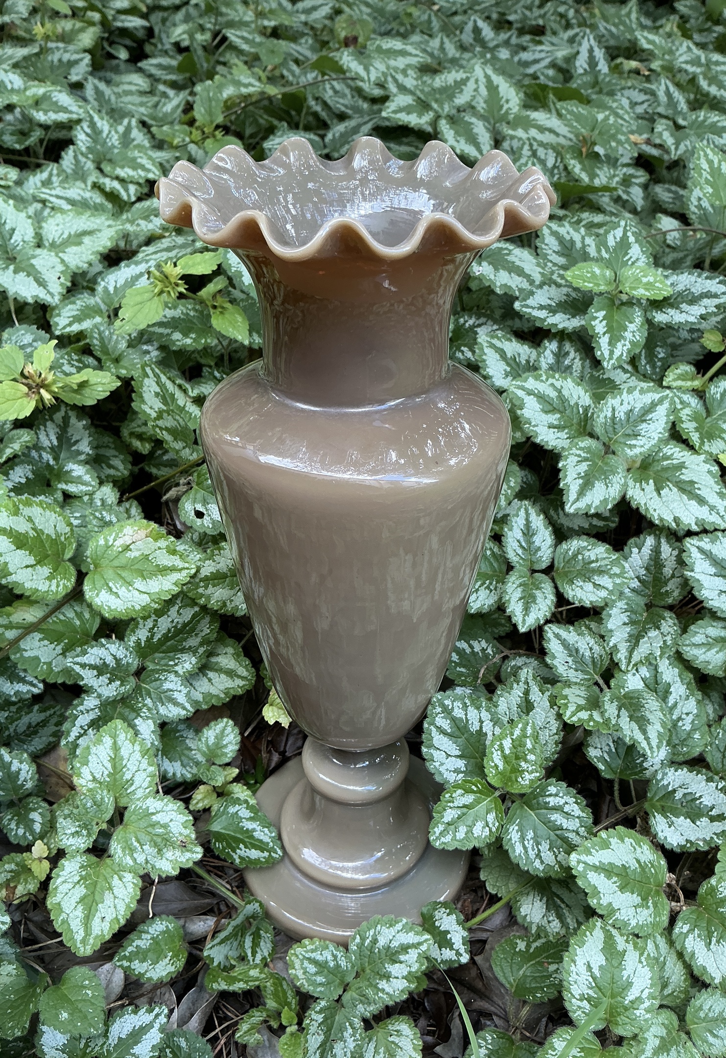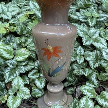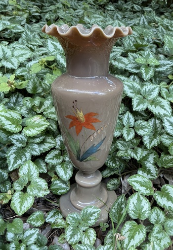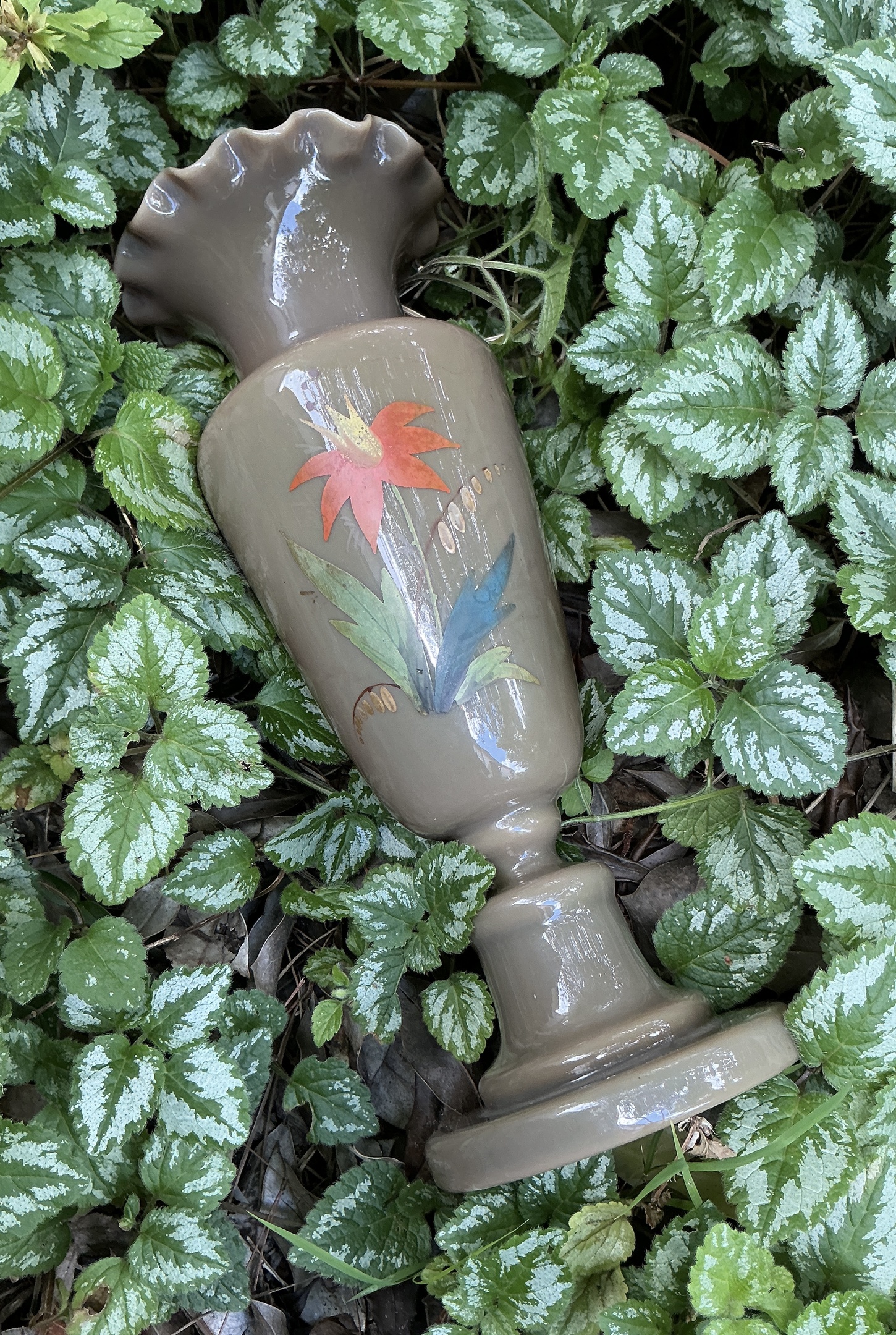 The vase is made from a single layer of brown opaline glass with painted decoration of a red & yellow flower. It measures 30 cm tall, 11.5 cm across the crimped top rim, & 10.5 cm across the base, which has a rough pontil mark.