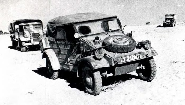 Another wartime vehicle built on the Beetle platform, Kübelwagen is a contraction of Kübelsitzwagen, meaning "bucket-seat car". Full-scale production started in February 1940 and they were in use throughout the war, serving as a versatile, air-cooled transport for the Wehrmacht across all fronts. Despite lacking 4-wheel drive, its low weight, high ground clearance, and flat underbody allowed it to operate effectively in mud, snow, and sand.