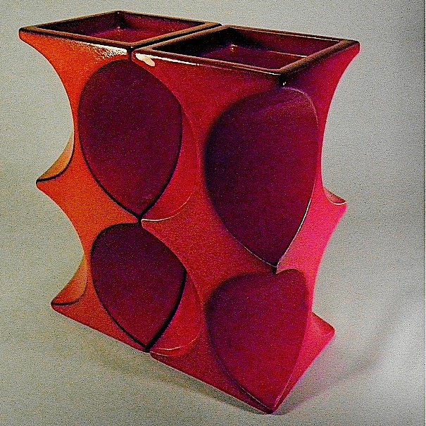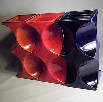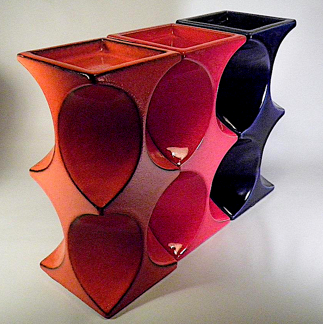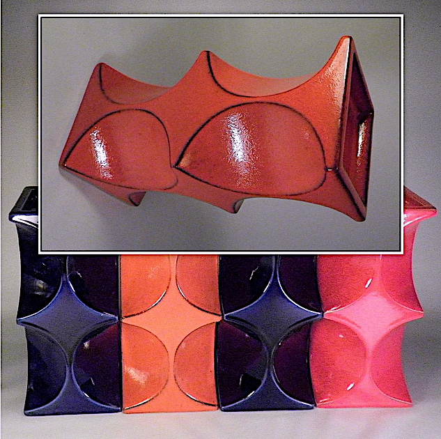 This design, among some others, best displays the series name 'CONTINUA'. As a designer myself, I would hazard an educated guess that Zalloni also designed in clay as well as on paper. The series includes a half sized candle holder 4" in height, these are 8" tall. There is a taller vase with the inverted globe quarters, which I would assume measures at 12"