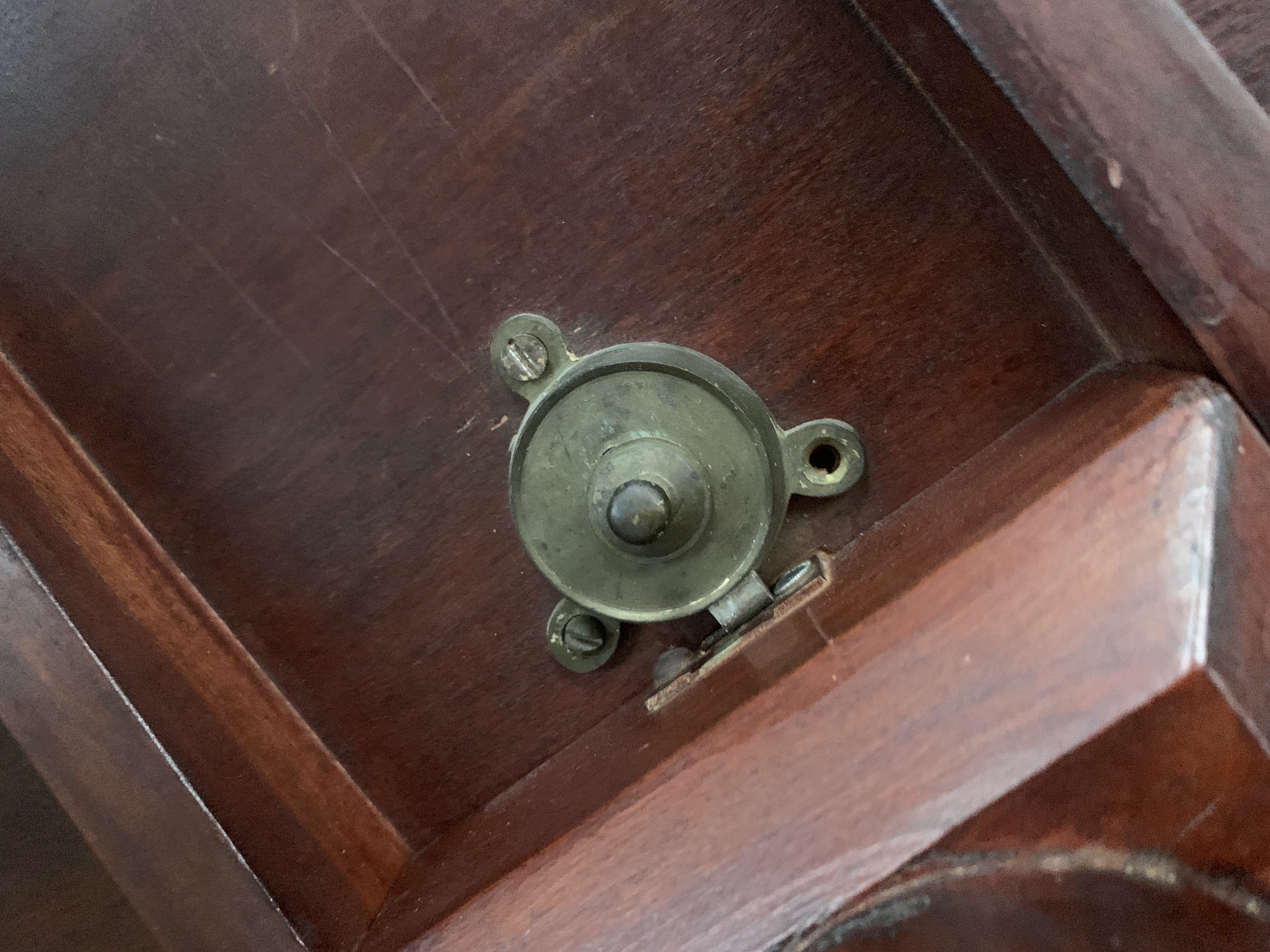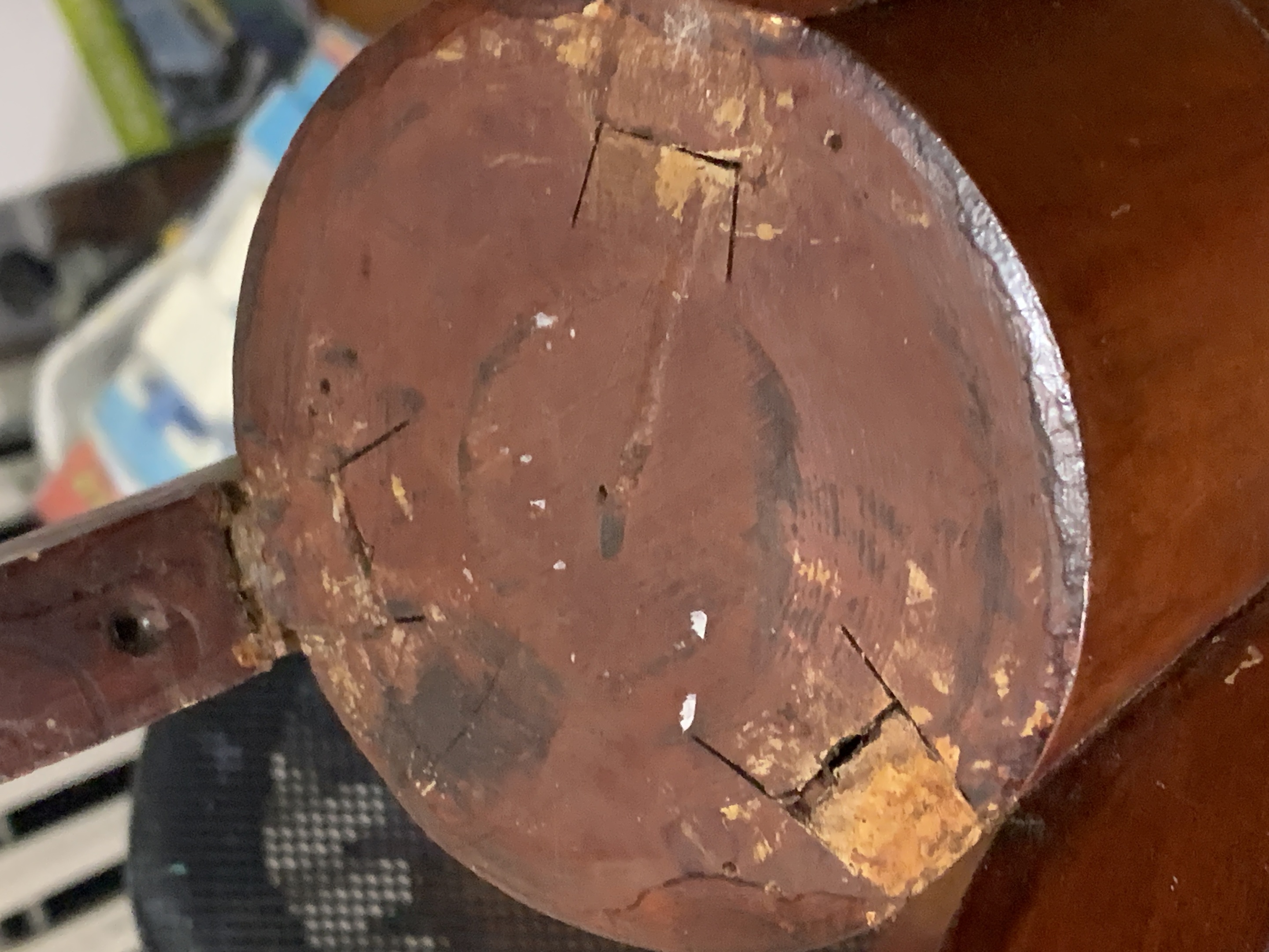 Found in Maryland. Lots of signs of repair and damage. An old piece. I've never seen one of these with legs like this. You can see how the legs are attached to the pedestal with these rough dovetails. An image of the little bun foot shows you how much wear these legs have. Are they original to the piece, or are they later additions (maybe original legs broke)?