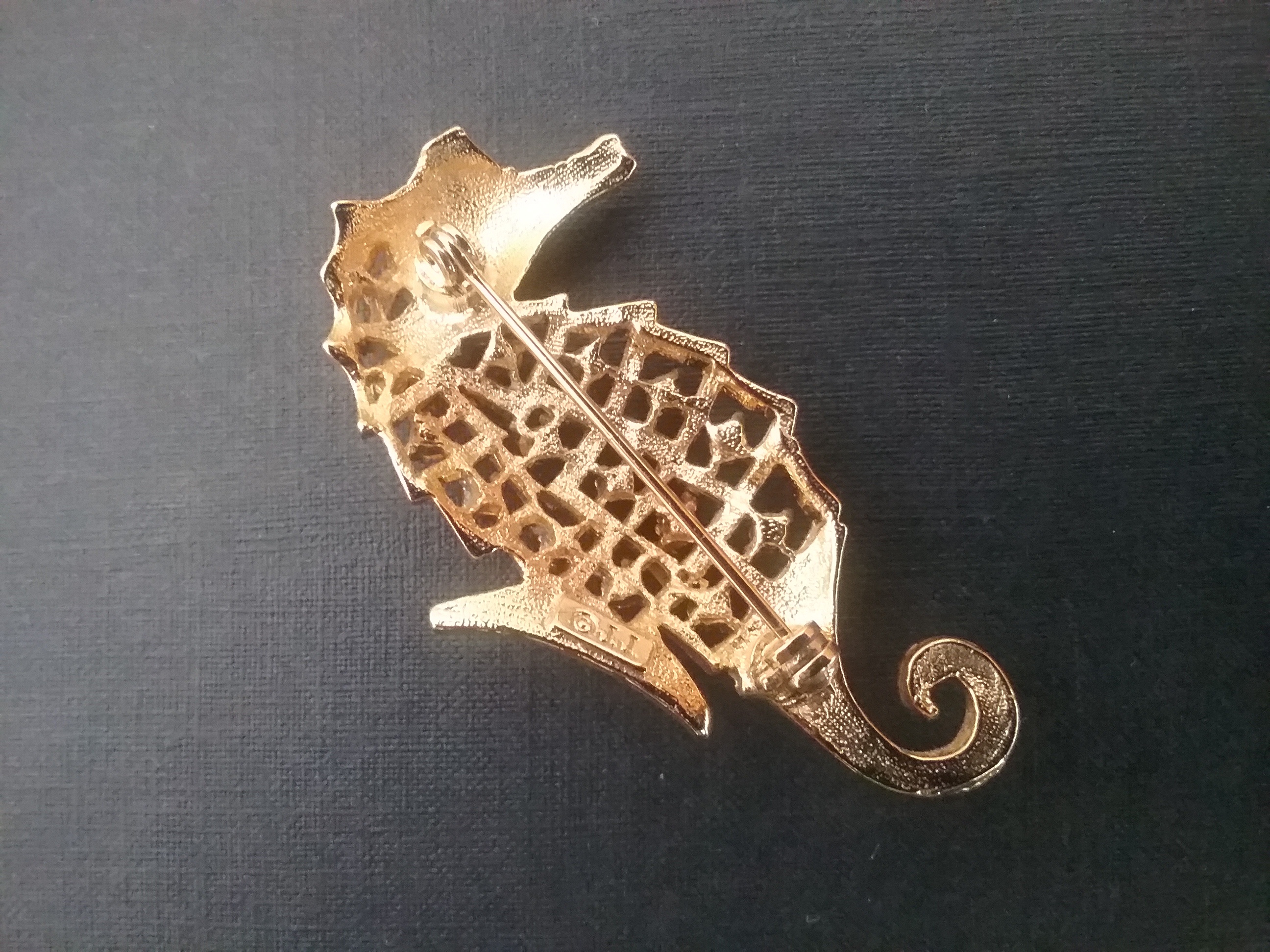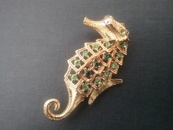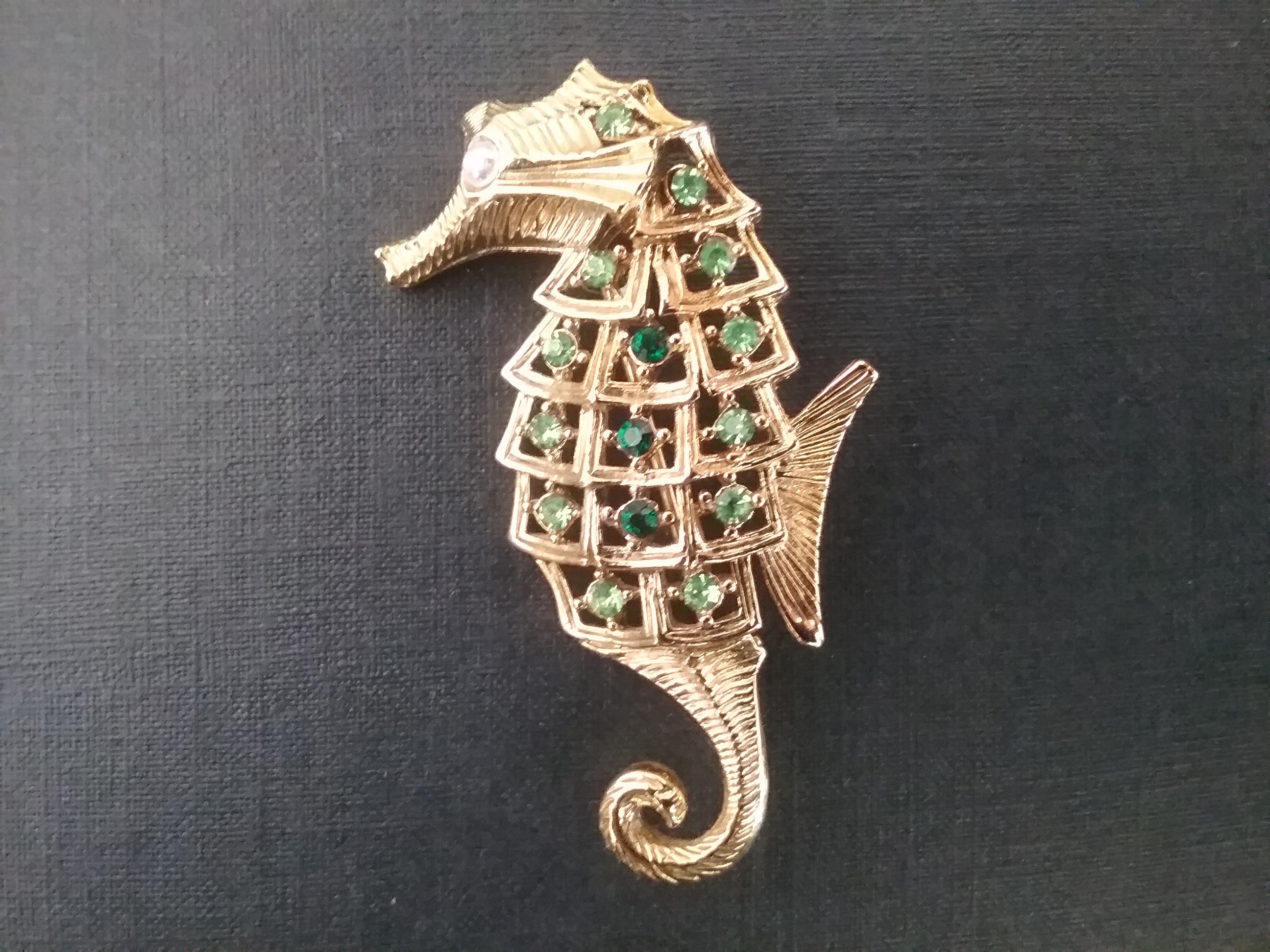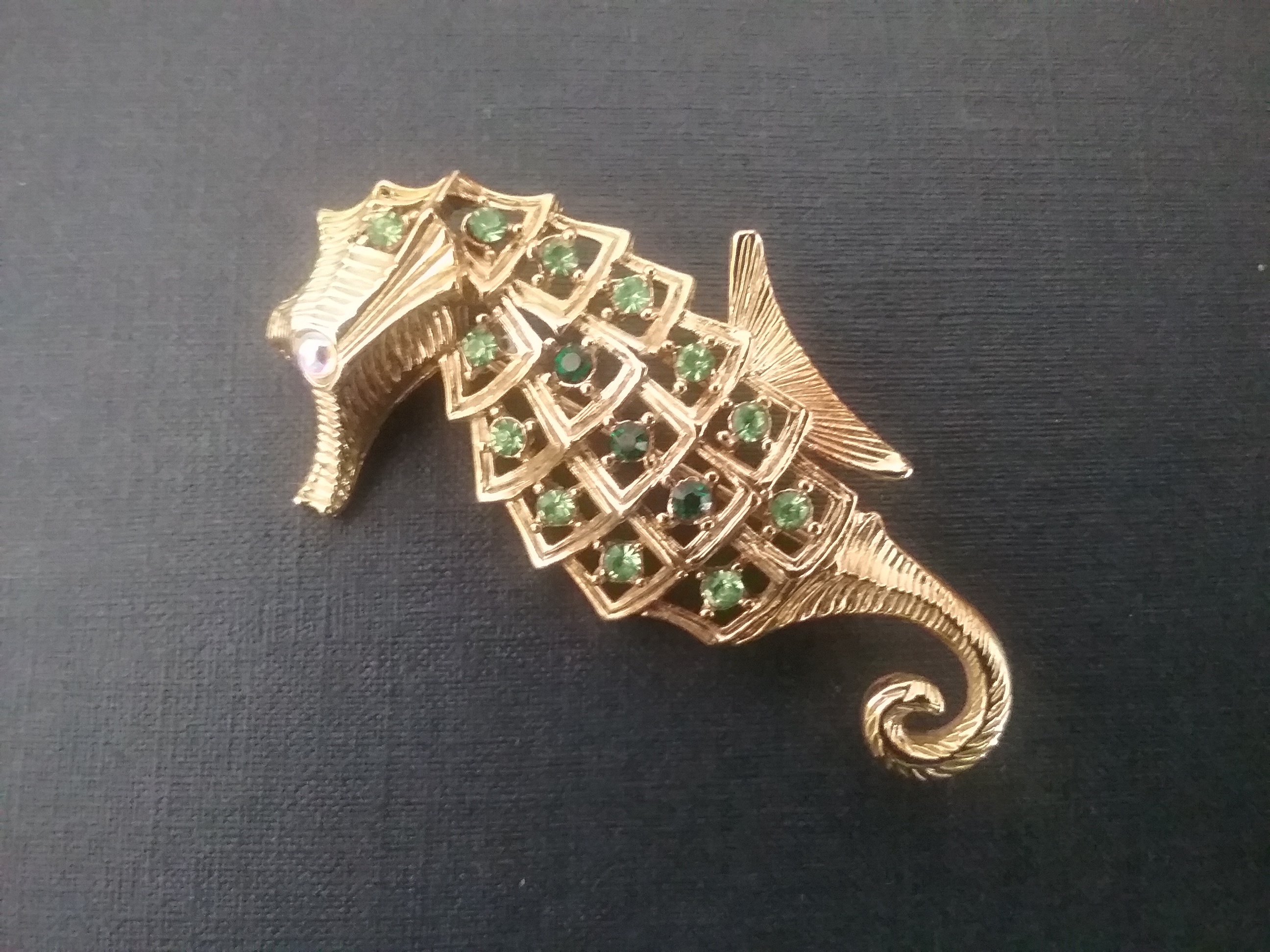 This 2 1-2"L goldtone seahorse brooch a body of two tone green small rhinestones in a caged design, with one crystal eye. By JJ Jonette ca the 1960s