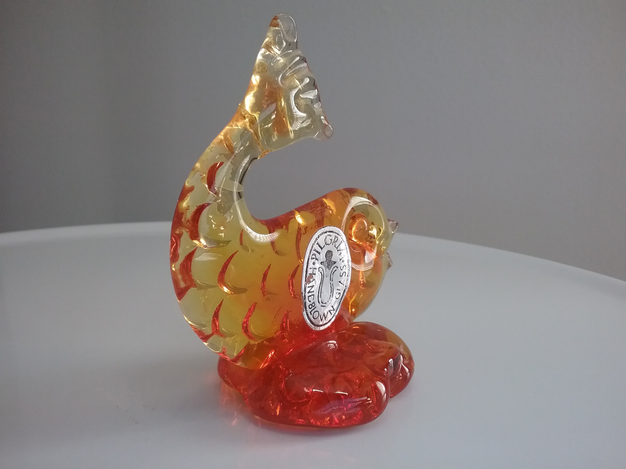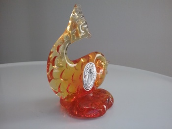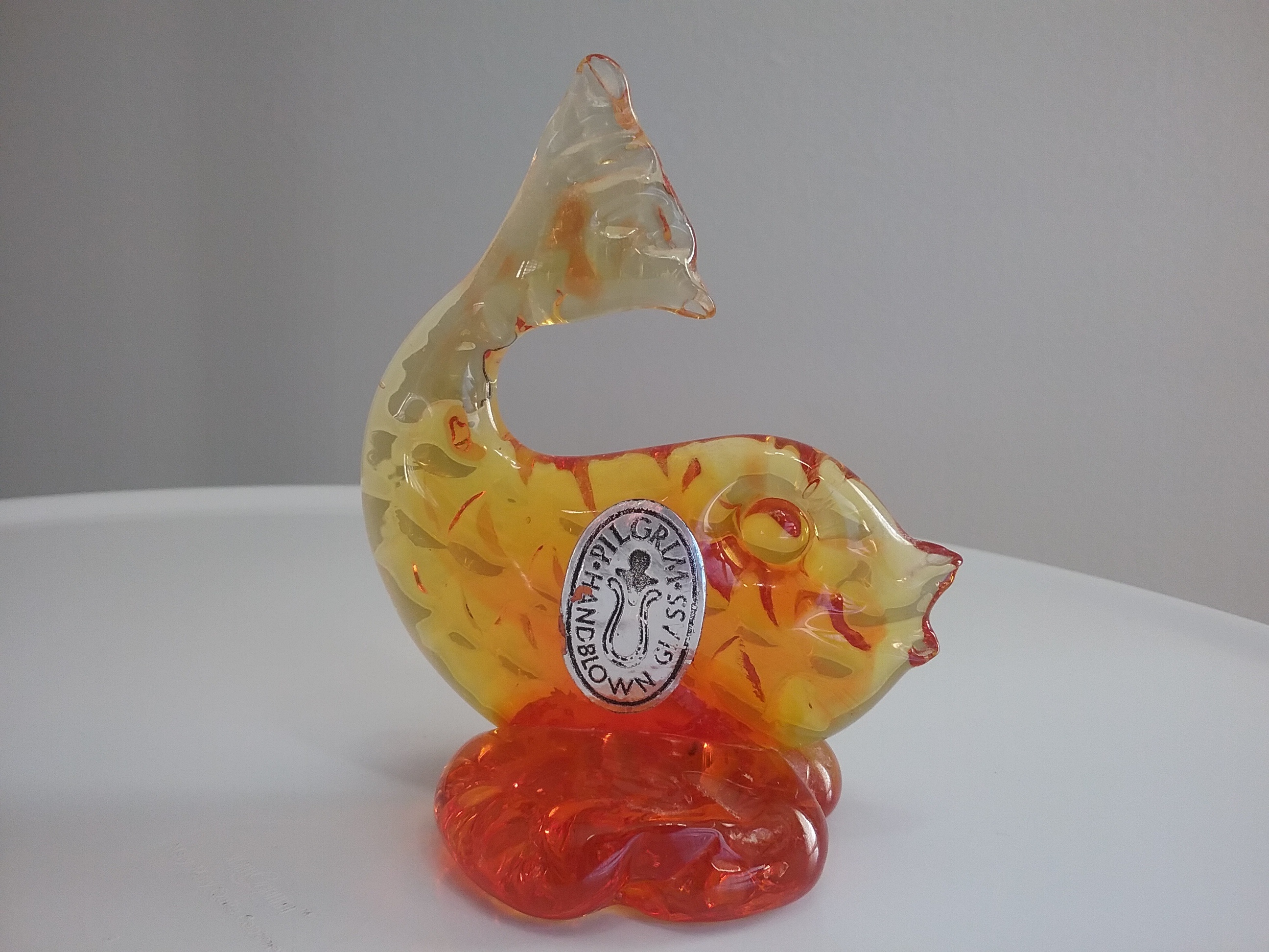 Here is a 4"H yellow and orange glass fish with scalloped fin design, a rare find from Pilgrim Glass of Ceredo WV with orig label. This fish would have been from @ the late 70s-early 80s as it is not found in existing earlier catalogs when window glass animals were most popular
