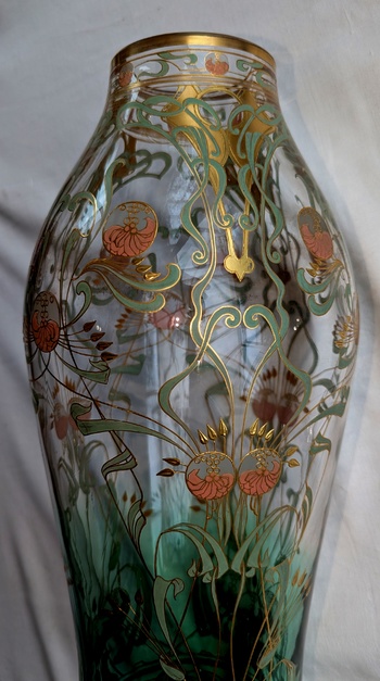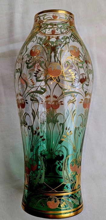 The first foto displays the central motiv, which is threefold repeated. In the second foto this motiv is located at the edges of the vase and their alignment by three entwined circular pink flowers emphasize the upper extended part of the vase. The details in the last two fotos demonstrate the mastership of Harrach glass enameling art. The enamel is executed in light green foliage and light pink blossoms, highlighted and combined by gilded outlines. The vase shape is known from other Harrach décors, see eg my CW contribution 'Harrach Hekla Décor Part IX'. Alltogether, this vase shows Harrach as leading company of Bohemian upcoming 'Art Nouveau' at the end of the 19.th century.