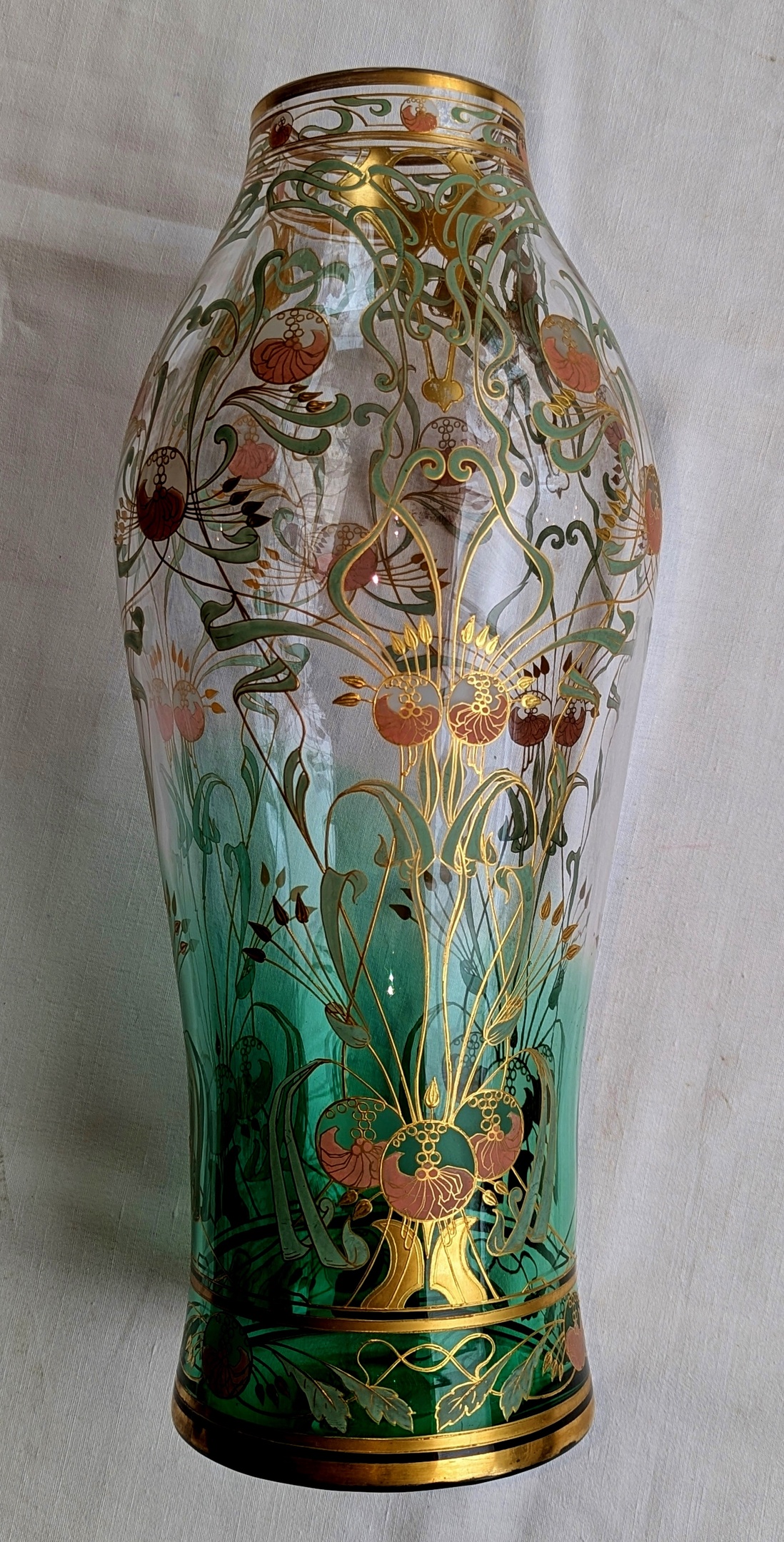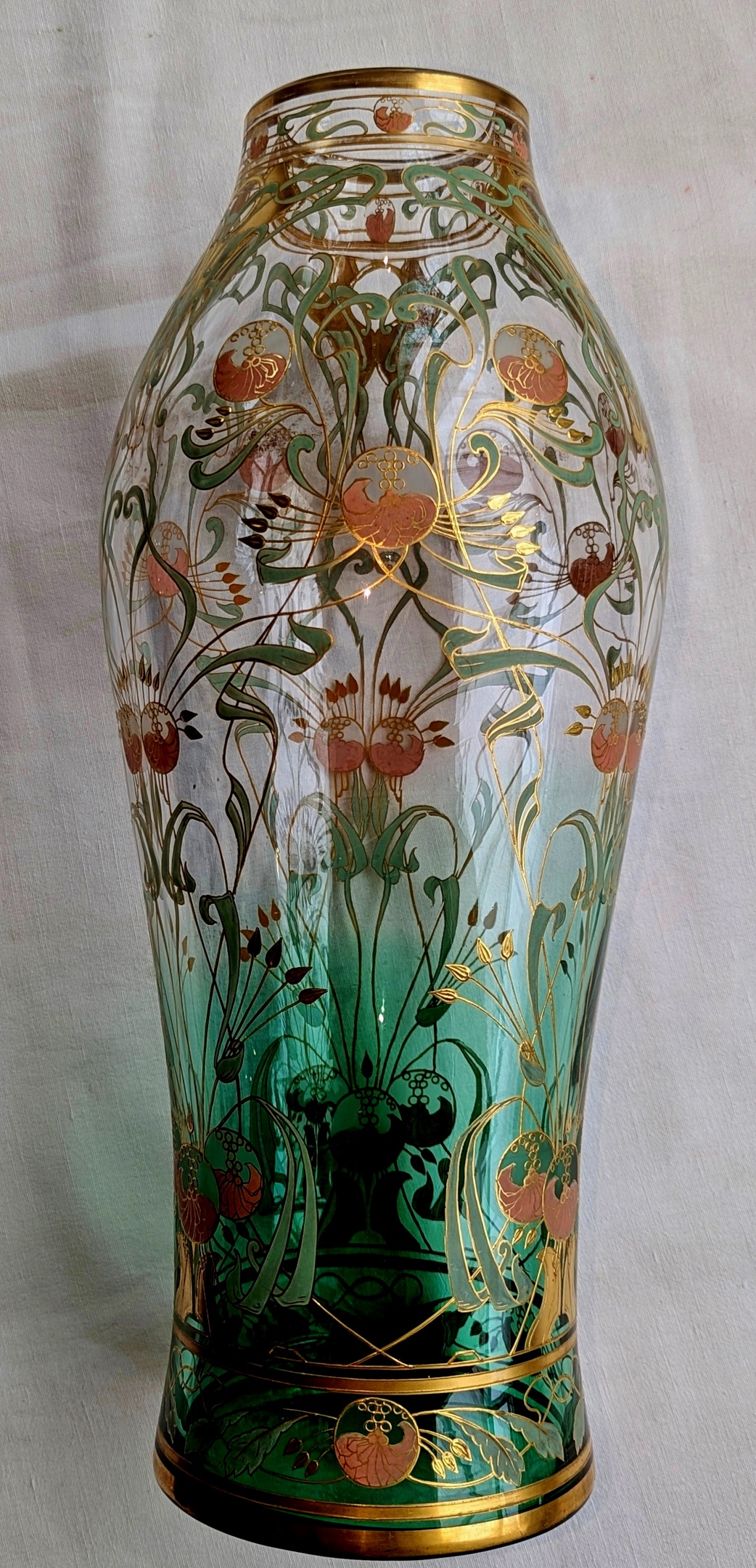 I acquired this unique Harrach vase from the heritage of a noble french family. The huge 'Basdouble Maigruen' (sprading maygreen) glass vase is covered by an exquisite 'Art Nouveau' ornament. It doesn't show any naturalistic blossoms, branches nor leaves, instead the artist gives an abstract, strongly linearized impression of a blooming flower arrangement. From stylistic considerations, this design is attributed to the architect Jan Koula and was presumably made for the World Fair 1900 at Paris, where this huge vase possibly was acquired by the mentioned french noble family. This linearized, dynamic ornament shows the strong influence of Henry van de Velde, Charles Rennie Mackintosh and of his wife Margaret McDonald Mackintosh onto the design work of Jan Koula.
