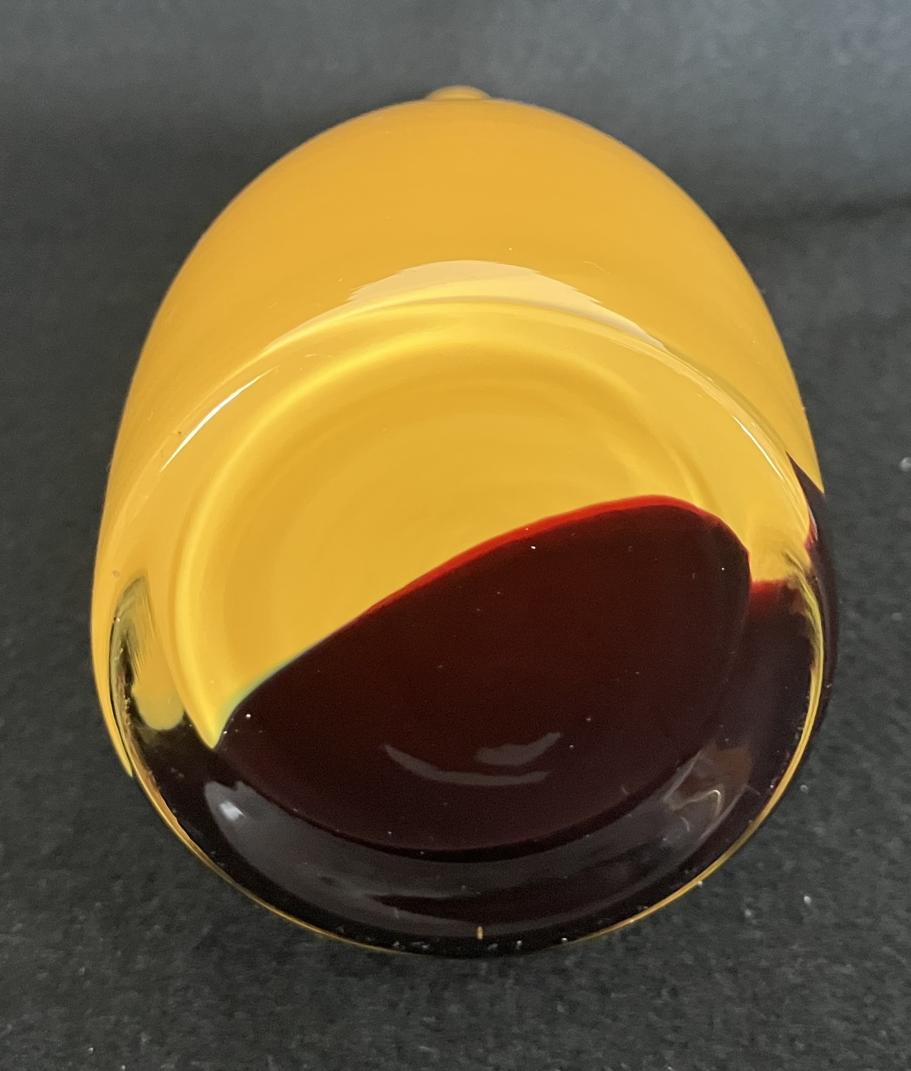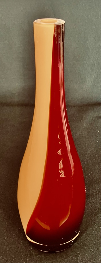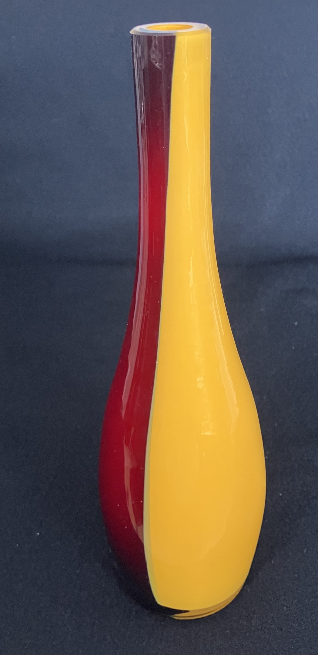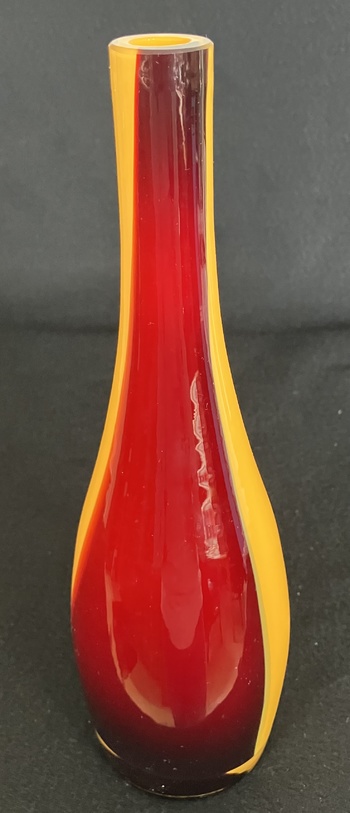 I am trying to figure out what type of vase I have. It is hand blown and 11.25" tall. The top is beveled on the outside. The pontil mark is polished off. It weighs 1 pound, 5 3/8 ounces. The red is darker than in the upright photos - the photo of the base is truer to how it actually looks (something is happening when photos are taken, I think the yellow shows through?). The last side (not shown) is fully yellow. The clear base varies from 1/4" to 1/2" thick. I am getting answers on the internet that it appears to be a Murano Sommerso Vase, a vase by Floris Meydam for the Glasfabriek Leerdam factory, or a contemporary reproduction from a Chinese or Eastern European manufacturer. I can't find it in any online catalogs.