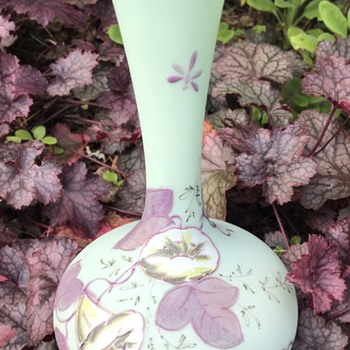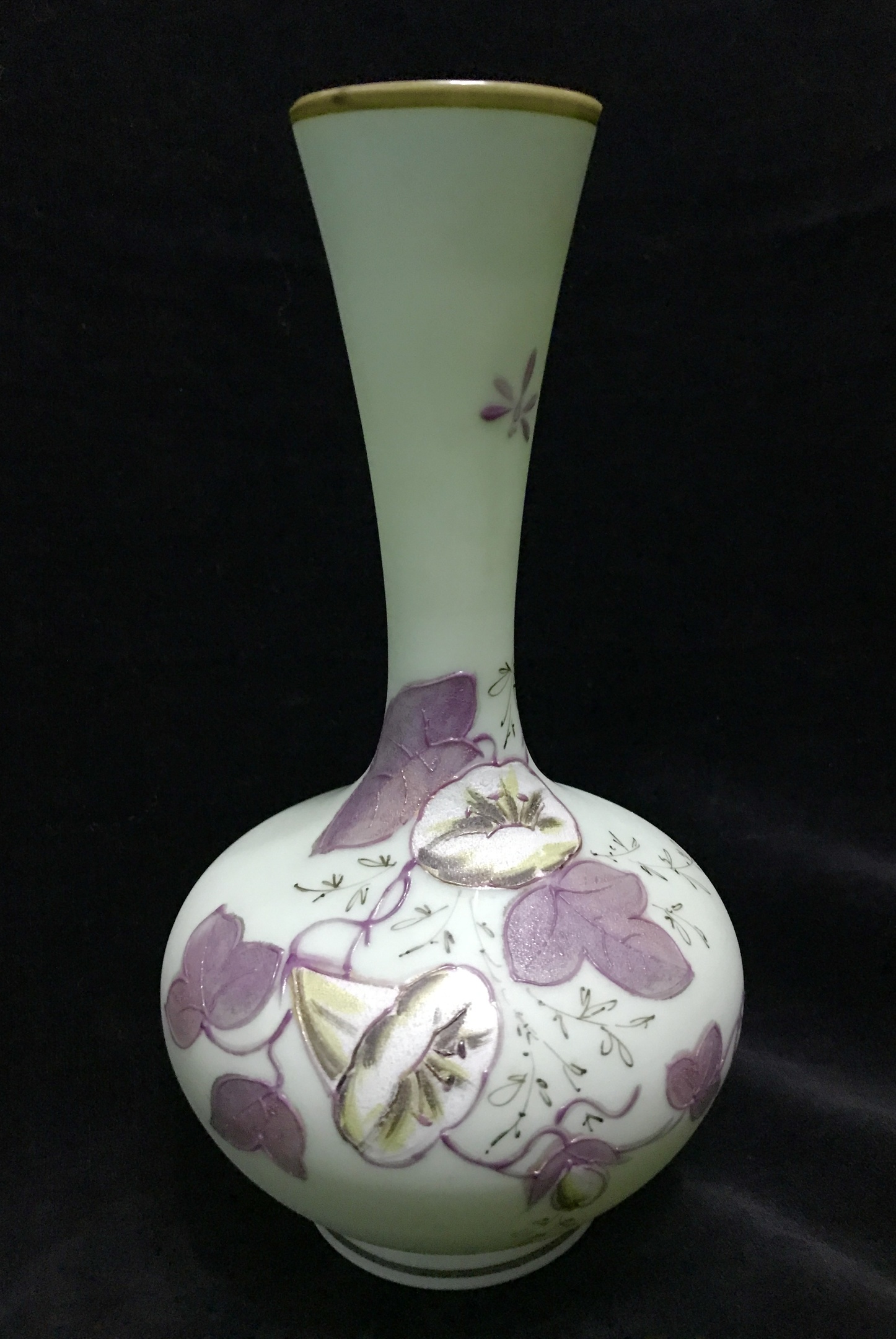 This vase is made from a single layer of pale green opaline glass with a satin finish. There is enamel decoration of a flowering vine (maybe a Moonflower) & a small dragonfly hovering above. It measures around 20 cm tall, 5 cm across the cut top rim, & 6.5 cm across the base. The purplish tones of the enamel work contrast nicely with the pale green.