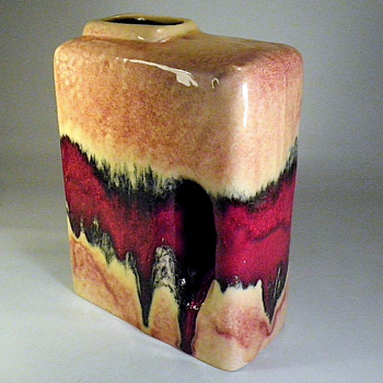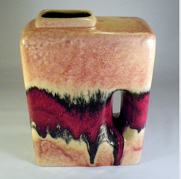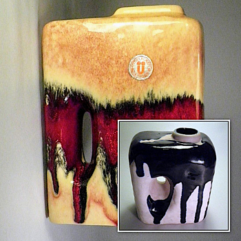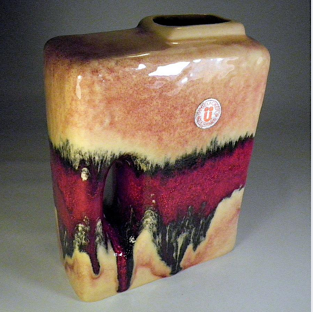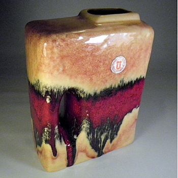 The "Chimney" vase form was used by a few pottery companies in Mid Century West Germany. This vase would be included in what is called the 'Fat Lava" period, despite its glossy smooth finish, This vase by UEBELACKER KERAMIK is a fine example. The company was around for decades changing it label often. This label dates the vase 1970-1975. The red color was attributed to selenium. I have no definitive attribution for the smaller vase.
