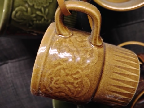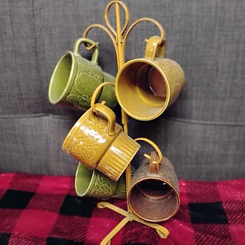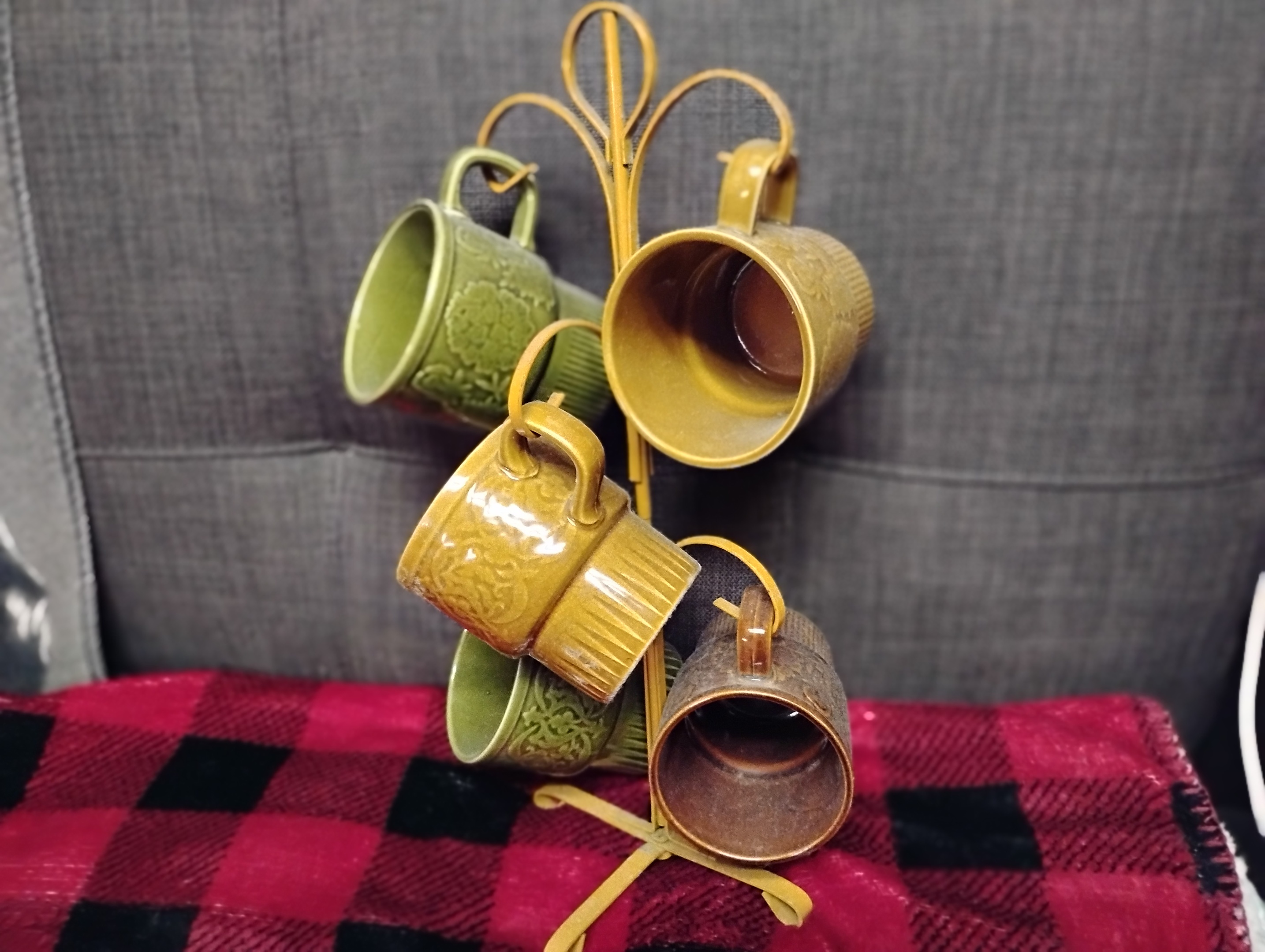 It Is The 1970s..You Awake In The Morning And Go To The Kitchen To Get A Cup Of Coffee And It Just May Be One Of These Mugs You Grab...5 Vintage Coffee Mugs In Various Colors Hanging On A Vintage Metal Mug Tree.