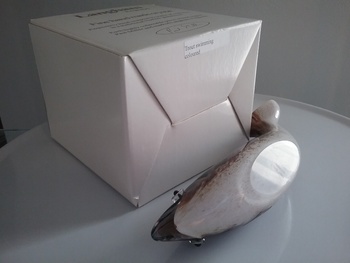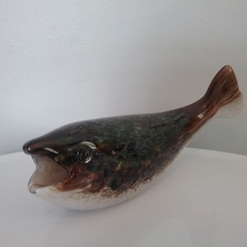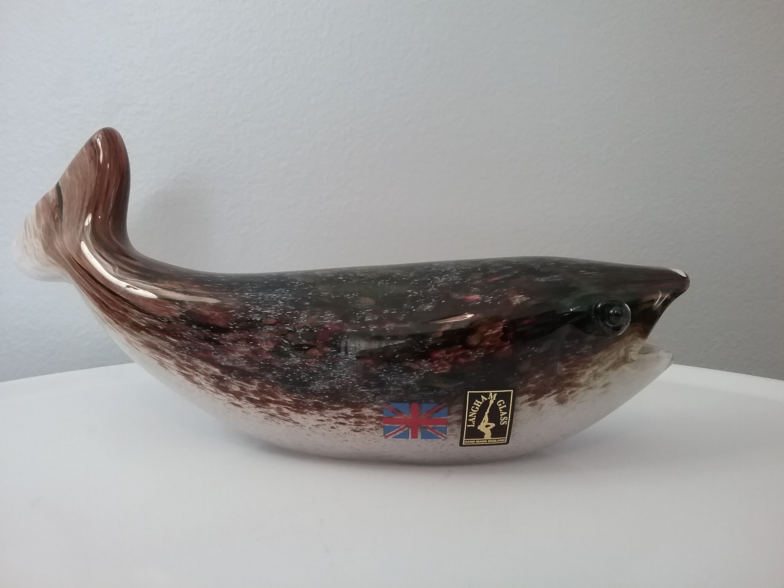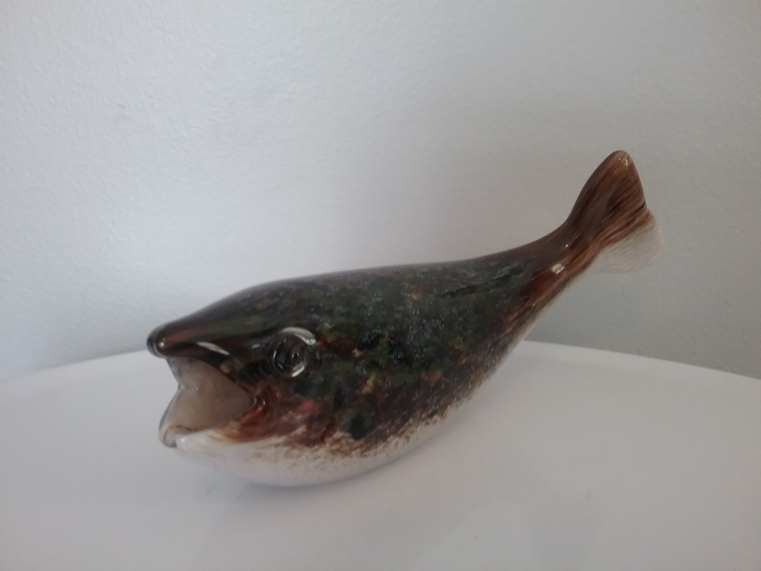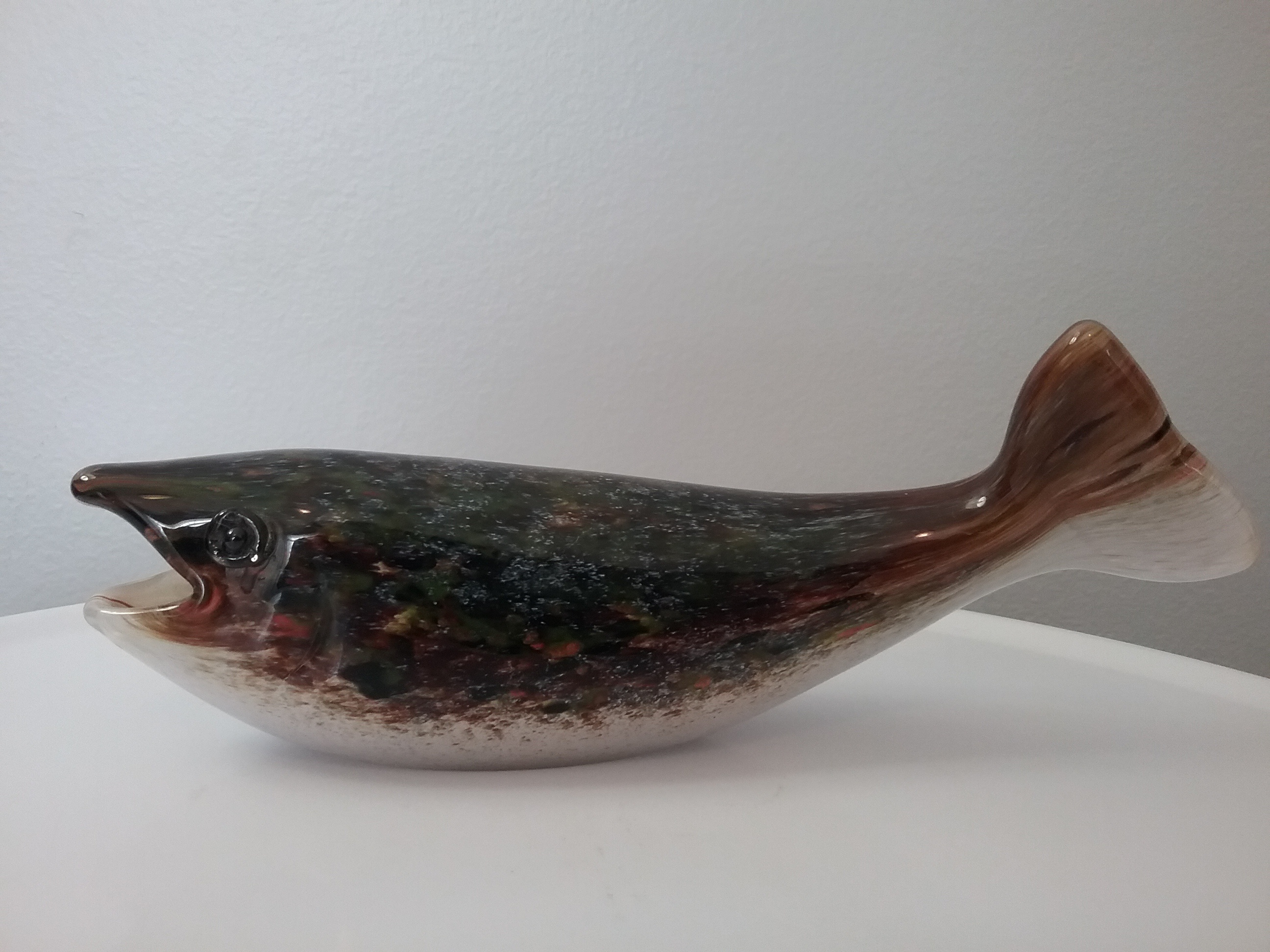 Here is an 8"W speckled brown on white glass swimming trout with two raised black & clear eyes, by Paul Miller for Langham Glass. This fish has two orig labels, etch signing by Paul Miller on bottom and orig box, ca 1990s