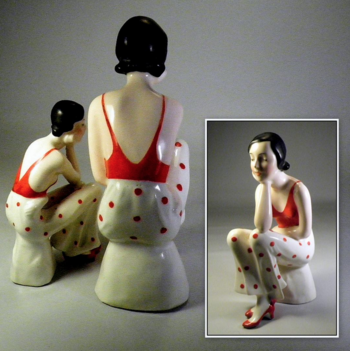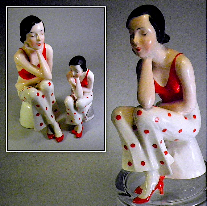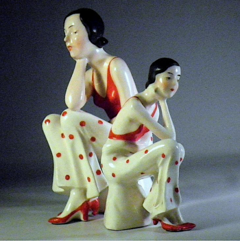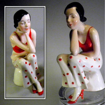 A pleasant departure from the swooping gowns and scarves of Deco porcelain dancers, is this Busby Berkeley type gal. She stands, I mean sits at 6". I discovered her mini-me a few years later. Both are stamped ERPHILA Germany. All the detailing is cold hand painted.