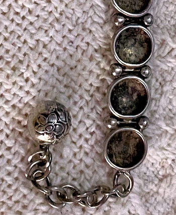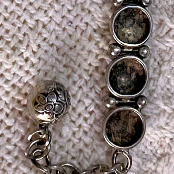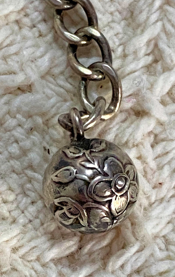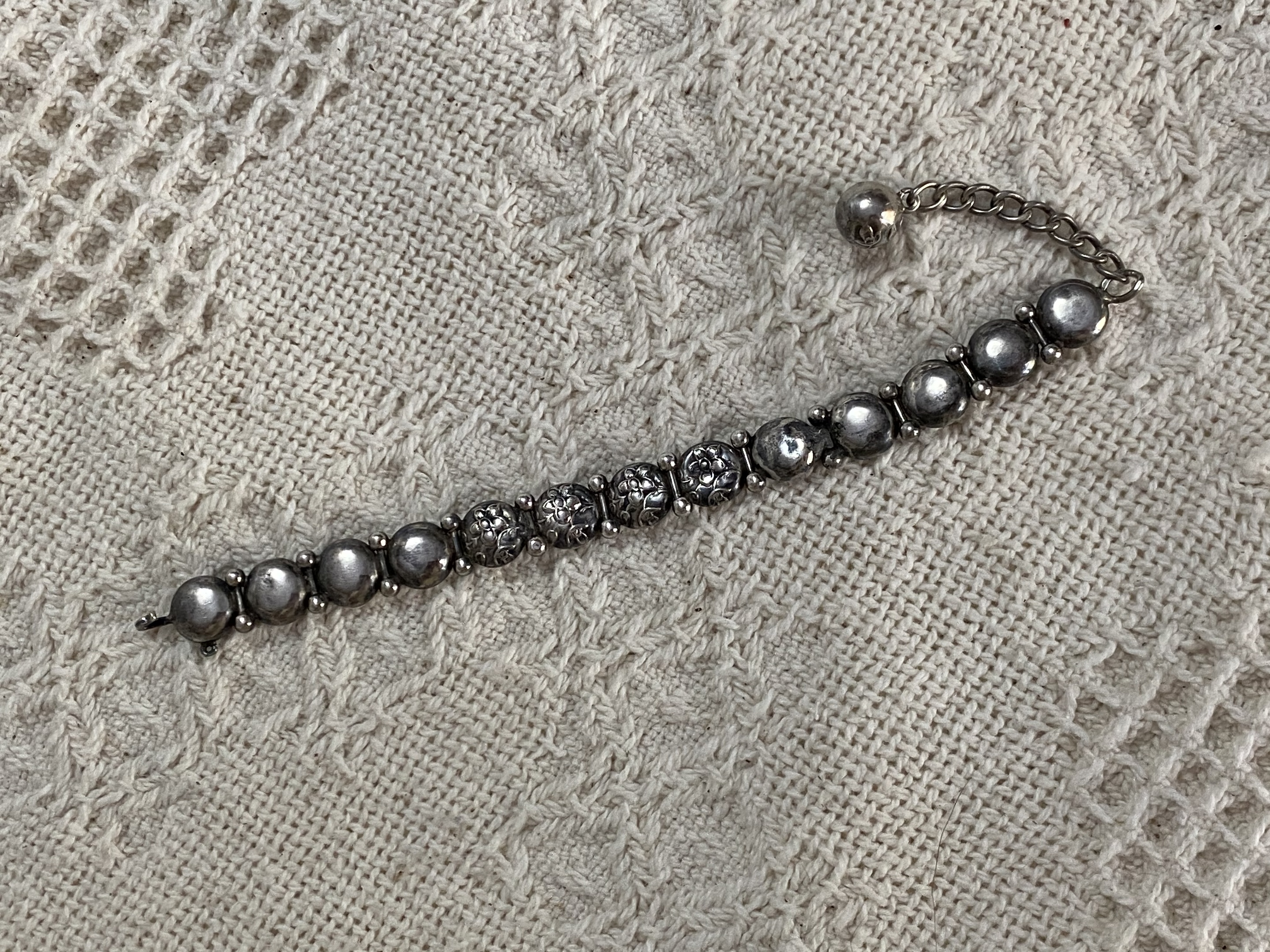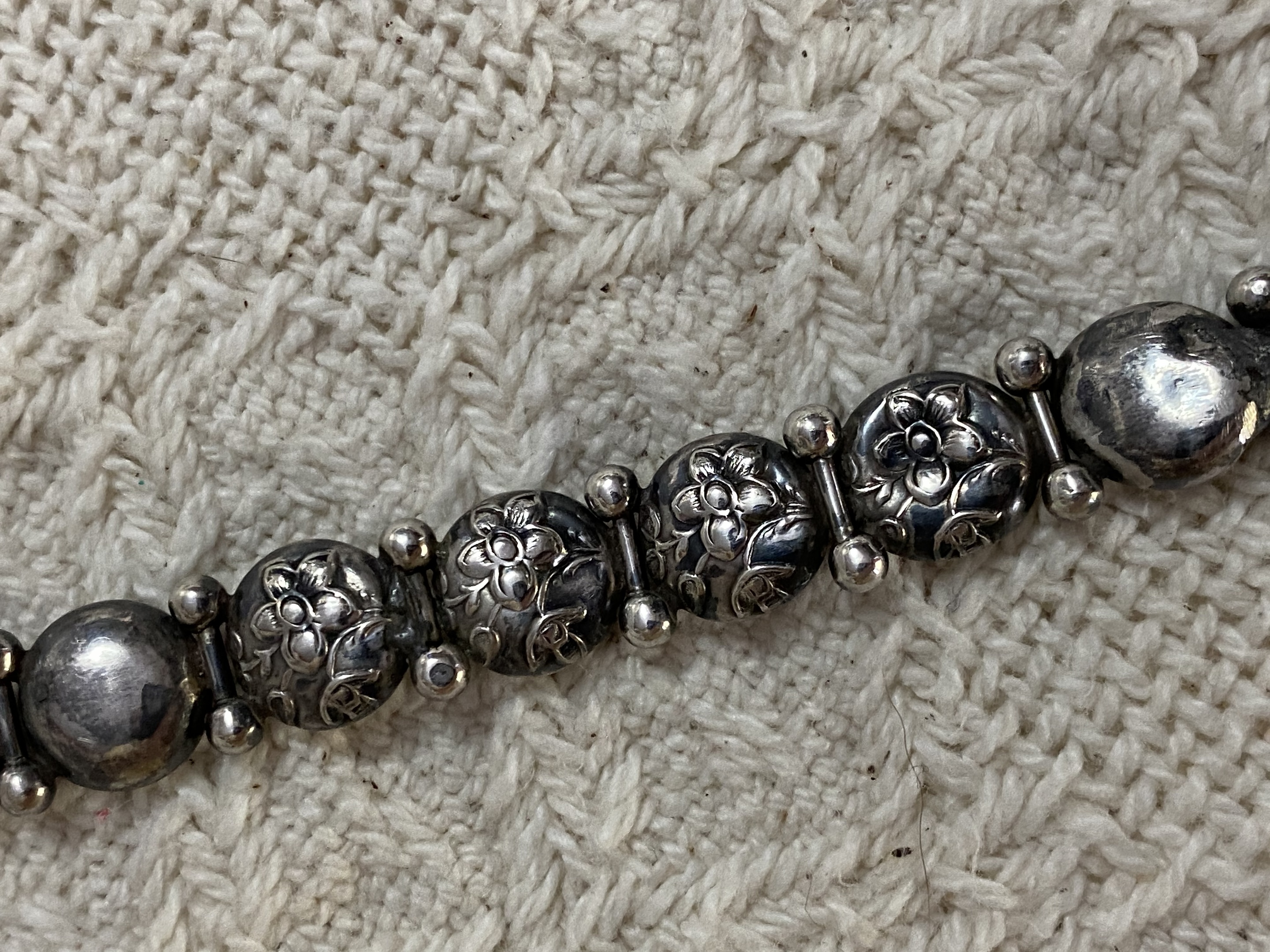 I have been waiting years for the internet to help me determine if this perfectly old bracelet is vintage or Victorian. It is not marked silver but is tarnished like silver on the backs of the links. There has been one repair with a different kind of link fix. This has several floral buttons book-ended by plain buttons. The link connectors are decorated with little silver balls. The closure chain has a complete silver floral ball. I can find no marks and nothing similar in research. Your help and expertise are appreciated.
