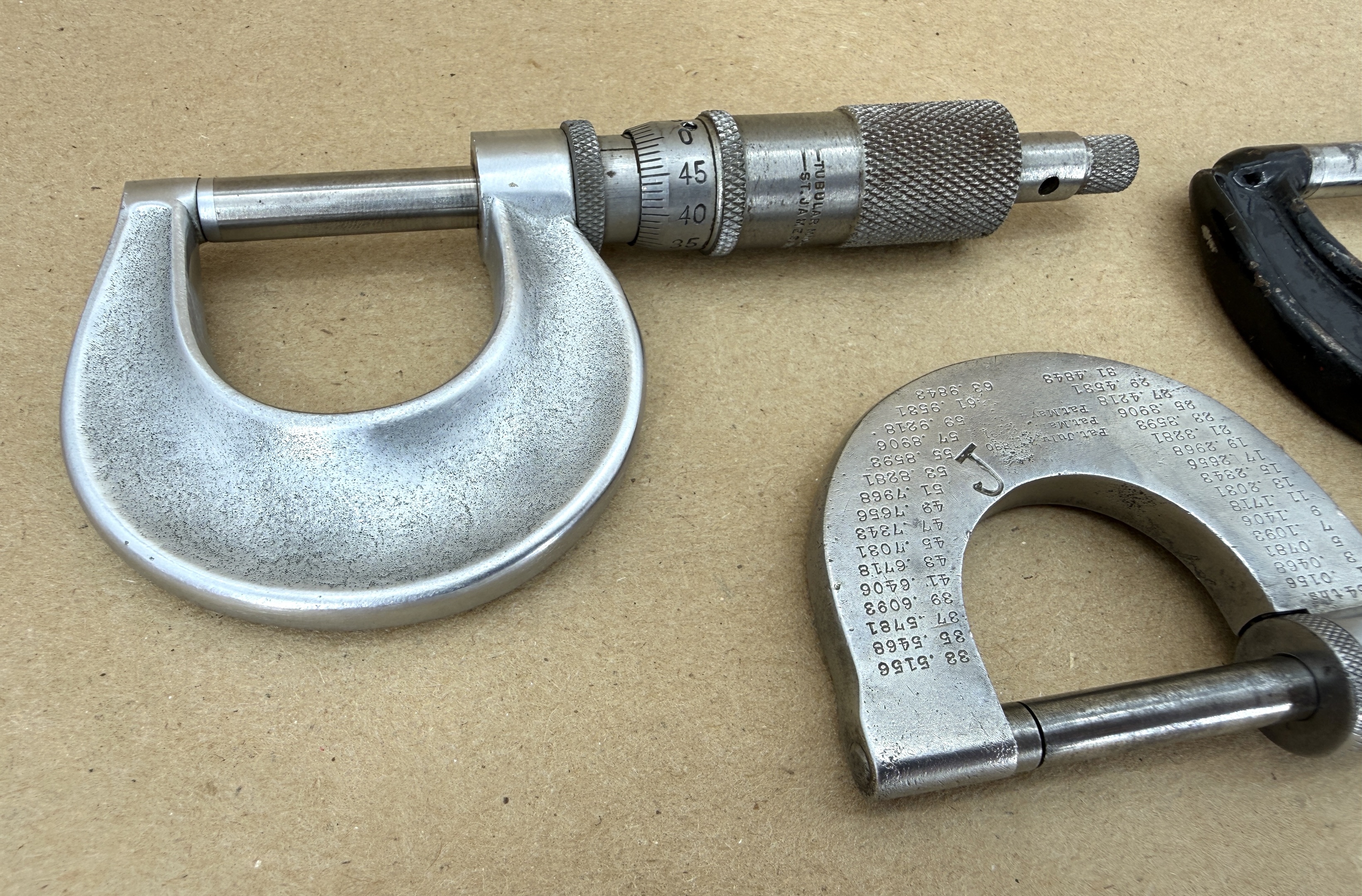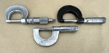 Three 0-1” micrometers from Tubular Micrometer Co./Tumico (No. T-1, ca. 1950s); J.T. Slocomb Co. (No. 25, ca. 1937); and L.S. Starrett Co. (No. 3. ca. 1895-1927).