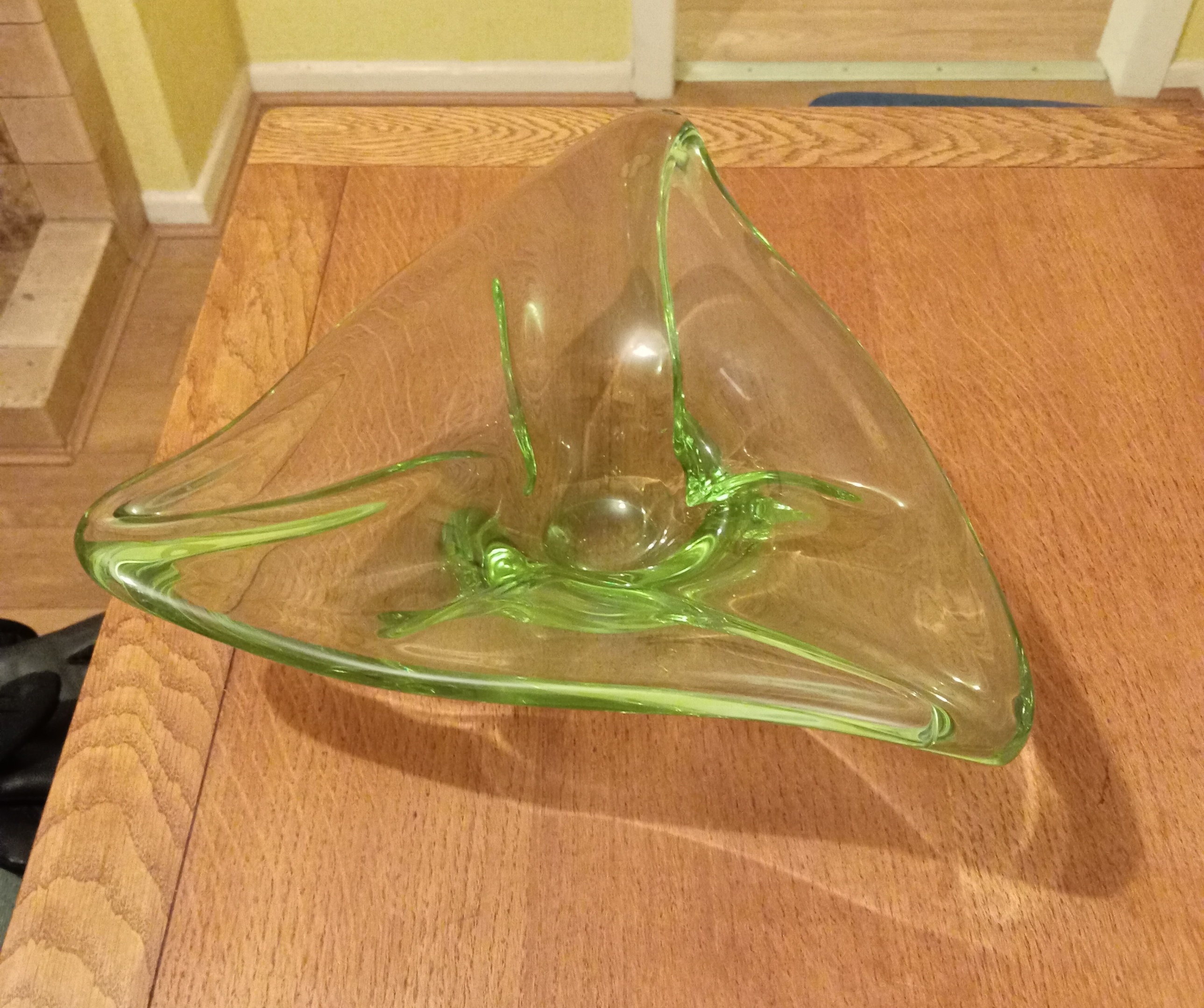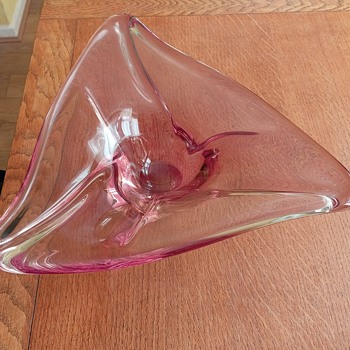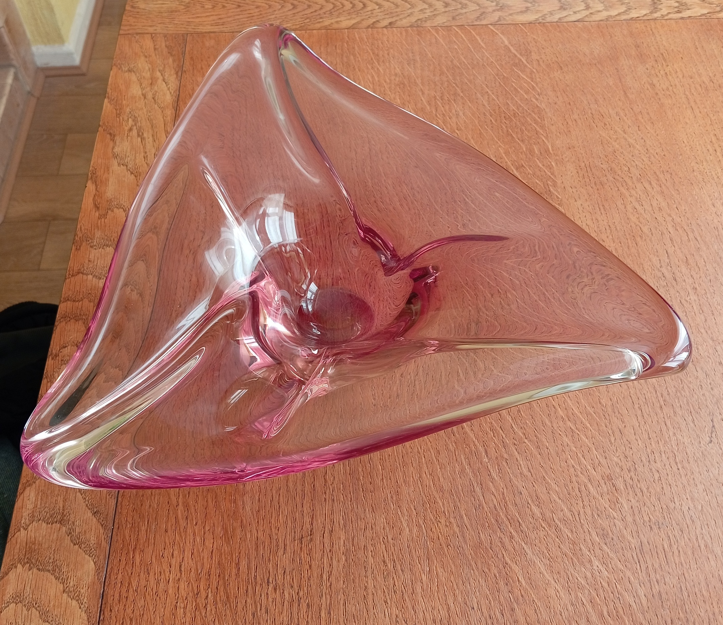 This large bowl has the Sèvres France mark. Amazingly in daylight it is a deep pink colour but under fluorescent light it changes to bright green. A search has discovered Didymium glass, containing a mixture of Praseodymium and Neodymium giving it its dichroic properties. It probably dates from the 1960's-70's.
