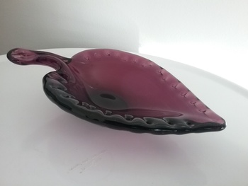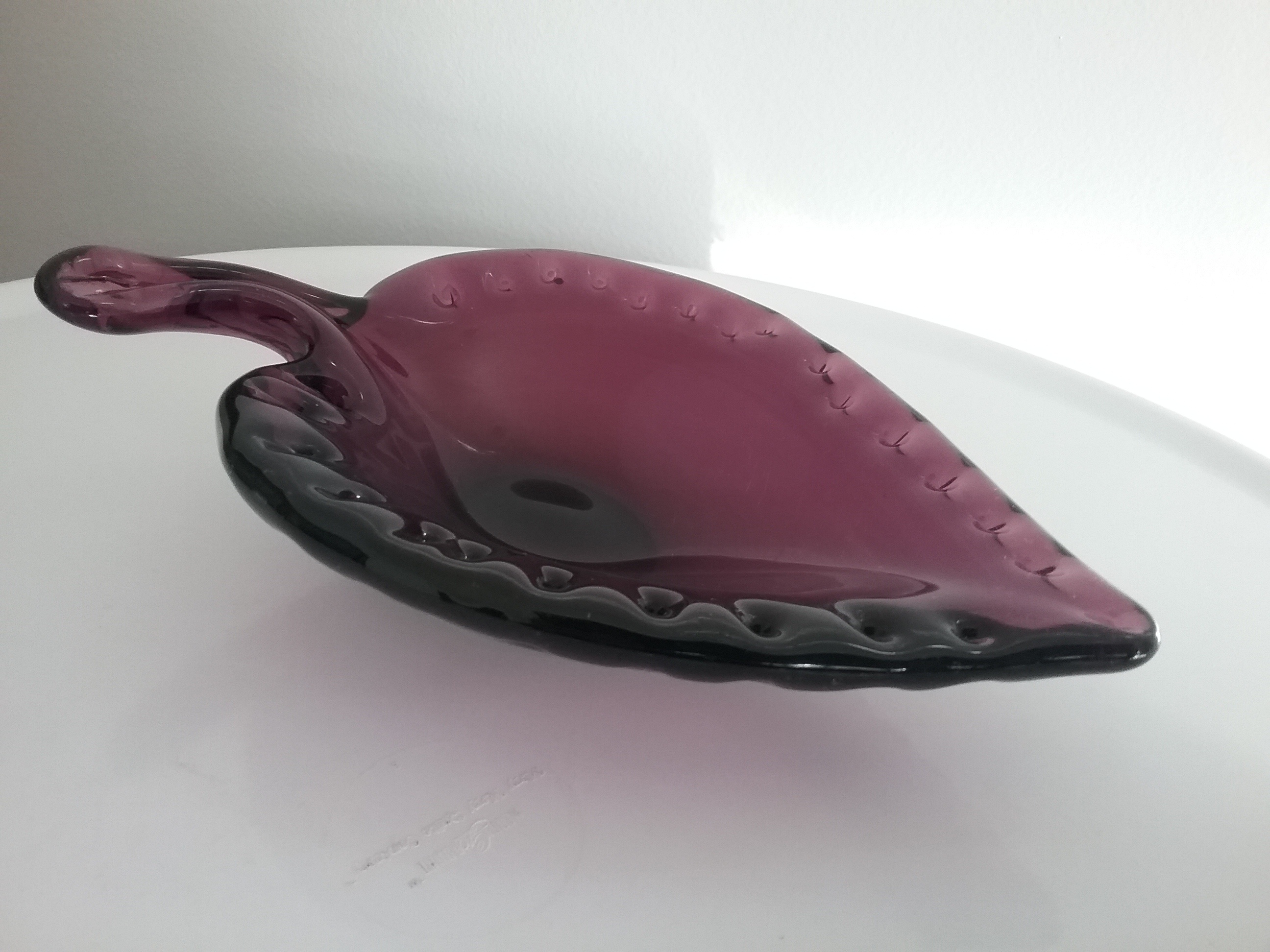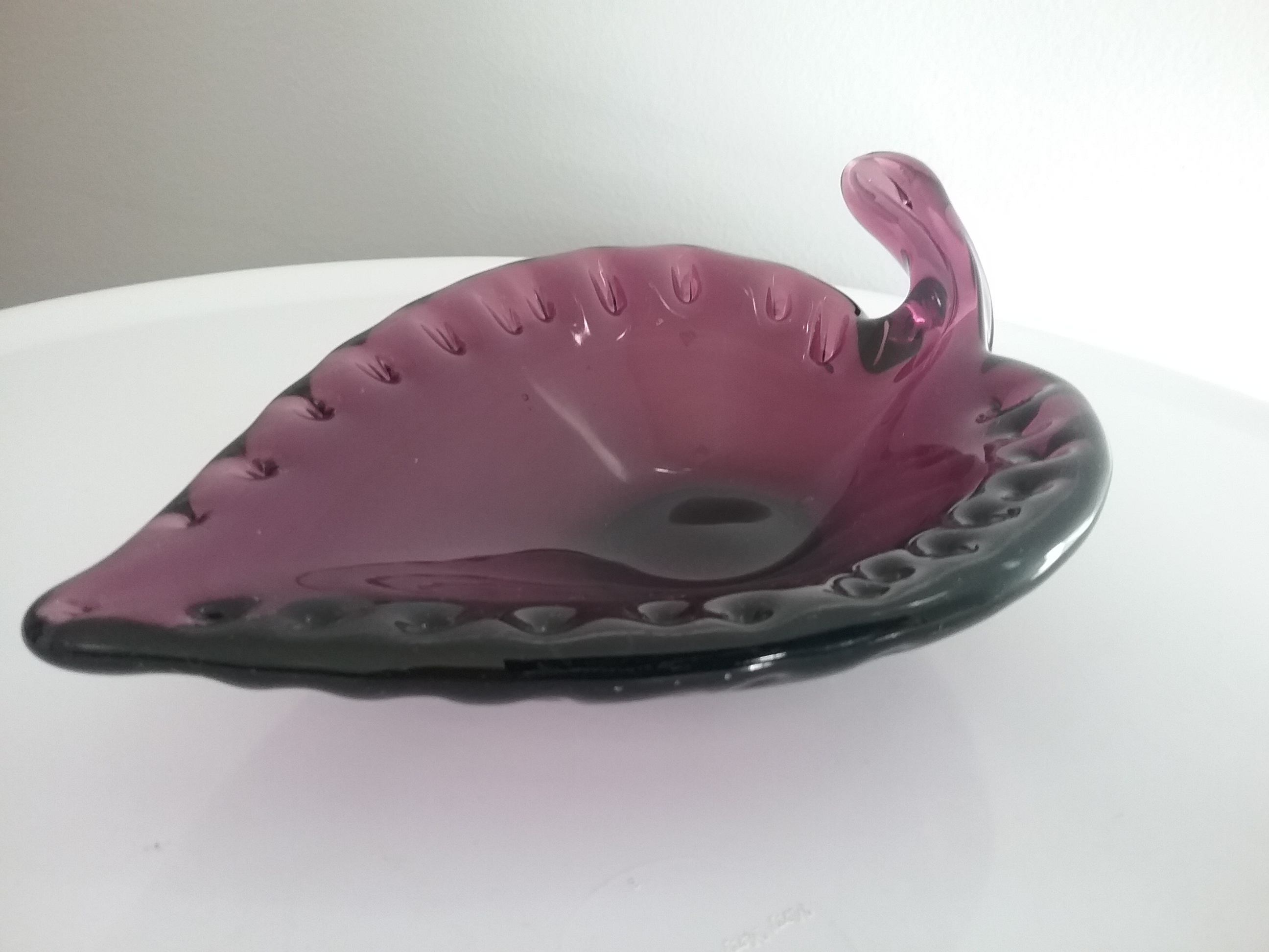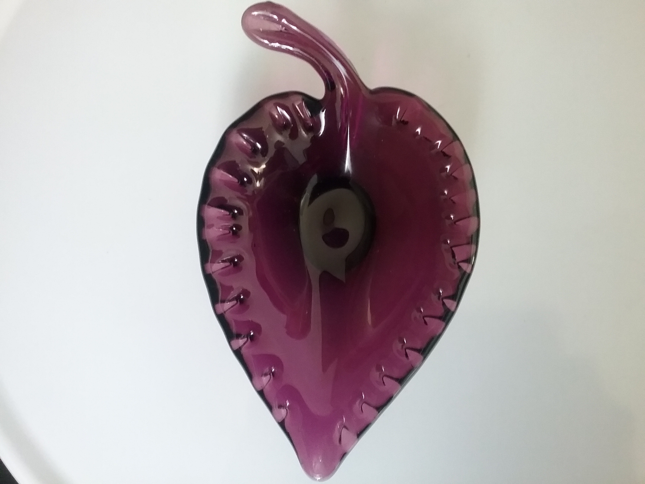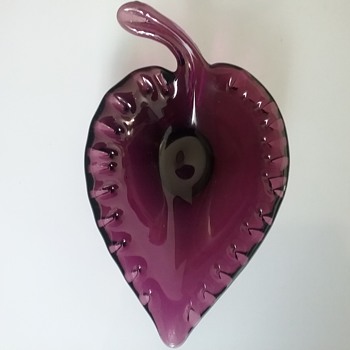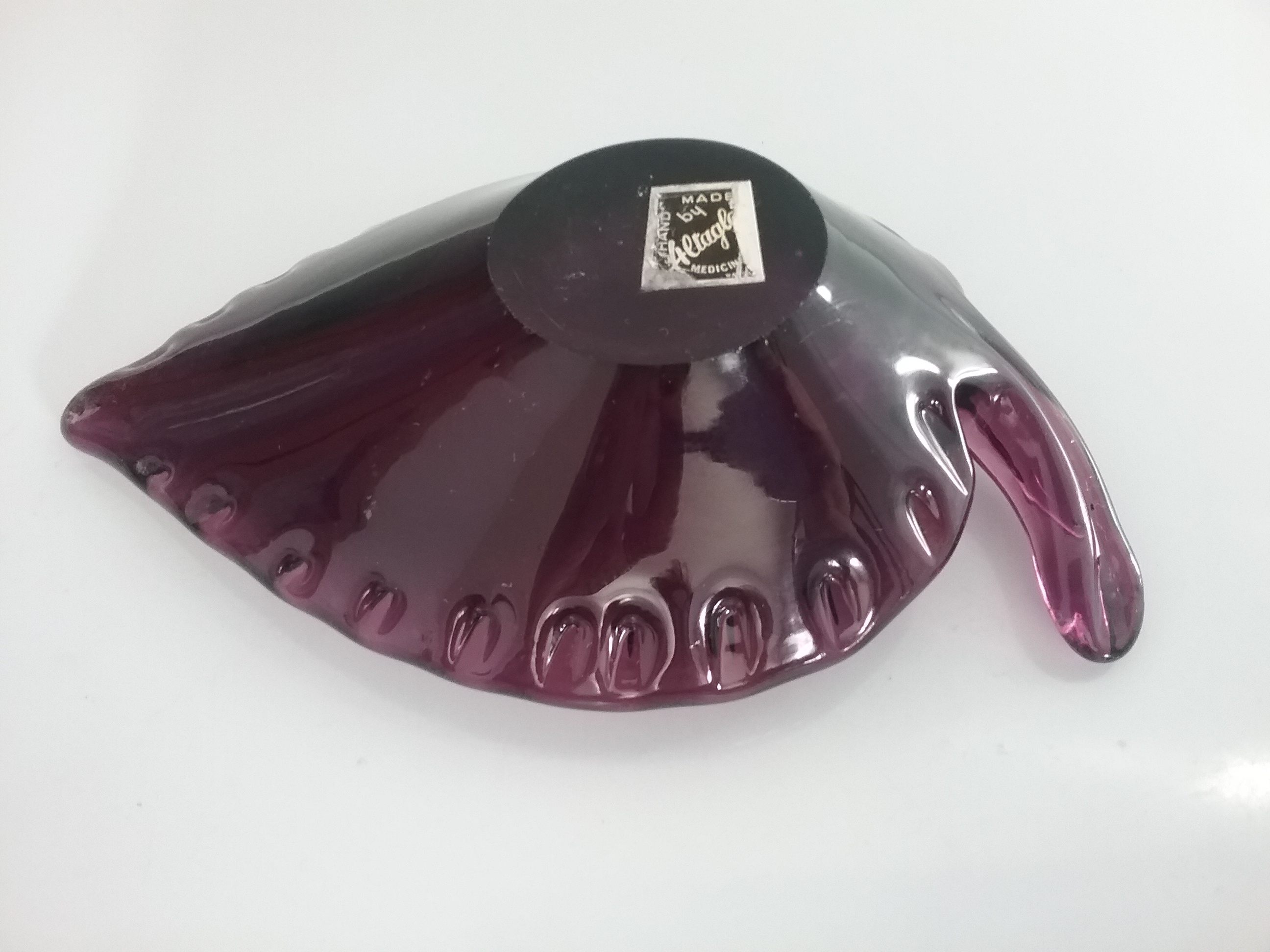 Here is a 7"H rich purple glass heart shape leaf candy dish with stem & serrated type edges, from Altaglass of Medicine Hat, Alberta, Canada. Original black & gold label on the bottom, ca 1970s