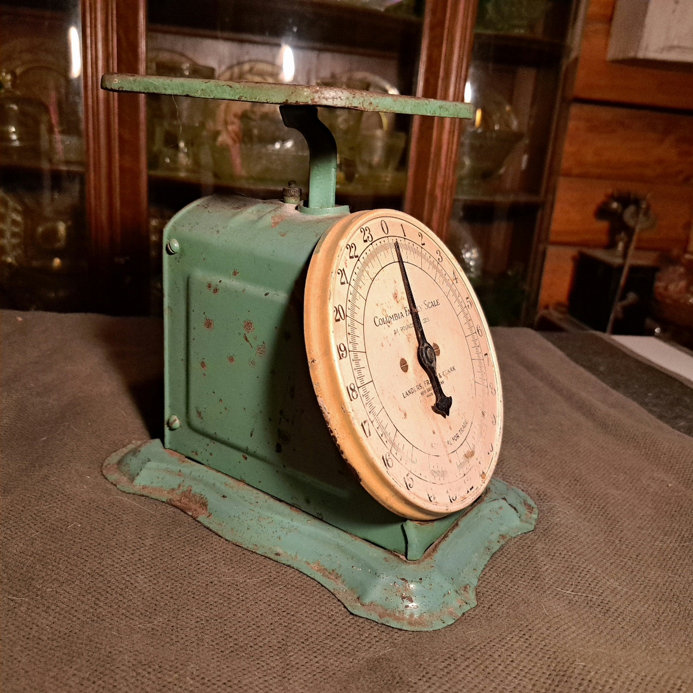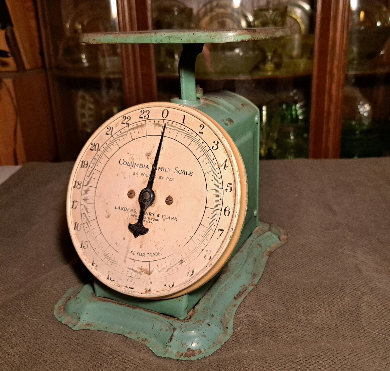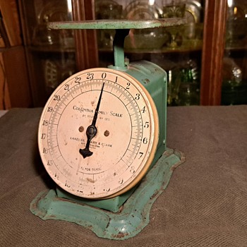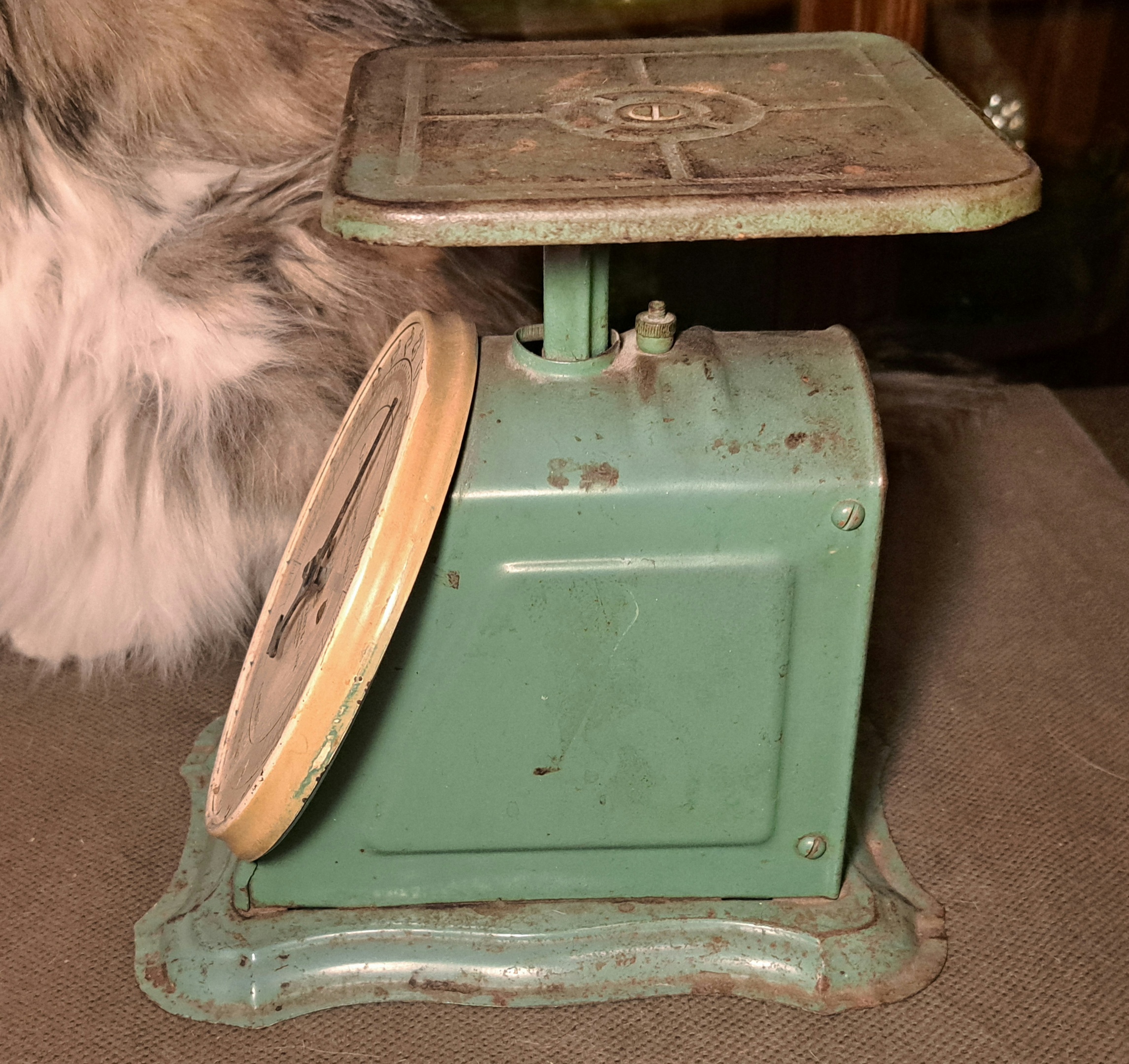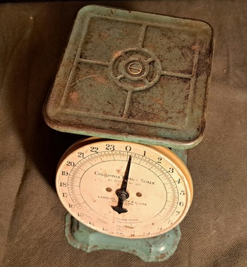 This is my third family scale but this one is green! I can never find any information on these on objects like these with old companies long out of business. But I am thinking this could be an actual antique. It doesn't have the art deco look of the 40s. Anyway here it is in its seafoam green glory.